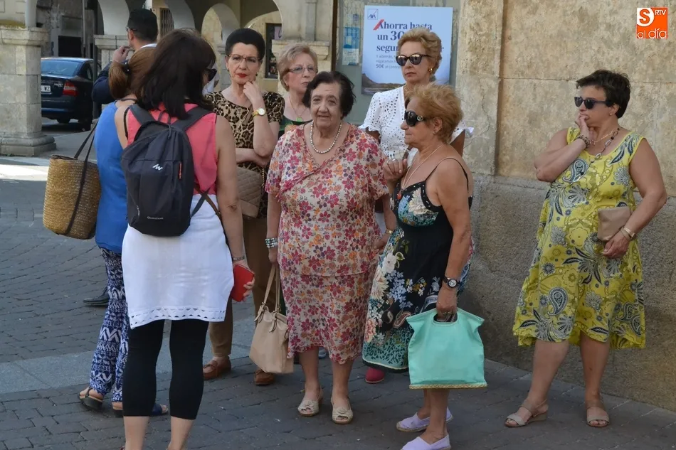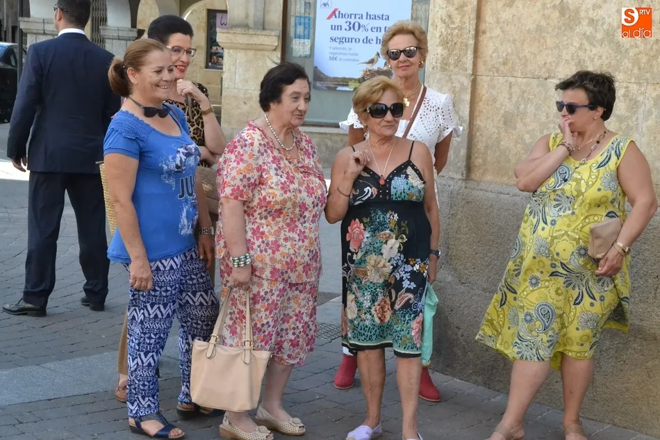 En todo caso, los mirobrigenses congregados de forma expresa para ver el ambiente y los que se fueron parando a ver qué ocurría (como camareros de establecimientos cercanos o jóvenes que iban camino al Barrio Nuevo) pudieron seguir la llegada de los invitados, y especialmente de los novios: Teresa Sánchez Galán y Enrique Moral Urra.