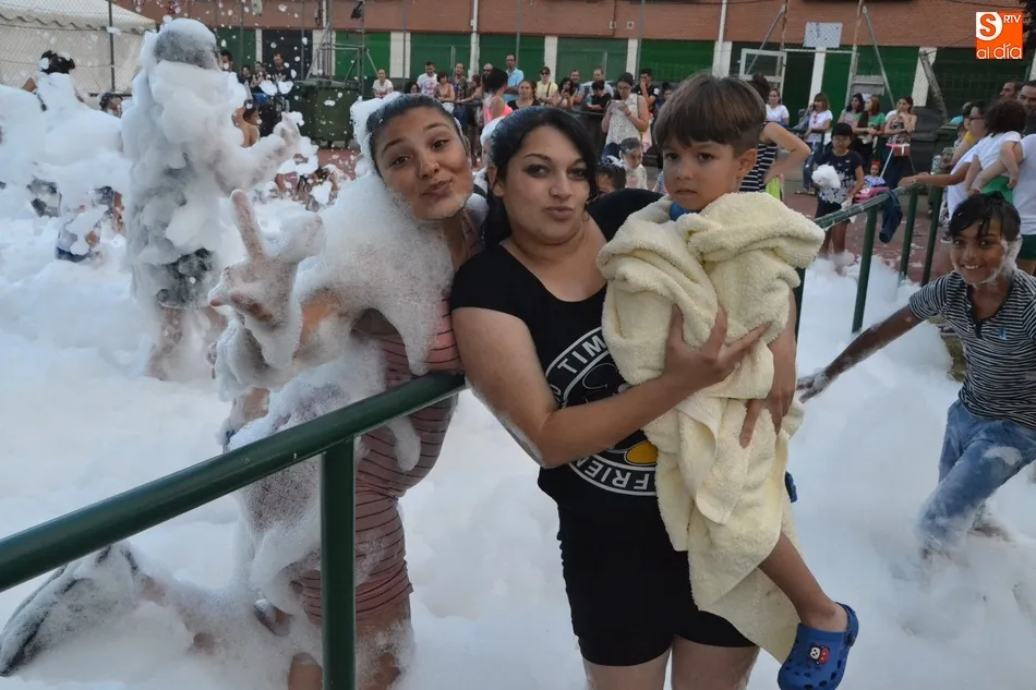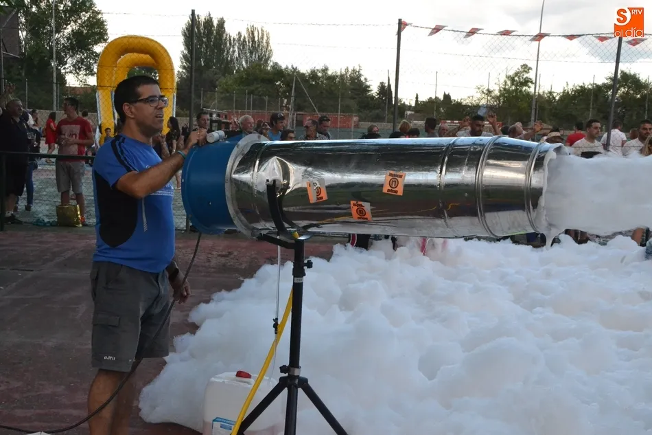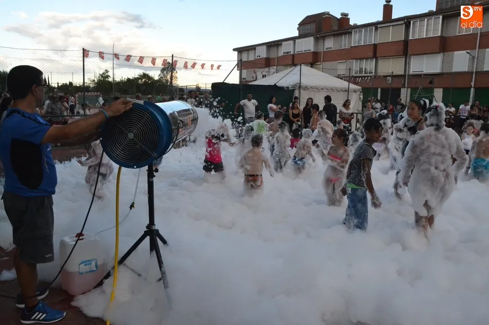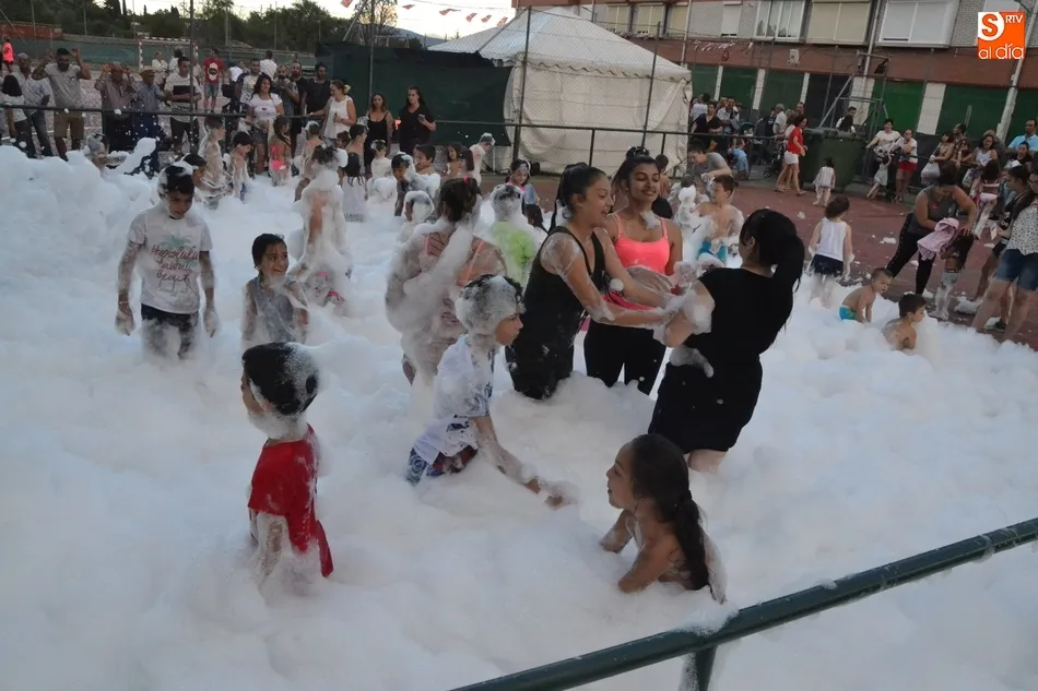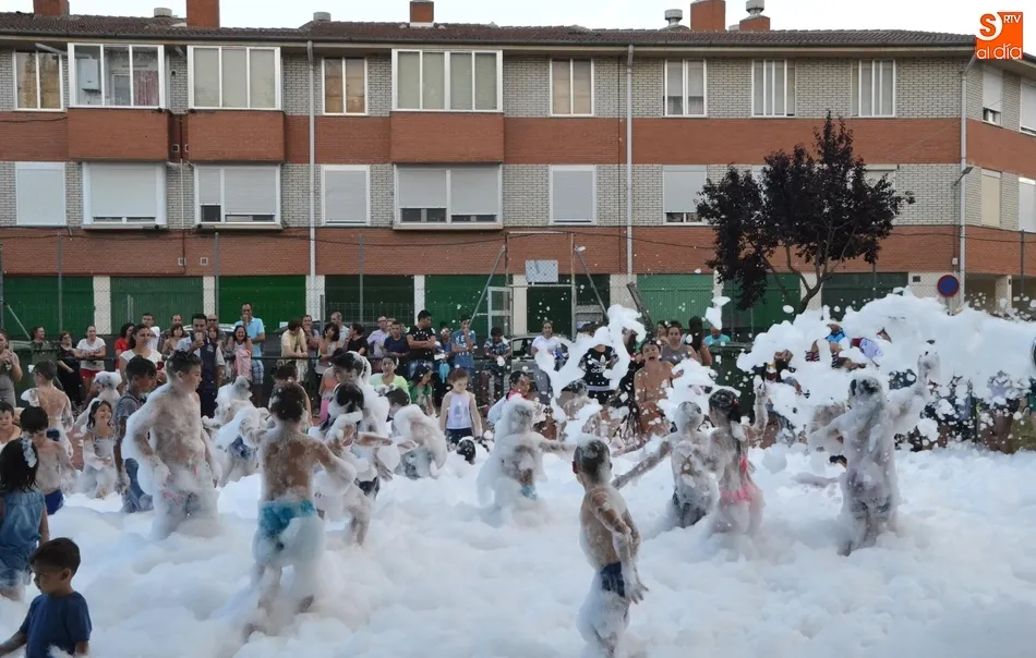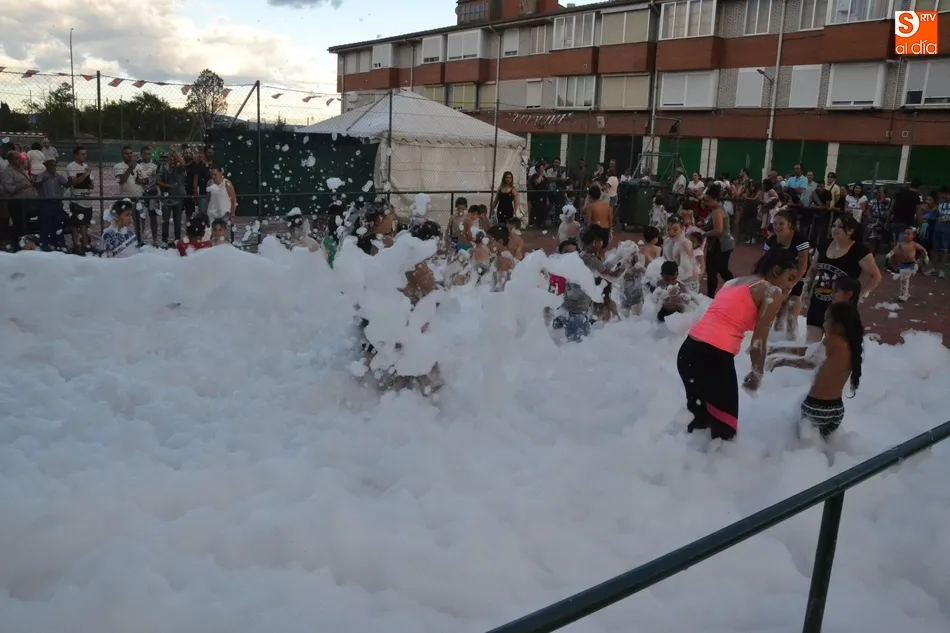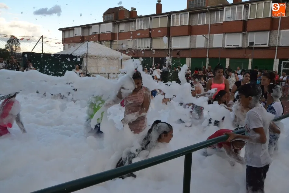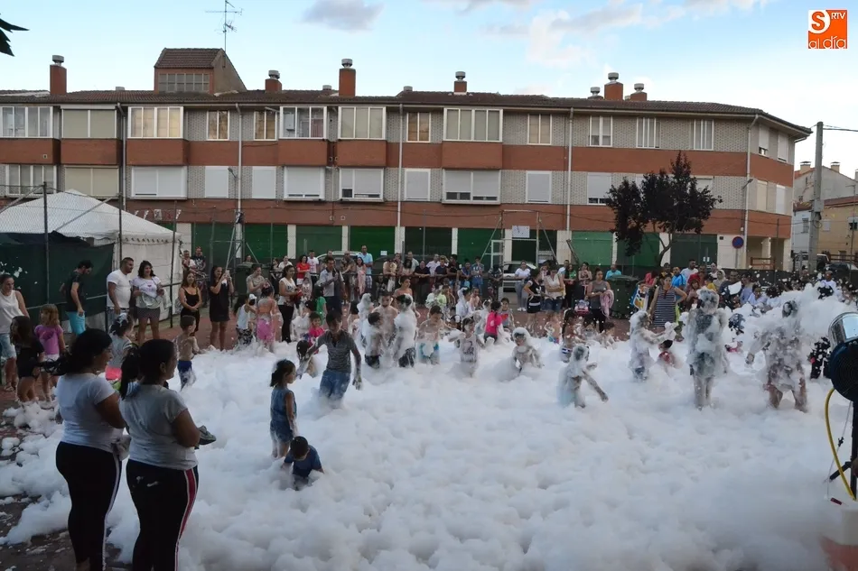 Por otro lado, en la vecina pista para el patinaje se organizó una fiesta de la espuma, donde además de los niños (supervisados por sus progenitores desde la barra) también se metieron algunos jóvenes. Como complemento, otros chavales disfrutaron incluso con un carretón, aprovechando las agujas todavía instaladas en las calles del barrio como refugio.