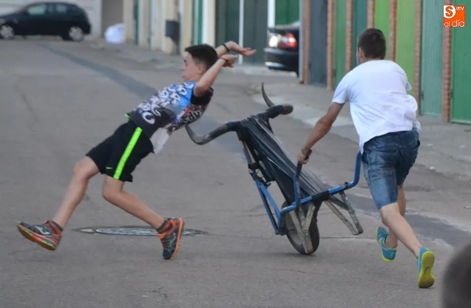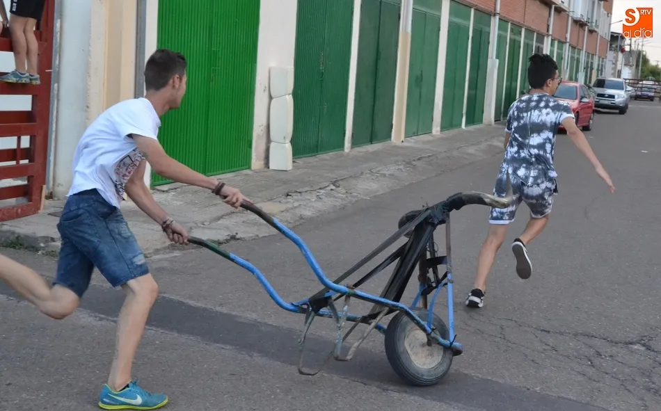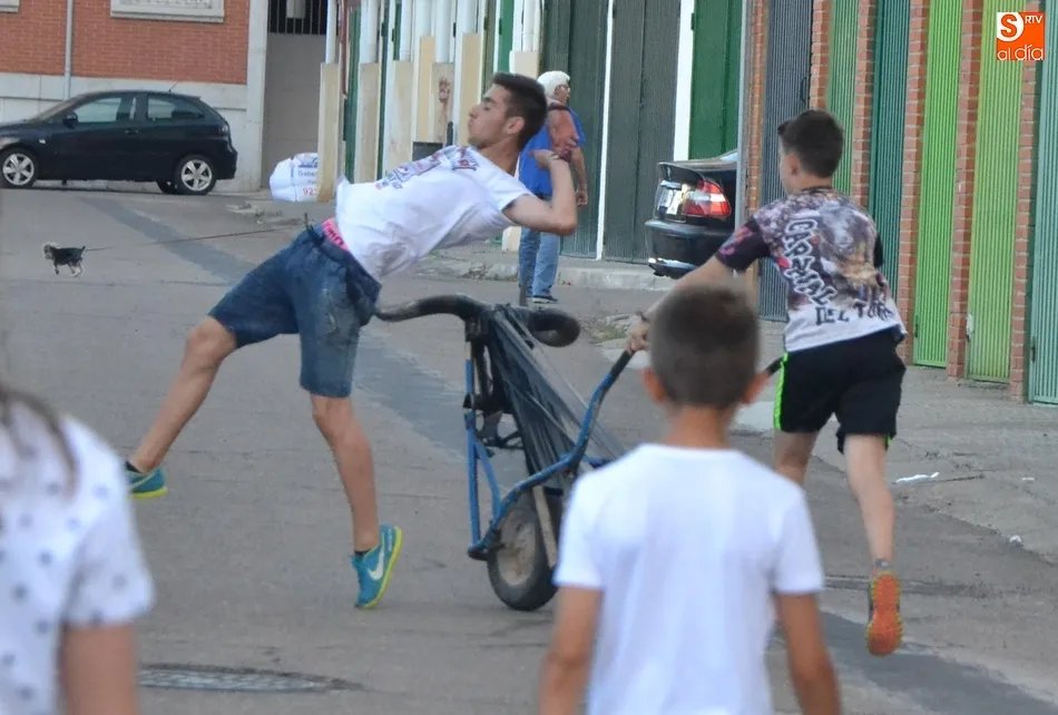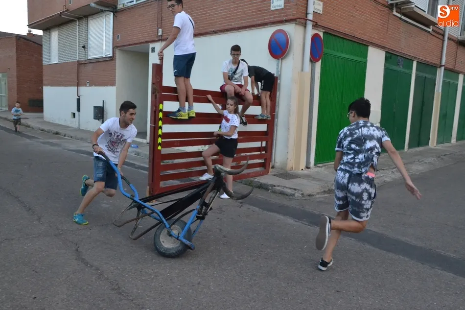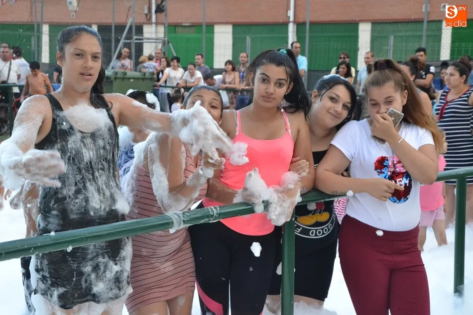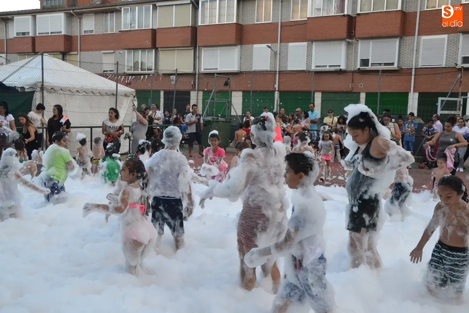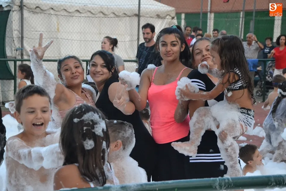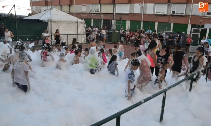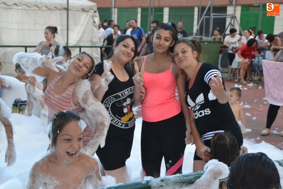 Por otro lado, en la vecina pista para el patinaje se organizó una fiesta de la espuma, donde además de los niños (supervisados por sus progenitores desde la barra) también se metieron algunos jóvenes. Como complemento, otros chavales disfrutaron incluso con un carretón, aprovechando las agujas todavía instaladas en las calles del barrio como refugio.
