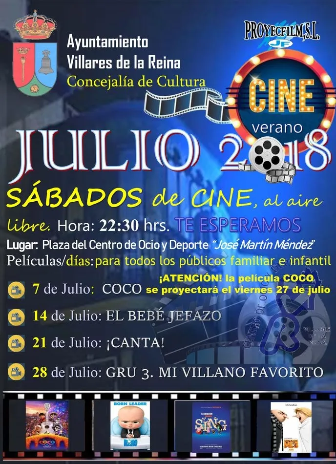 Villares de la Reina inició este fin de semana la programación de verano organizada por la Concejalía de Cultura para este mes de julio bajo el título ?Sábados de cine al aire libre?, ya que el pasado 7 de julio la lluvia hizo que se suspendiera la primera proyección prevista con la película ?Coco?, para la que se ha buscado otra fecha disponible que pueda ser disfrutada por el mayor número posible de vecinos.