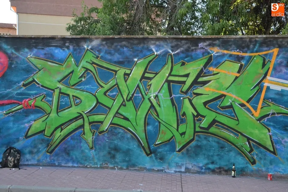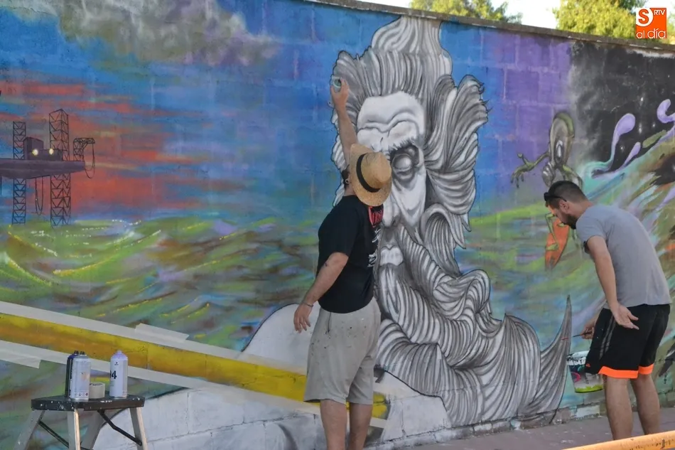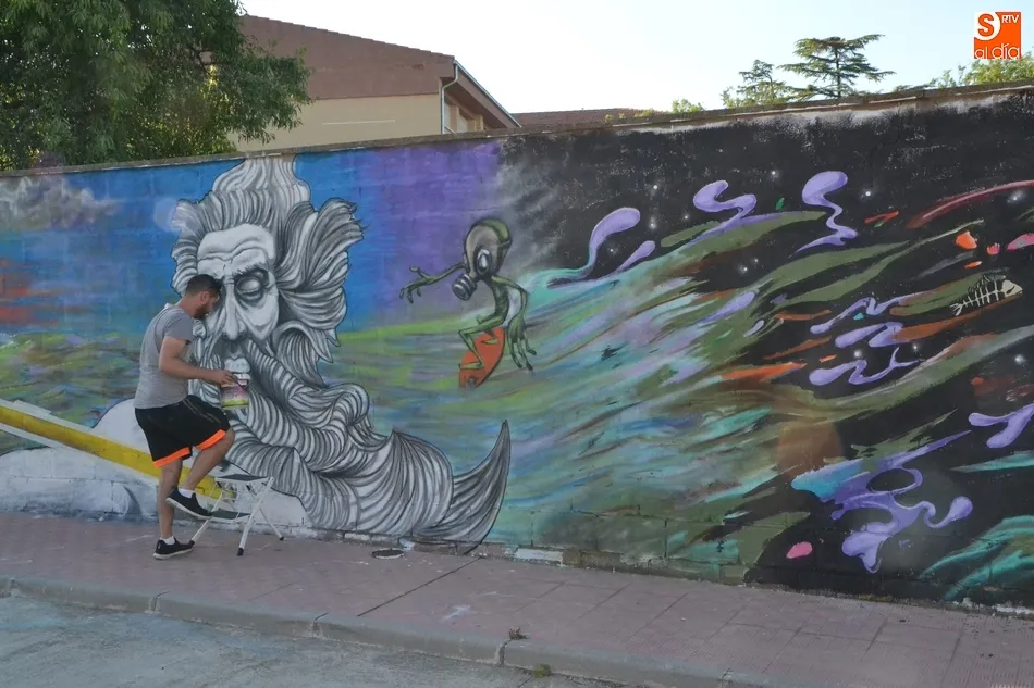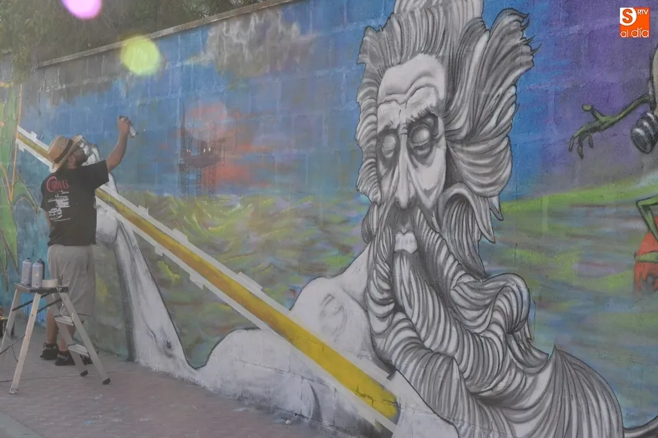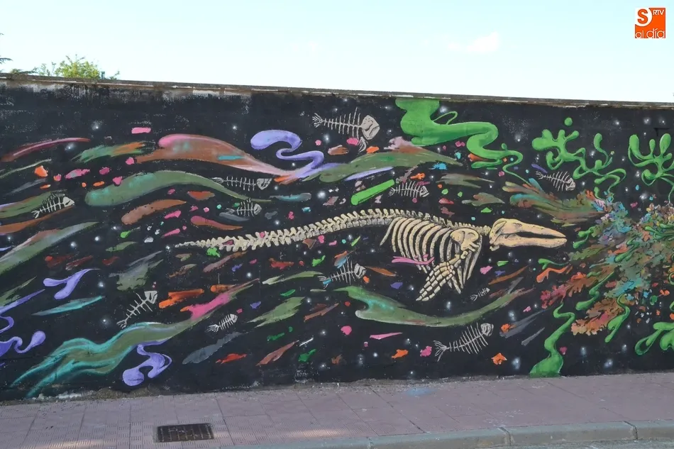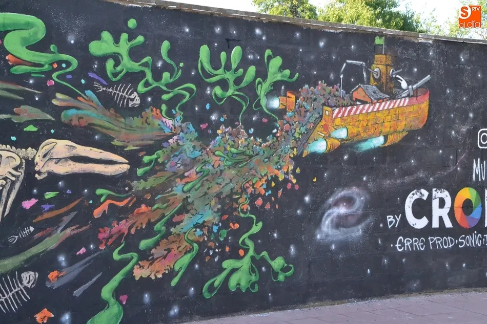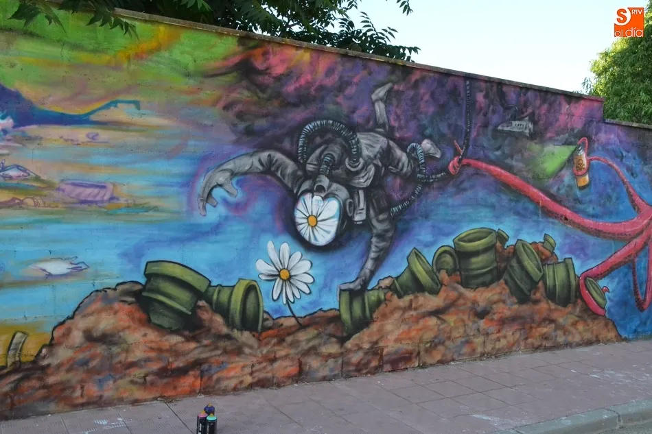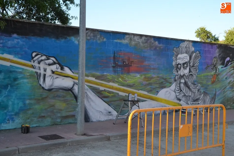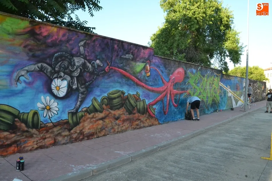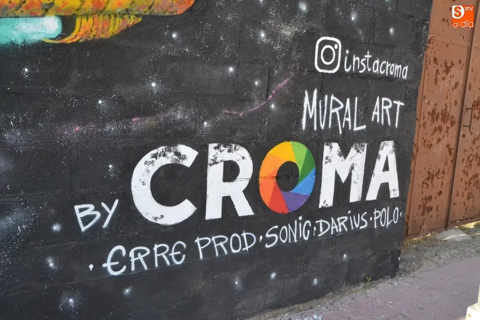 La Asociación Juvenil CROMA de Ciudad Rodrigo completó a última hora de la tarde del miércoles el gigantesco mural que han creado en los últimos días en la calle Caridad, en el barrio de San Pelayo.