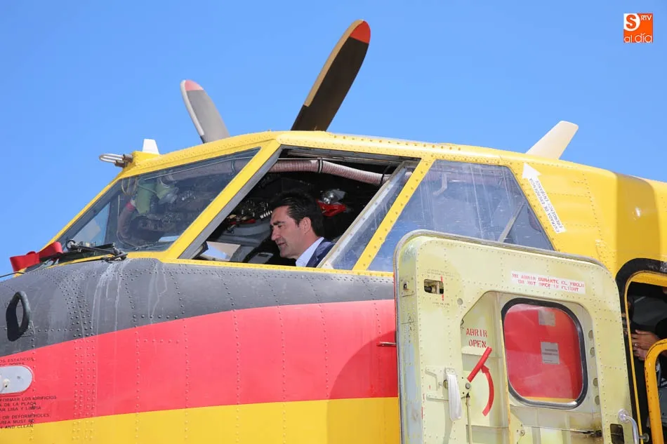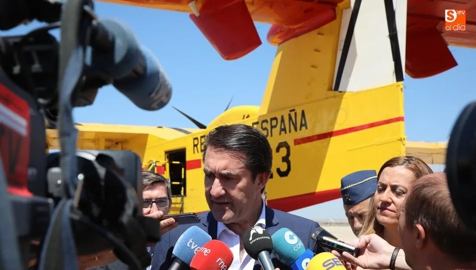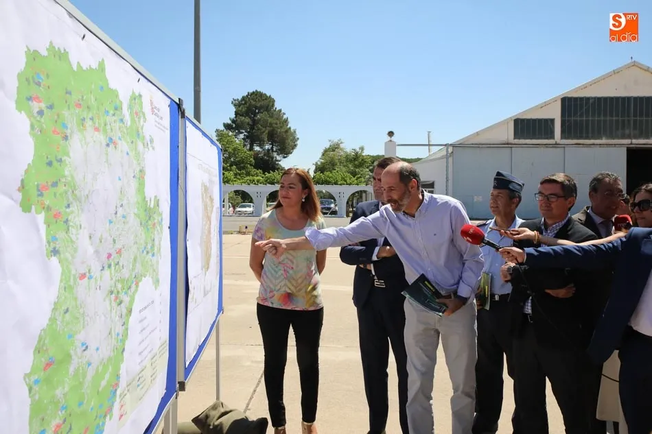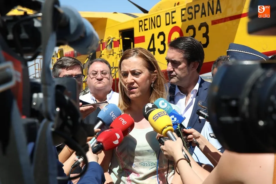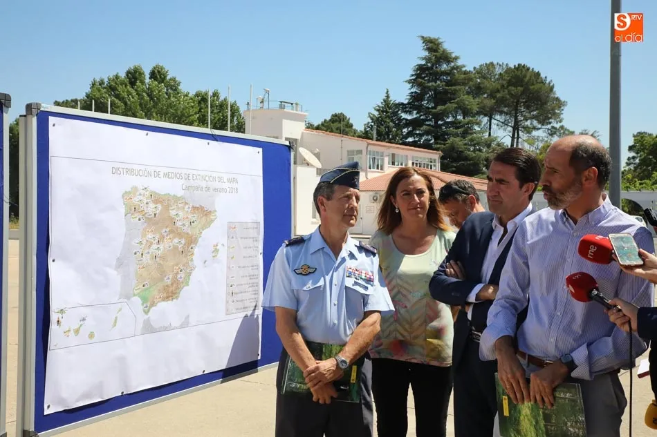 El consejero de Medio Ambiente, Juan Carlos Suárez-Quiñones, y la delegada del Gobierno en Castilla y León, Virginia Barcones, han presentado en la base aérea de Matacán los medios que, tanto el Gobierno de España como la Junta, ponen a disposición de la lucha contra los incendios forestales.