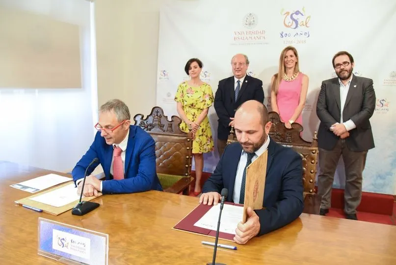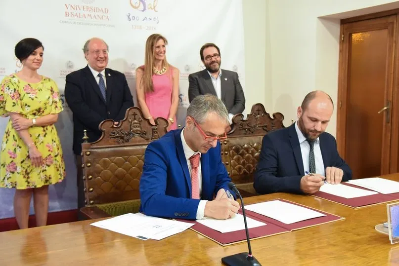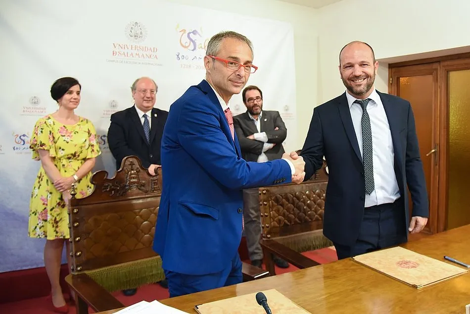 El patrocinio de la carrera del VIII Centenario, que se celebrará el 22 de septiembre, y la cesión de espacios en El Tormes para divulgar las actividades de la Universidad forman parte del convenio de colaboración firmado entre el rector, Ricardo Rivero, y el representante del centro comercial, Pablo Rodríguez.