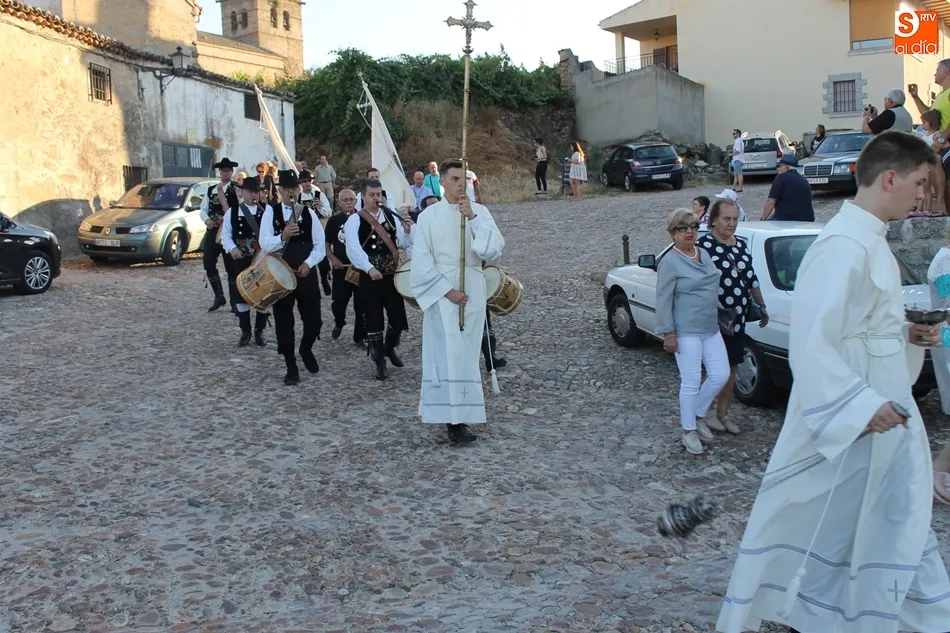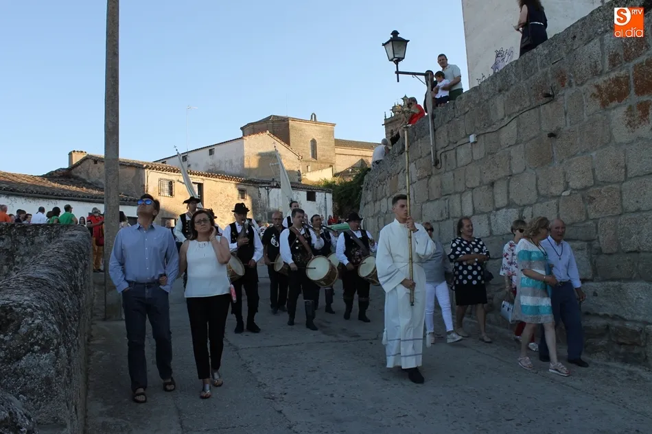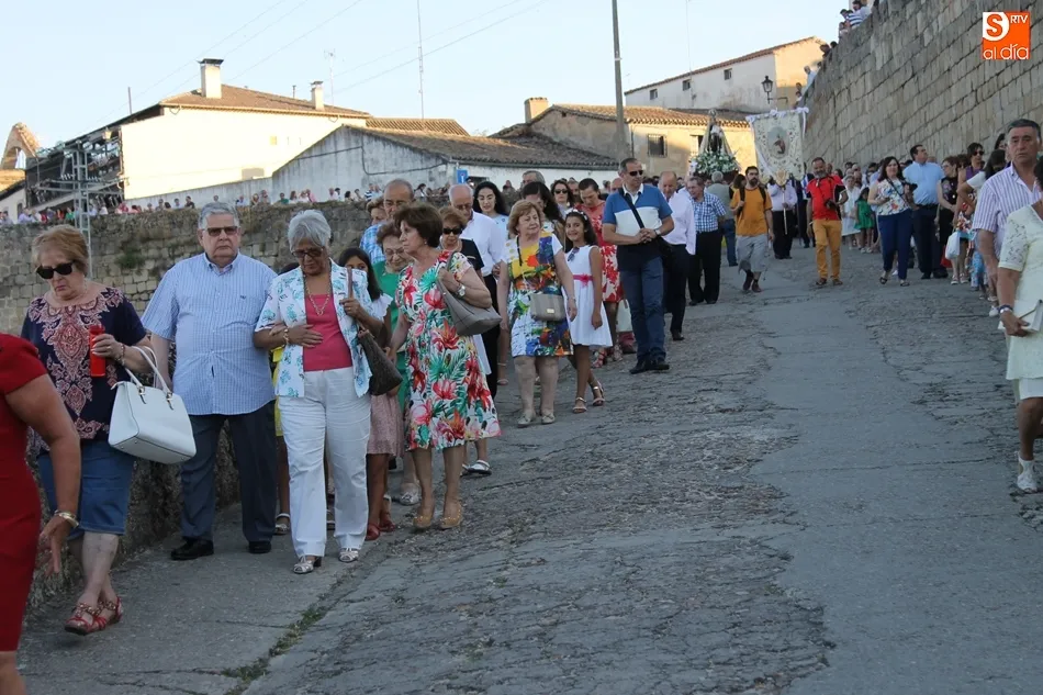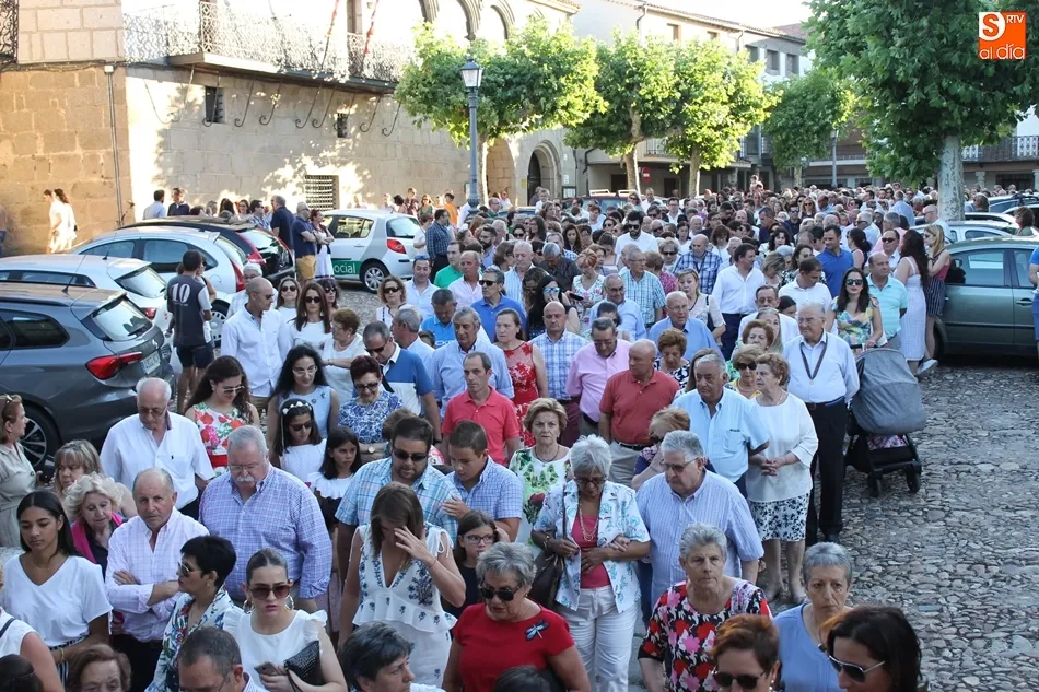Solemne y concurrida bajada en procesión de la Virgen del Carmen, patrona de Ledesma, desde la iglesia de Santa María La Mayor hasta la ermita que lleva su nombre al otro lado del puente viejo. Las puertas del templo se han abierto, tras la celebración del rosario, para dar paso a la imagen de la Virgen del Carmen, precedida por los mayordomos portando las varas y el estandarte.