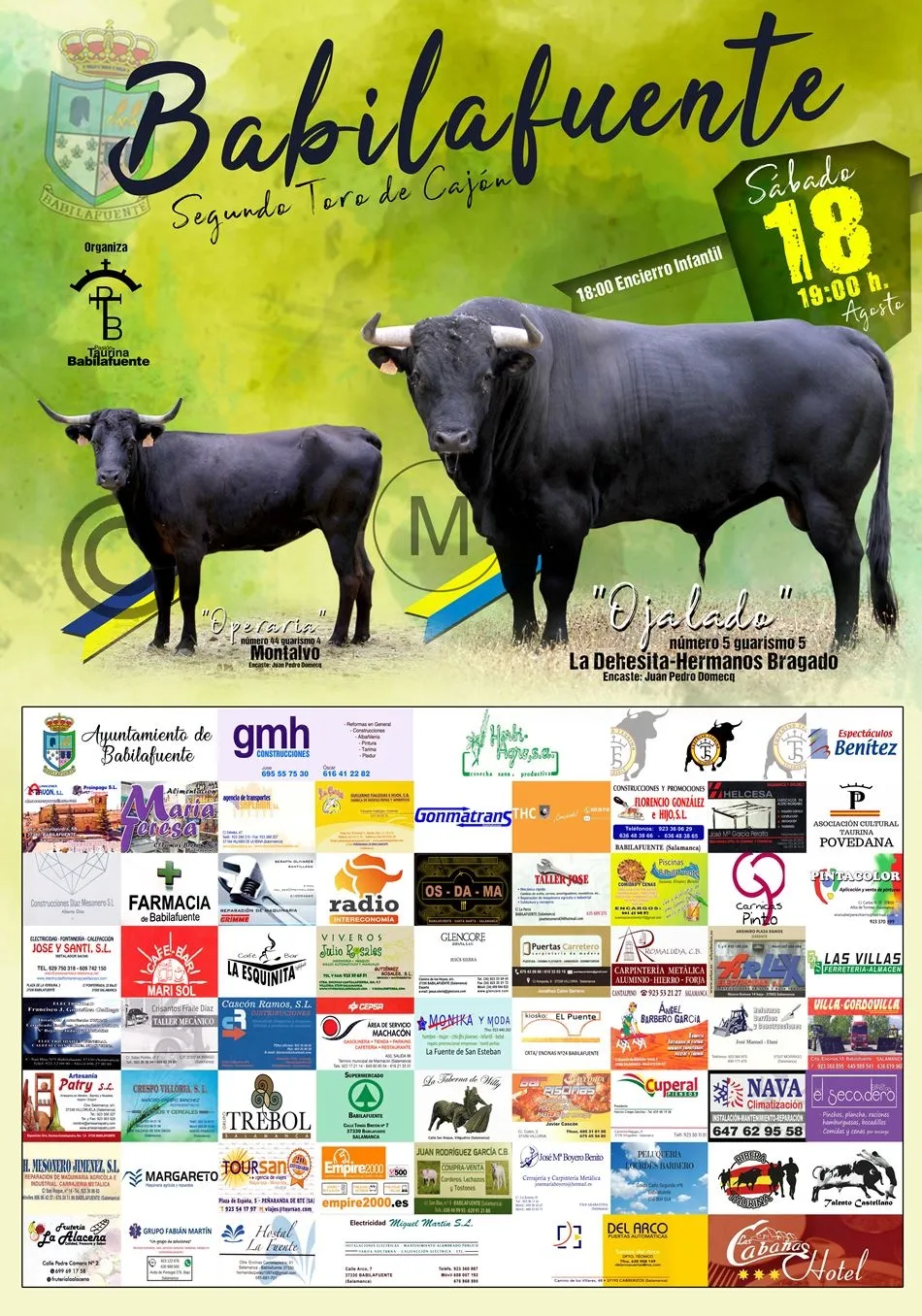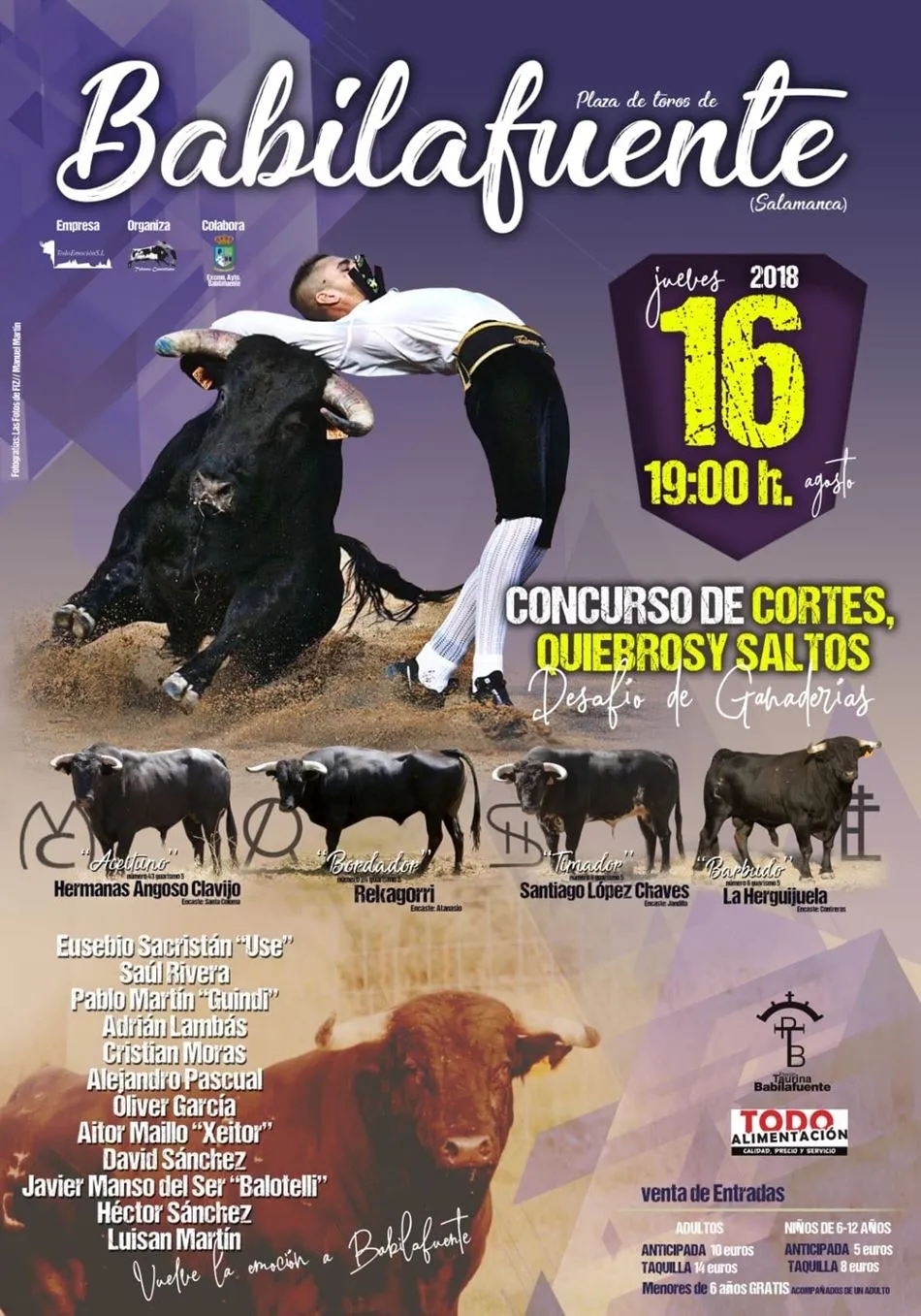 16 y 18 de agosto de 2018. Las dos fechas están marcadas en rojo por los aficionados a los toros de Babilafuente. A las 19 horas del 16 de agosto en la plaza de toros de la localidad tendrá lugar un concurso de cortes, quiebros y saltos, la gran novedad taurina que ofrecerán las fiestas de San Roque. Además, la asociación taurina del pueblo ha organizado para el sábado 18 de agosto su segundo toro de cajón.