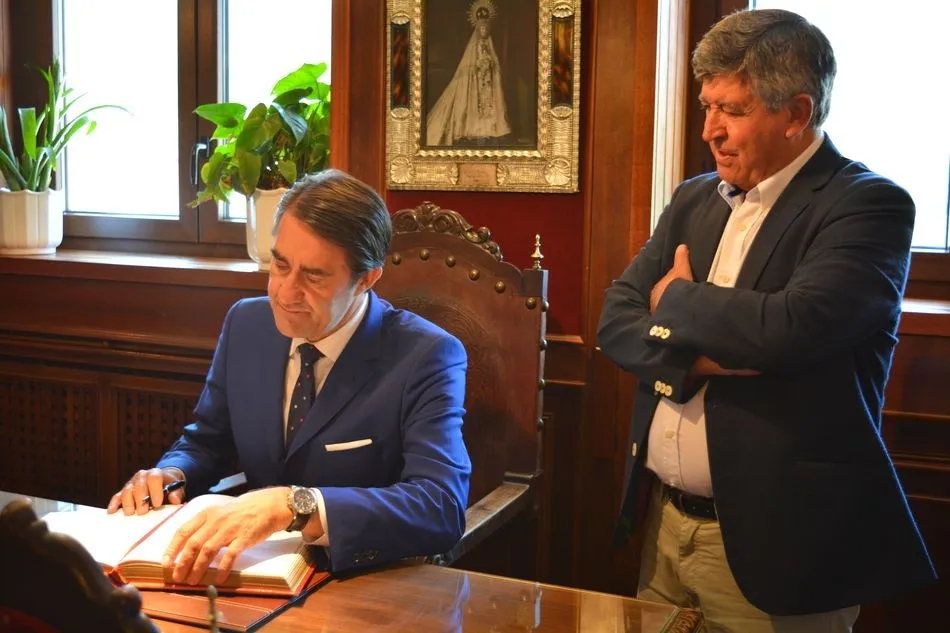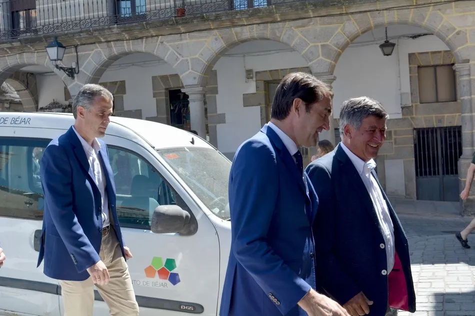 El alcalde Alejo Riñones, ha recibido en la mañana de hoy al consejero de Fomento y Medio Ambiente de la Junta de Castilla y León, Juan Carlos Suárez- Quiñones, que ha estado en Béjar para visitar las obras de acondicionamiento de la fachada de las 16 viviendas de promoción pública de la Plaza de los Aires, financiadas por la Administración Autonómica con 160.851 euros.