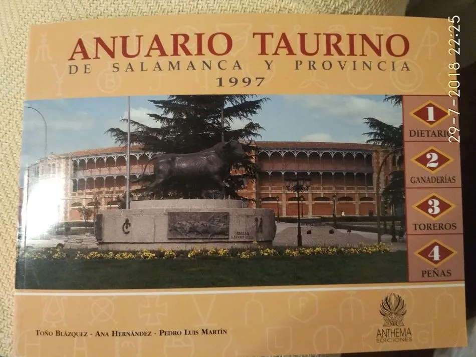 Y nos pusimos manos a la obra, con el permiso del editor Juan Antonio Hernández y colaboraciones especiales. El Anuario Taurino de la Provincia de Salamanca. Papel cuché, cuidada edición, formato apaisado e información, mucha información y estadísticas de lo acontecido en el mundo taurino de la capital y provincia, desde festejos taurinos, menores, medianos y mayores, hasta noticias sociales relacionadas con la fiesta. Un apéndice de peñas taurinas, ganaderías etc...Un trabajo ímprobo, generoso e ilusionante, que nos tuvo en resuelta y dinámica actividad durante seis años, al margen de nuestros trabajos, sacando horas de debajo de las piedras. Fueron seis los Anuarios que se editaron, los de las temporadas 1997,1988,1999,2000,2001 y 2002.