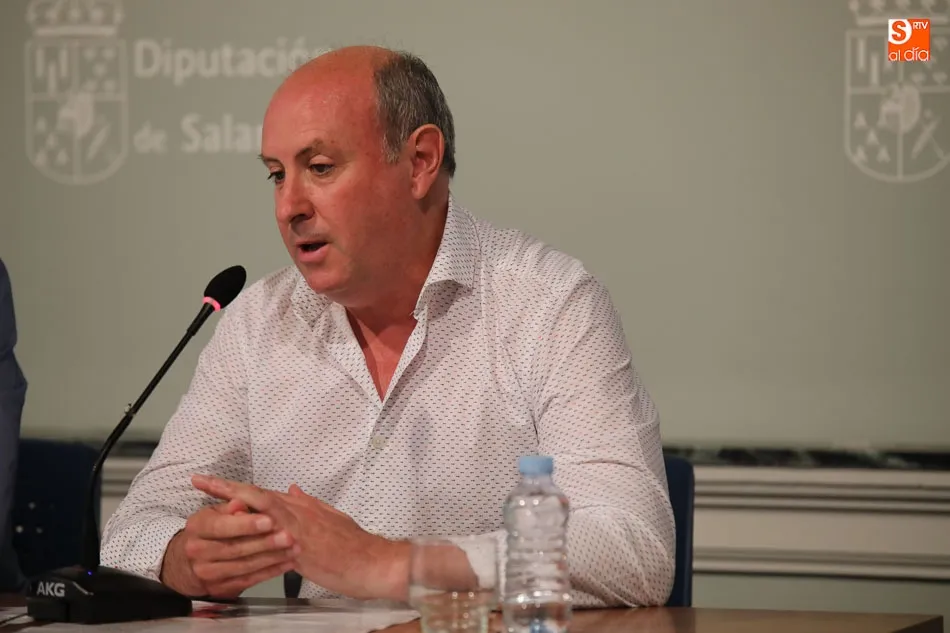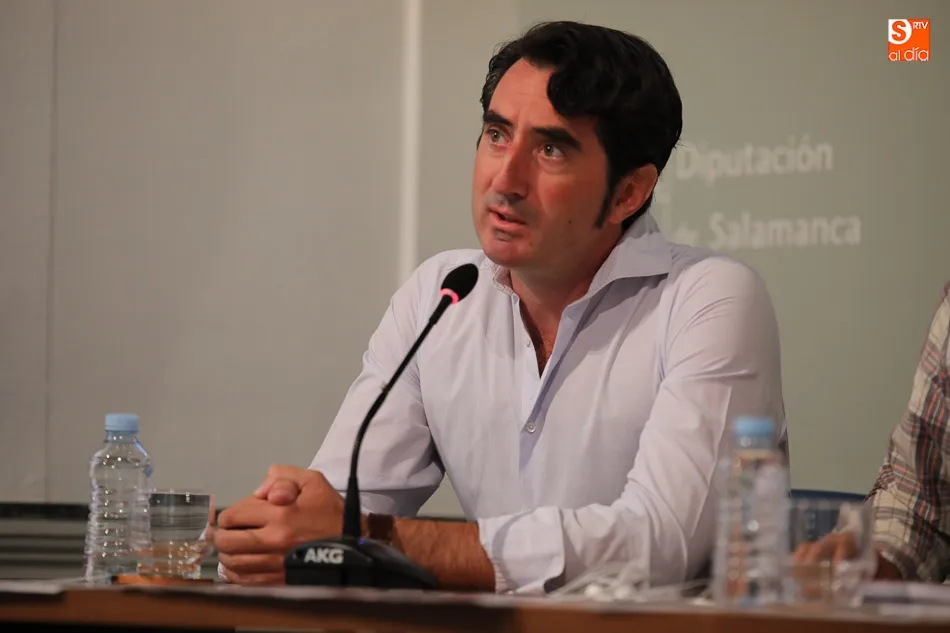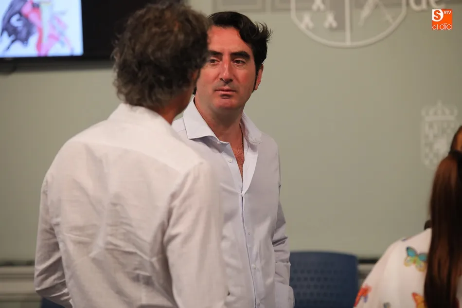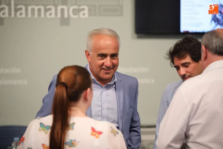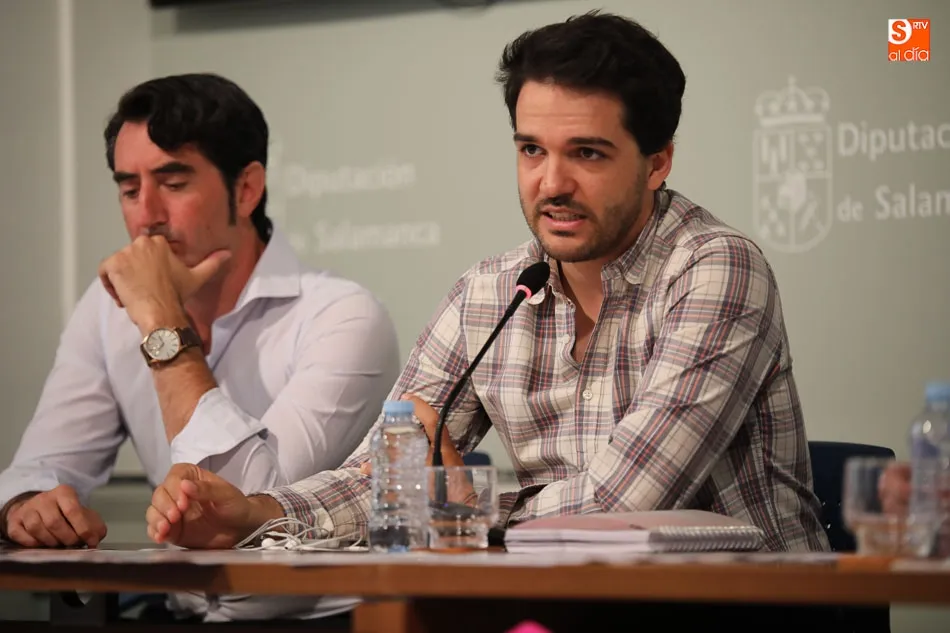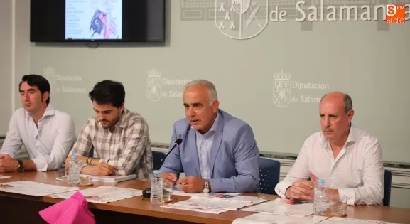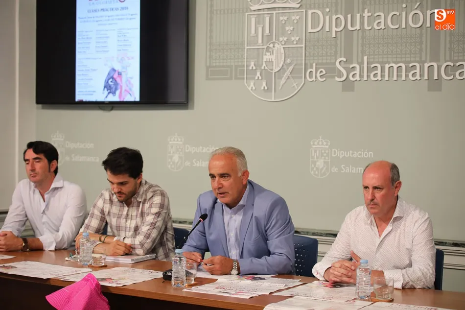 El diputado delegado de la Escuela de Tauromaquia, Jesús María Ortiz, junto al periodista de La 8 Salamanca, Víctor Soria, a representantes de los municipios participantes y ganaderos, ha presentado este martes en la Diputación el cartel de las clases prácticas del concurso ?Destino La Glorieta? que se se celebrarán durante el mes de agosto en los municipios de Valero, Saucelle, Guijuelo y Alba de Tormes.