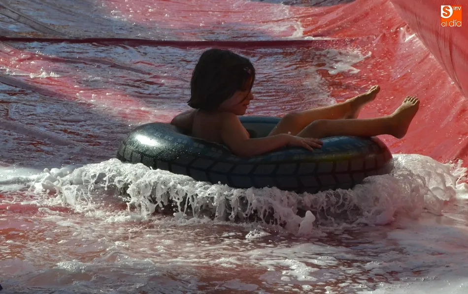 Allí, todos los niños que quisieron pudieron lanzarse y lanzarse de forma gratuita (al igual que el resto de actividades), ayudados por los jóvenes integrantes de Arte Charro, algunos de los cuales se animaron siguiendo el espíritu de la empresa a hacer ?recortes? y saltos a los niños según bajaban montados en los flotadores.