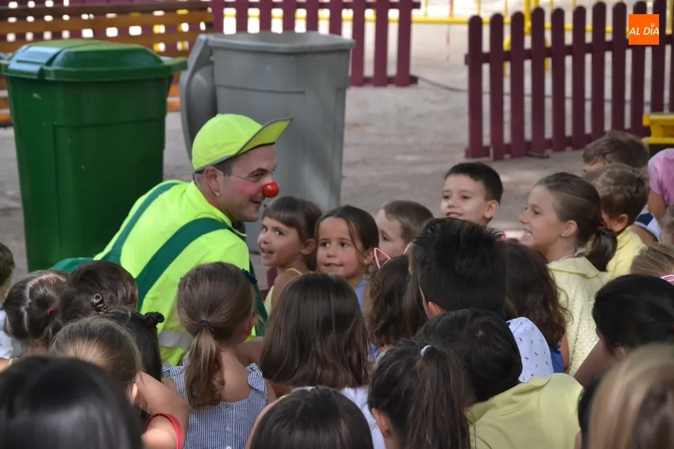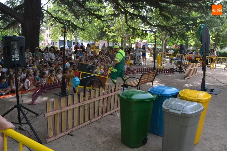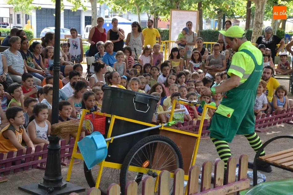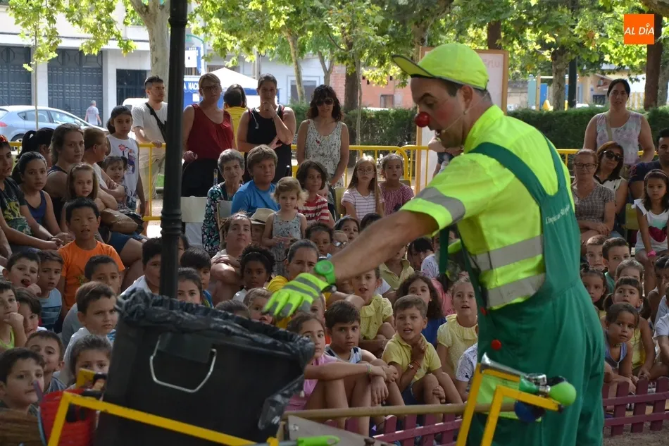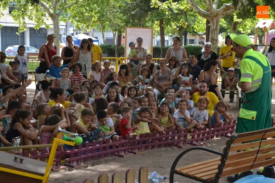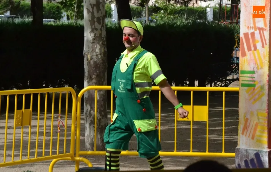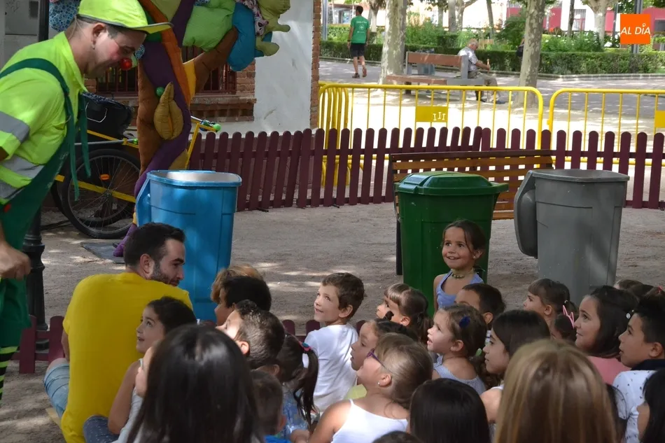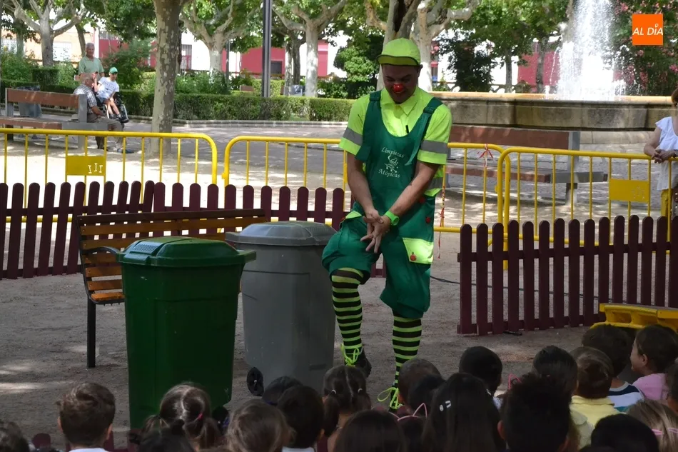 Las inmediaciones del templete del Parque de La Glorieta de Ciudad Rodrigo acogieron en la mañana del viernes la tercera cita teatral del programa Una Glorieta de Rechupete. En esta ocasión, La Glorieta recibió a Claudio Cleaner Clown, un simpático payaso de la compañía Teatro Atópico que quiso concienciar a los niños sobre la importancia del reciclaje.