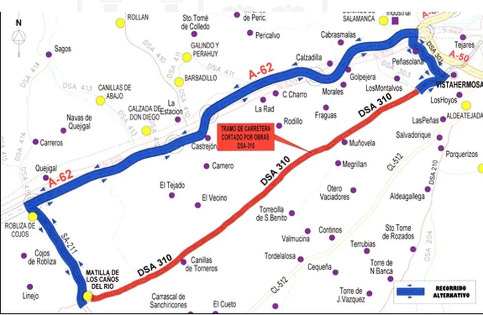 Con motivo de la ejecución de las obras de ensanche y refuerzo del firme de la carretera DSA-310 que comunica Vistahermosa con Matilla de los Caños, en el tramo comprendido entre el acceso al Hospital de los Montalvos y Matilla de los Caños, promovidas por la Diputación de Salamanca dentro de los planes de inversión de carreteras, dicho tramo de carretera permanecerá cerrado al tráfico de vehículos del 6 de agosto de 2018 al 6 de febrero de 2019.