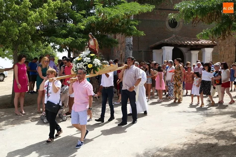 La ola de calor de calor que está azotando estos días el país no ha impedido que los vecinos de Poveda de las Cintas honrasen a Nuestra Señora del Castillo. A falta de cinco minutos para la una, cuando los termómetros marcaban 31ºC, salía de la iglesia la procesión, una vez que había finalizado la misa.