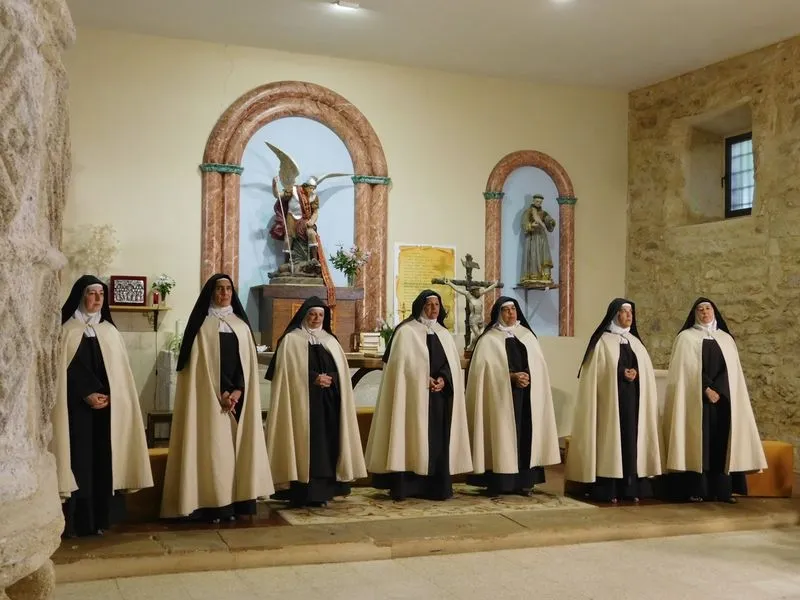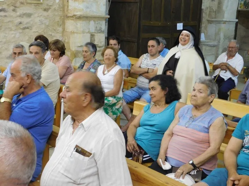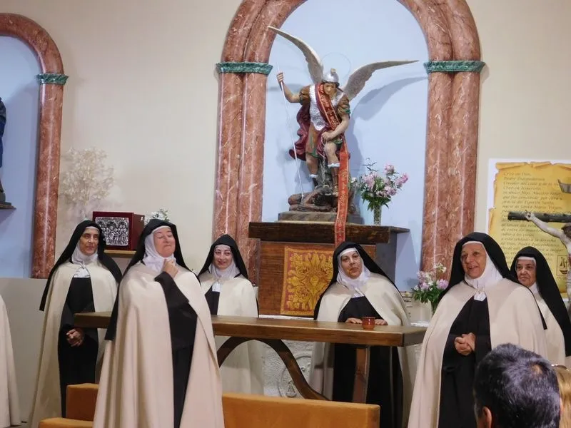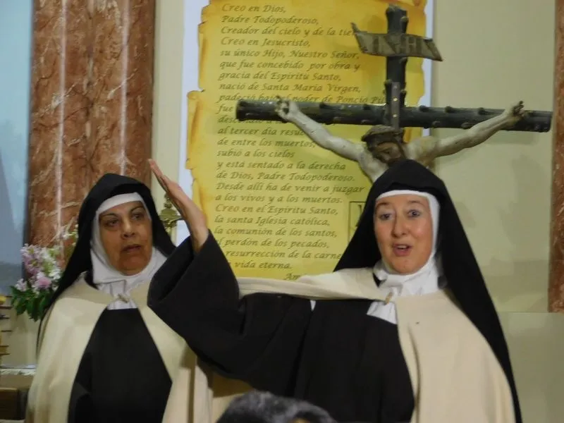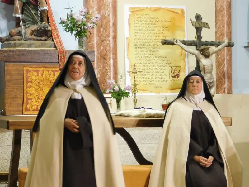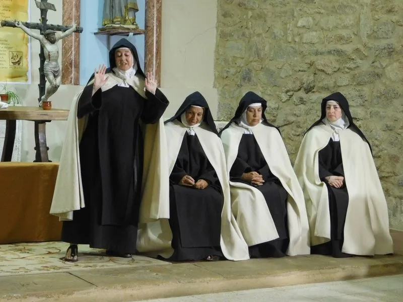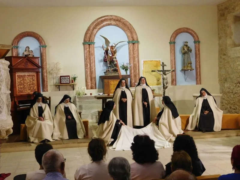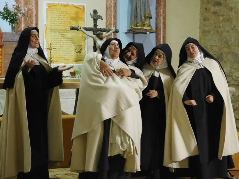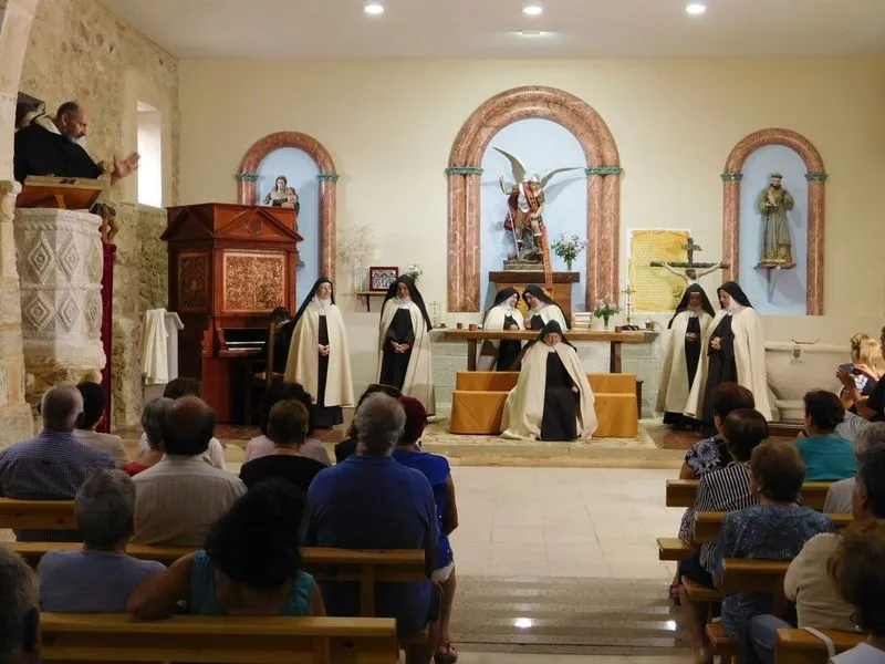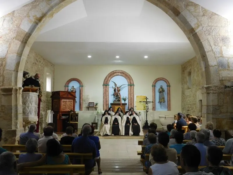 En la iglesia de Santiz, san Miguel Arcángel, defensor de las profundas creencias que a ultranza transmiten algunos privilegiados, presenció la batalla que dialécticamente entablan unas hermanas carmelitas ante el castillo-baluarte que presenta un púlpito en el que se atrincheran los argumentos retorcidos de La Inquisición, cuyo representante masculino simboliza a una sociedad llena de prejuicios y aspiraciones de poder entre muchos de sus miembros.