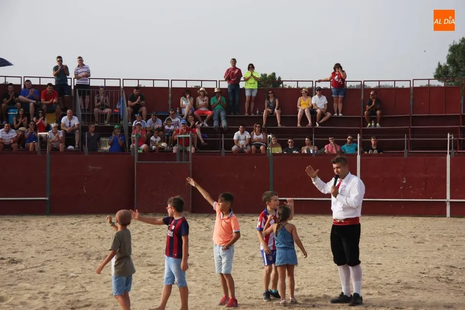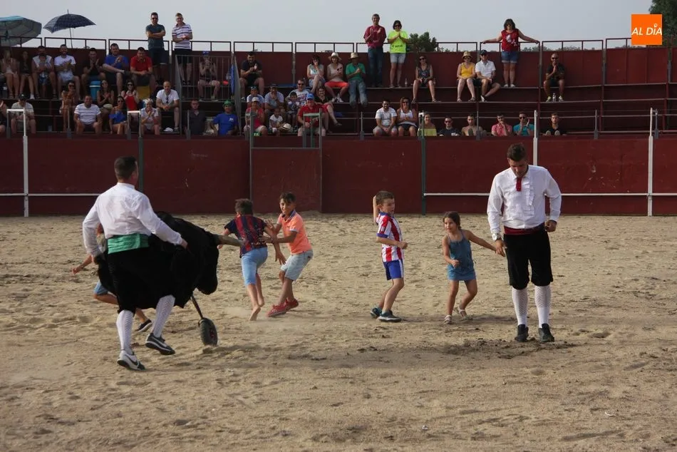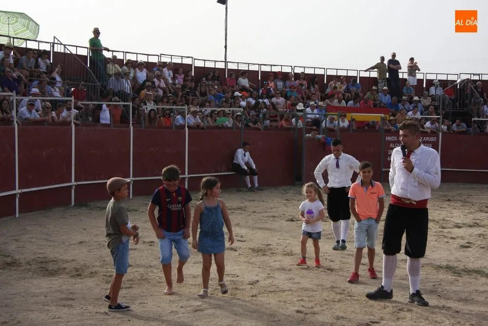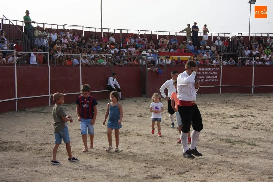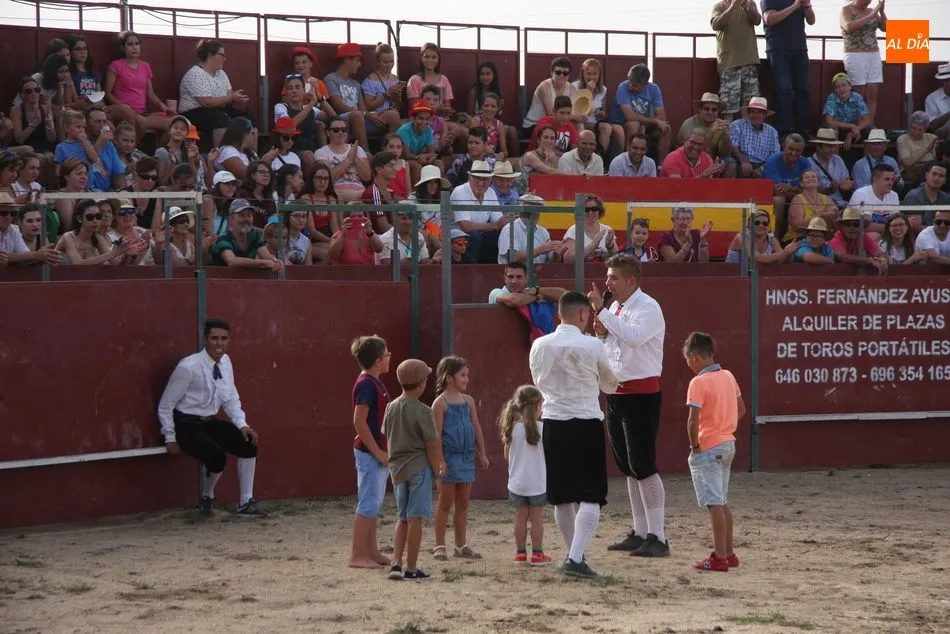 El grupo de recortadores Arte Charro ofreció este domingo en Peralejos de Abajo un bonito espectáculo taurino y en el que no faltó la emoción ni el buen humor. A la exhibición de recortes, quiebros y saltos sobre vacas de la ganadería El Canario, de buen juego, se sumó el excelente humor de este grupo y unos pequeños e improvisados recortadores, que hicieron sus primeros ?pinitos? sobre el albero y obstinado ?morlaco?.