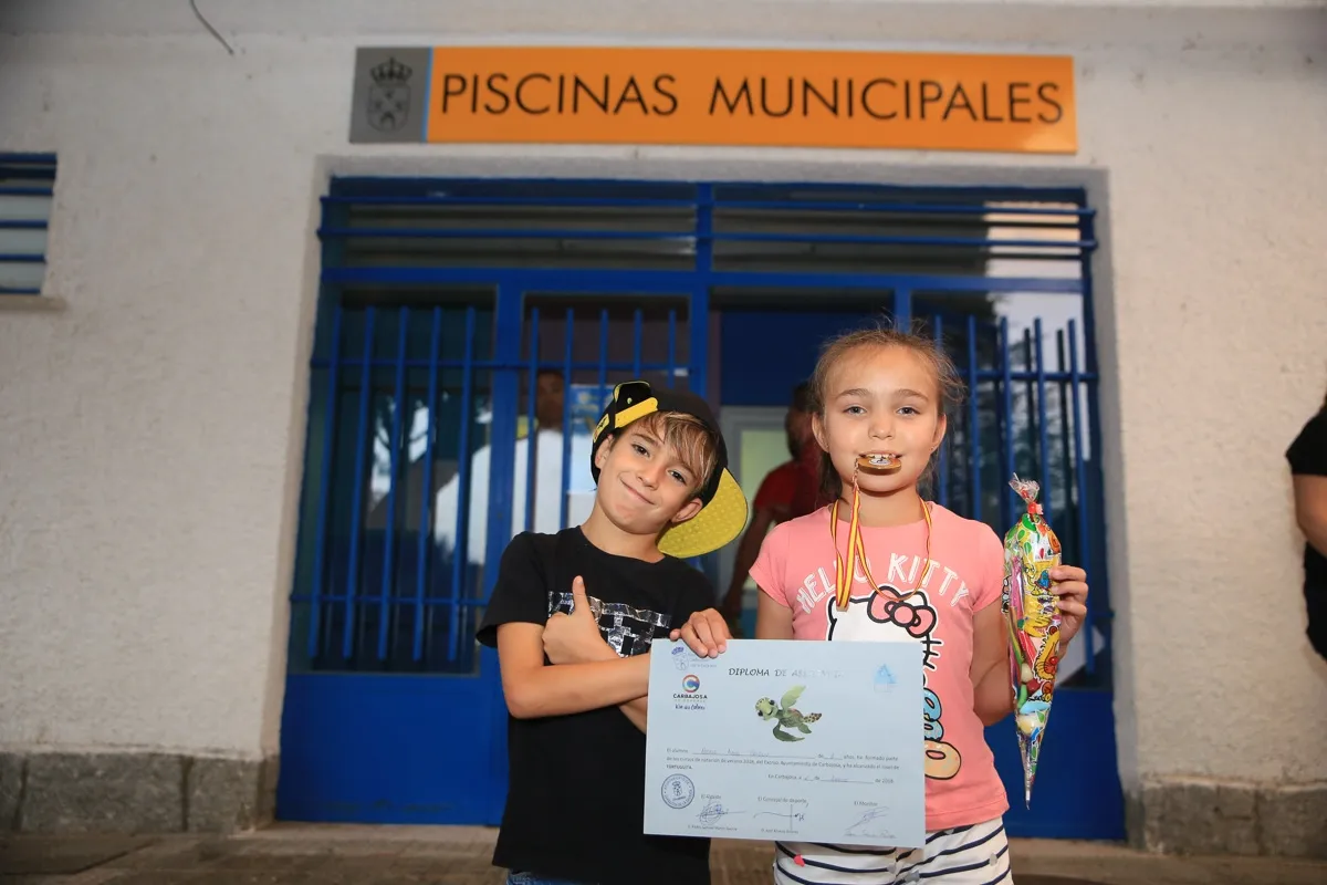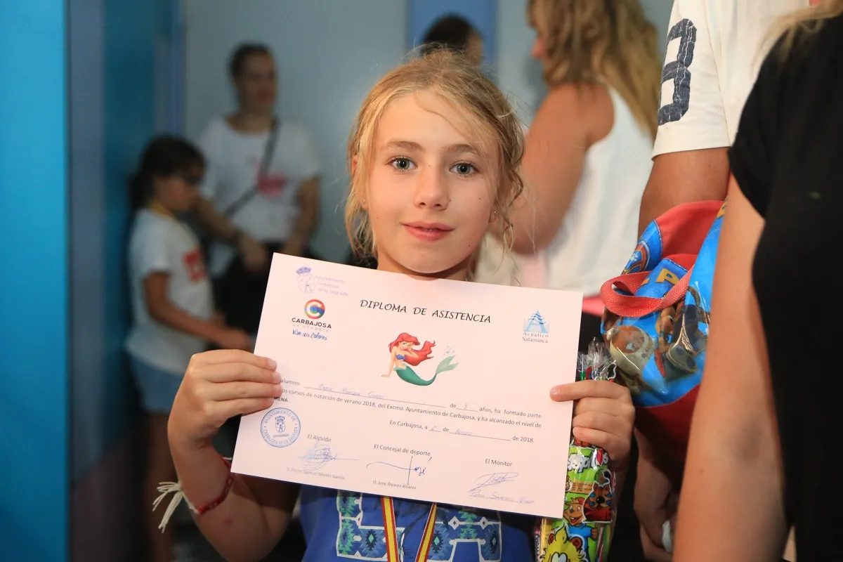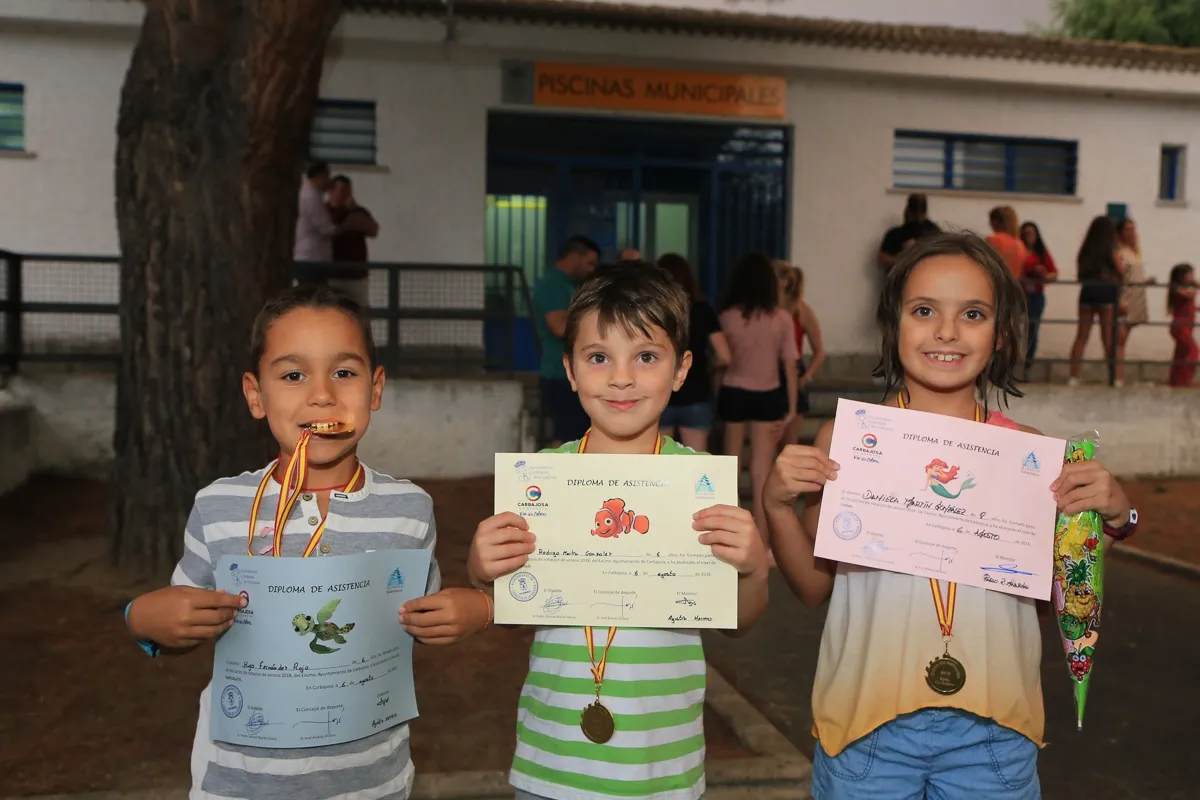Durante este verano, los más pequeños de Carbajosa han participado en varios cursos de natación organizados por el Ayuntamiento y celebrados en dos turnos durante este verano. Por este motivo, los implicados en esta actividad han sido partícipes de una exhibición, seguida de una condecoración con diplomas y medallas que han sido entregados directamente por el alcalde del municipio, Pedro Samuel Martín, y el concejal de deportes, José Álvarez.