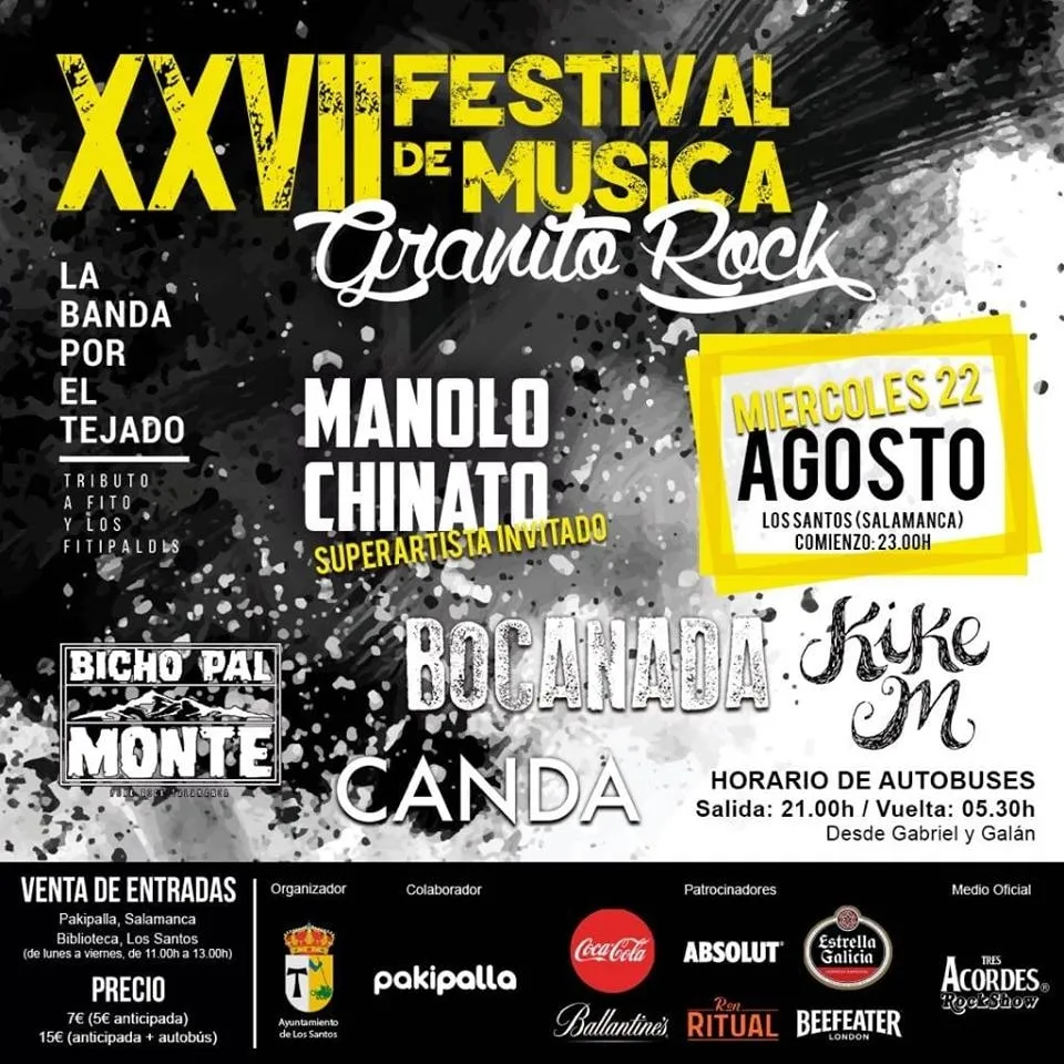 Además, se podrá escuchar la música de otros cinco grupos. El primero de ellos será ?La banda por el tejado?, un grupo tributo de Fito y los Fitipaldis. Bocanada es un grupo creado en 2006 que hoy en día está formado por Martín, Juanito, Rupi y Pepo. Están de gira de su último disco ?Libres?. El punk-rock llegará del joven grupo Bicho pal Monte. Tras su presentación en 2016 en Salamanca han recorrido varios festivales como el Bellotarock. Un estilo más íntimo será el de Kike M. El cantautor salmantino acaba de publicar su EP ?Pobladores del suelo, las nubes y el mar? y se encuentra en plena promoción de su música. A estos artistas se sumará la banda Canda para completar un cartel muy variado que comenzará sus actuaciones a las 23.00 horas.
