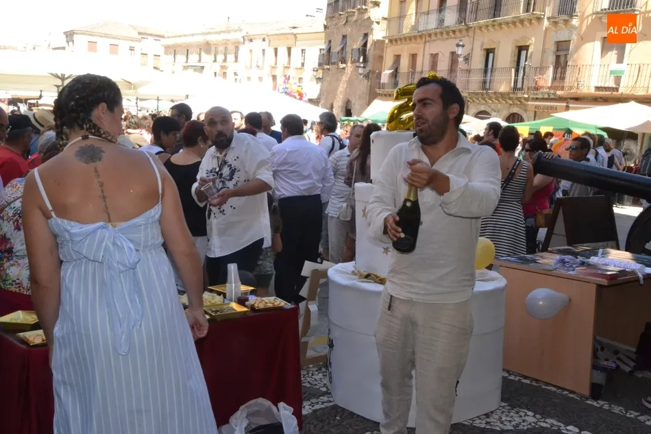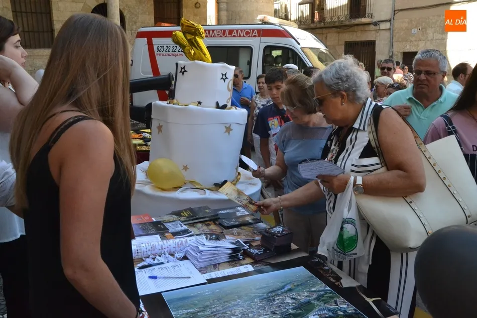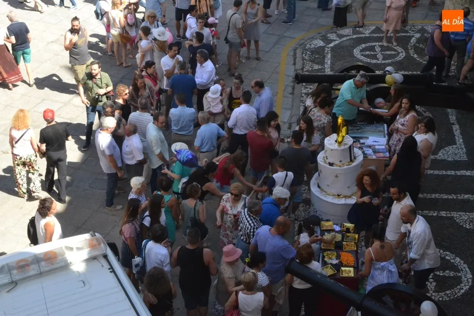 Fue gracias a los alumnos del programa formativo Turismo Miróbriga, que montaron un doble stand a las puertas de la Casa Consistorial: por un lado, un punto de información turística para que no fuera necesario entrar en las oficinas de turismo; y por otro, un stand de celebración, con picoteo para todos aquellos que quisieran sumarse al cumpleaños. De igual modo, sirvieron cava y tinto de verano con el que se brindó a lo largo de la mañana. Entre medias de ambos puestos, tuvieron incluso una gran tarta conmemorativa del 75º Aniversario.