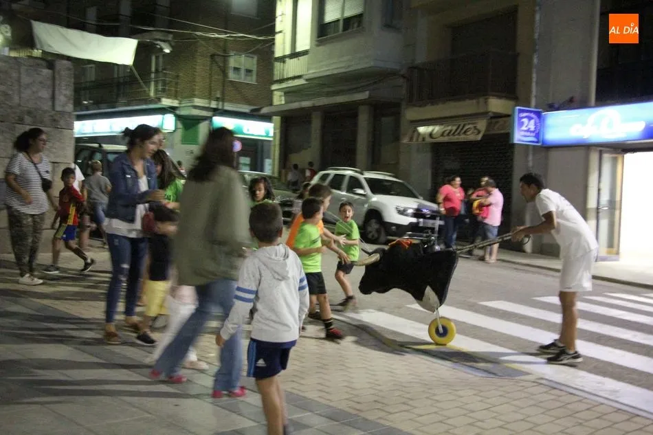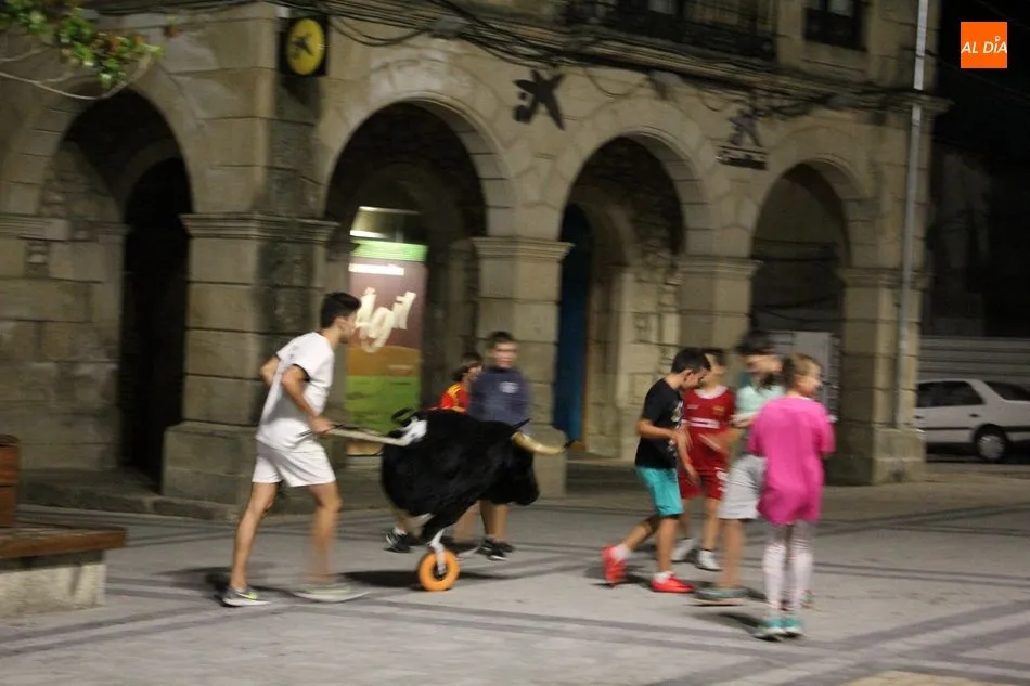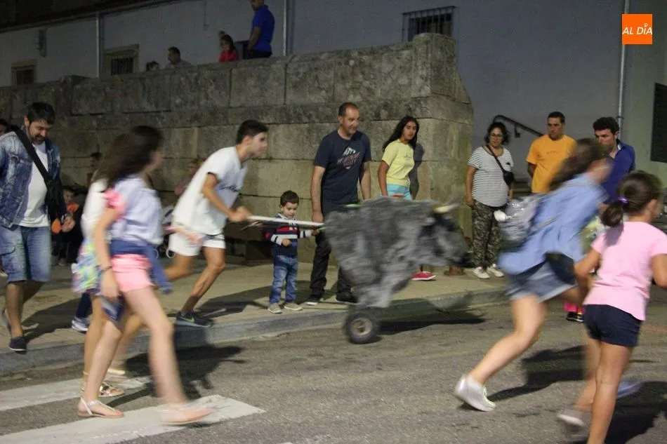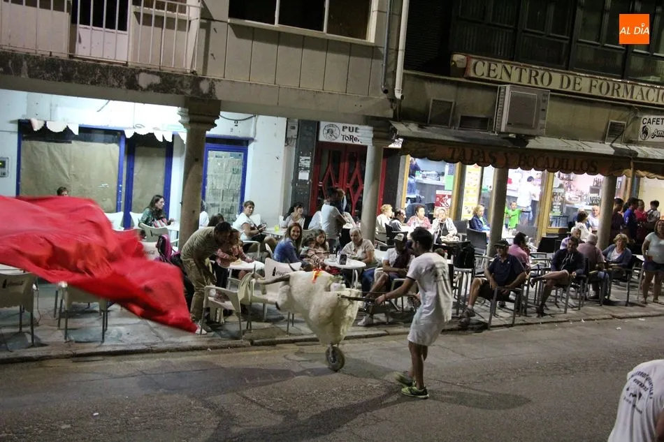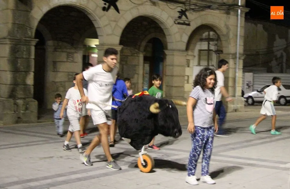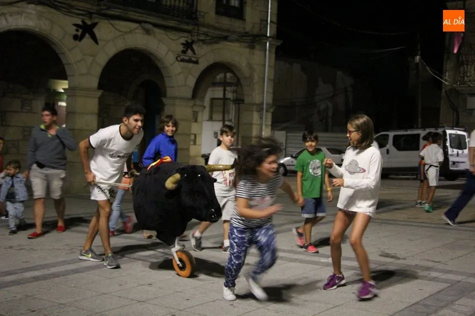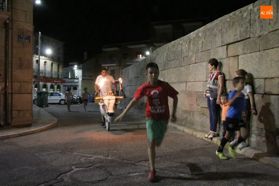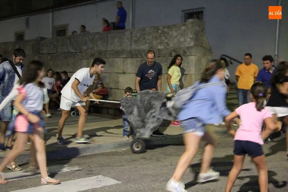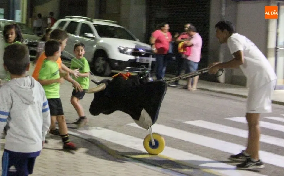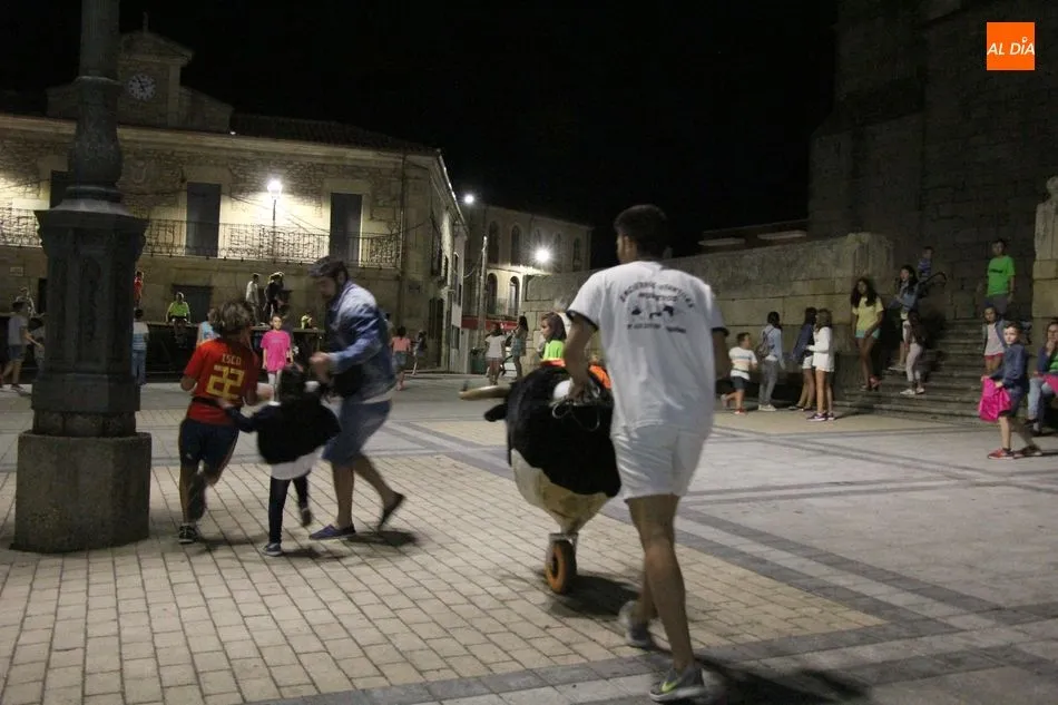 La ?ganadería? de Carlos Huertos volvió a congregar a los más pequeños en Vitigudino, que disfrutaron corriendo delante de las astas de los toros y esquivando el peligro de una ?cogida?. Al encierro tradicional de carretones, se sumaban en la noche de este miércoles, dos toros embolaos, lo que provocaba más emoción en los pequeños que llenaban la Plaza de España.