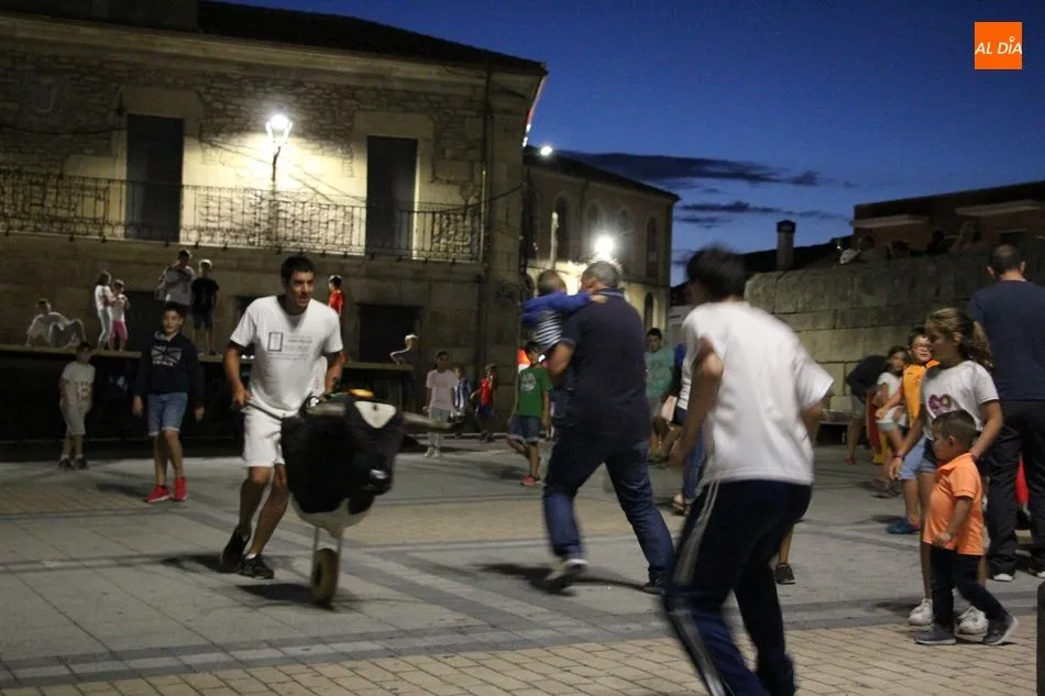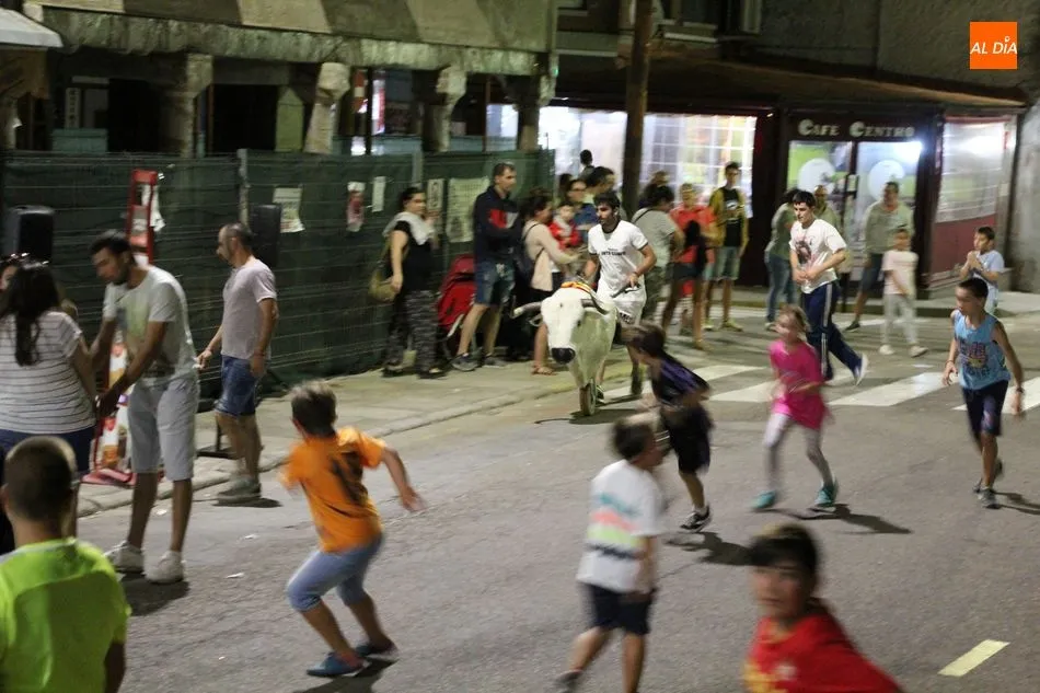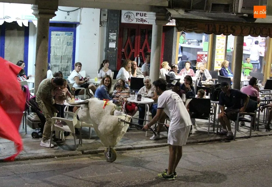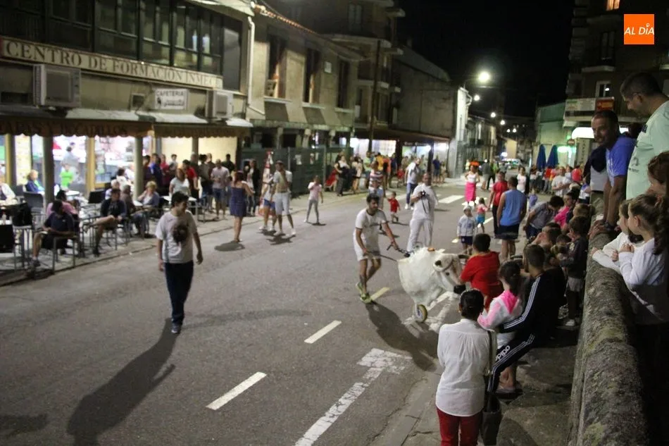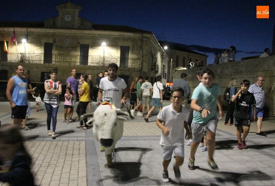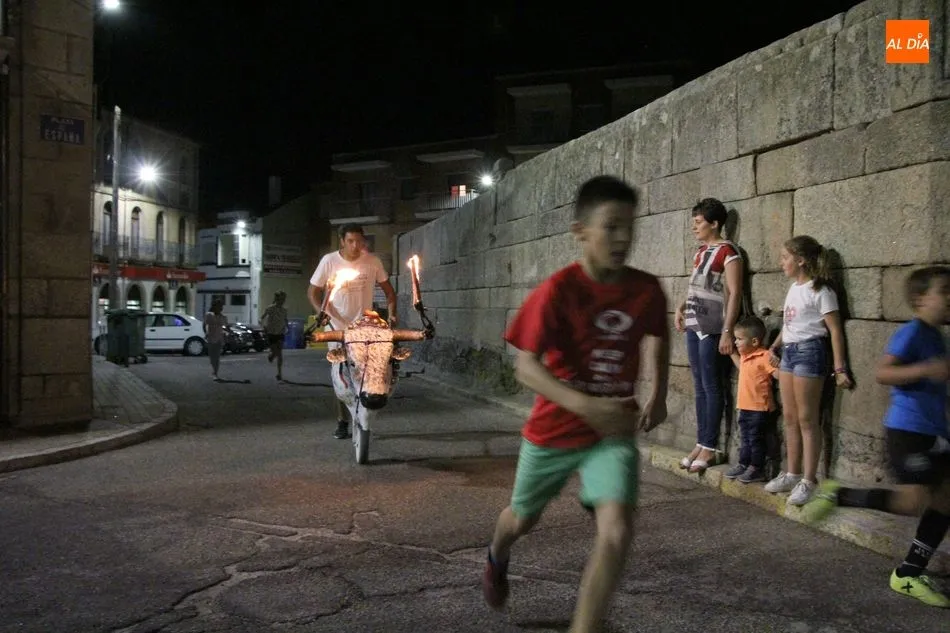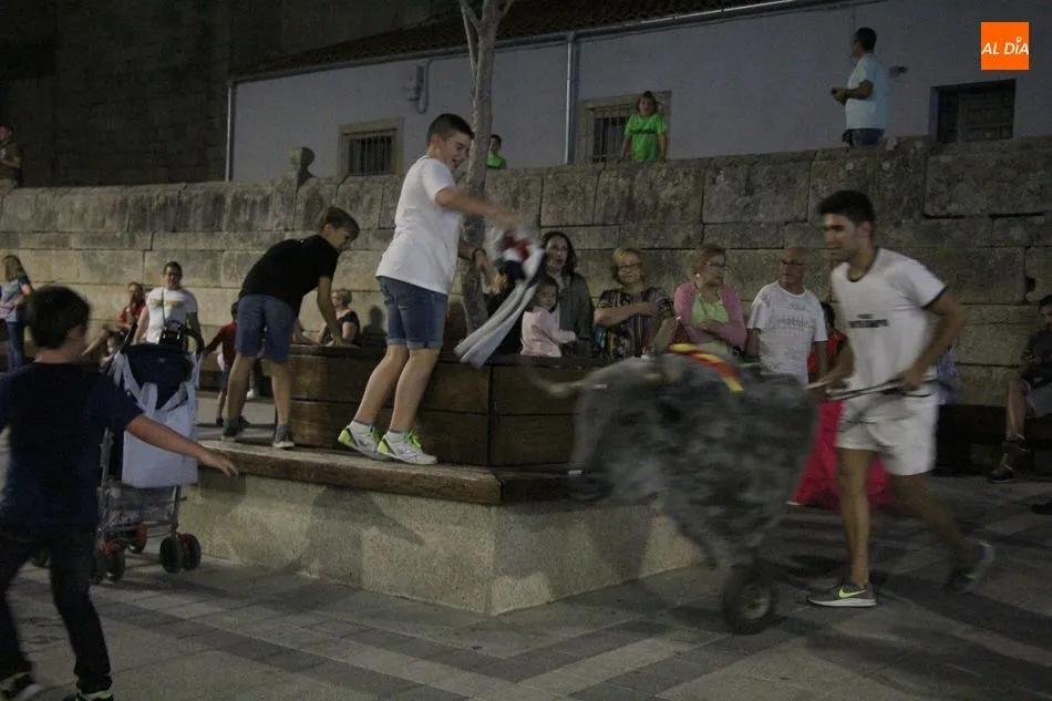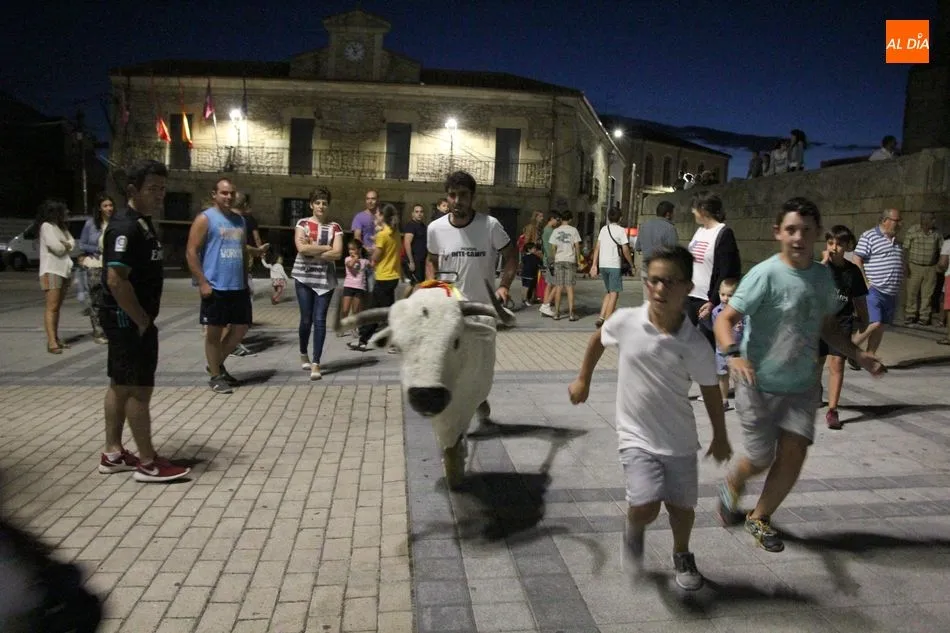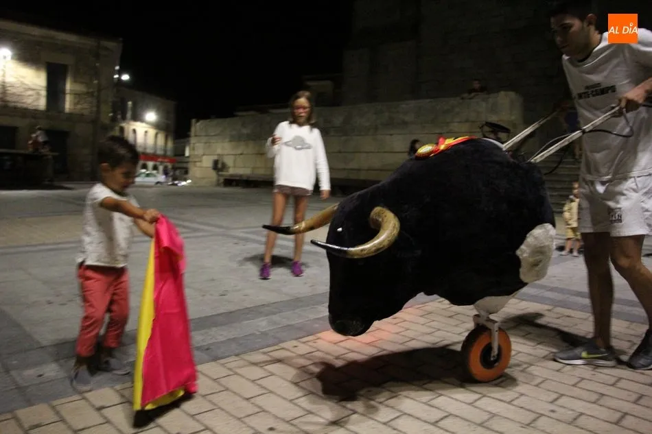 La ?ganadería? de Carlos Huertos volvió a congregar a los más pequeños en Vitigudino, que disfrutaron corriendo delante de las astas de los toros y esquivando el peligro de una ?cogida?. Al encierro tradicional de carretones, se sumaban en la noche de este miércoles, dos toros embolaos, lo que provocaba más emoción en los pequeños que llenaban la Plaza de España.