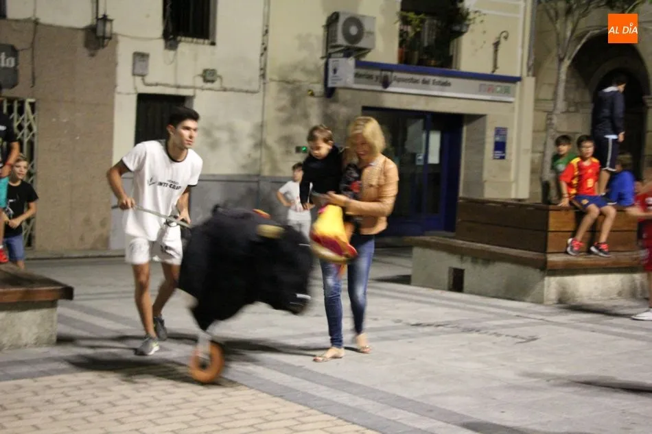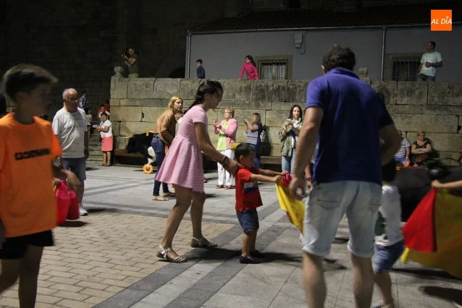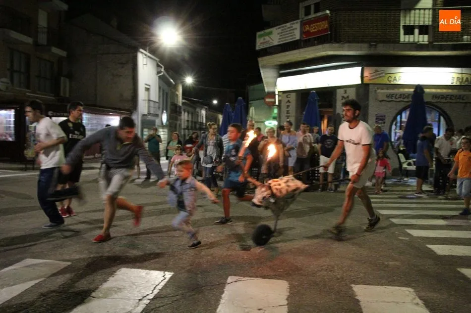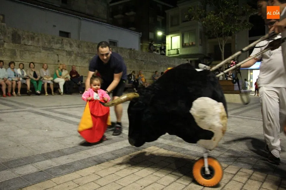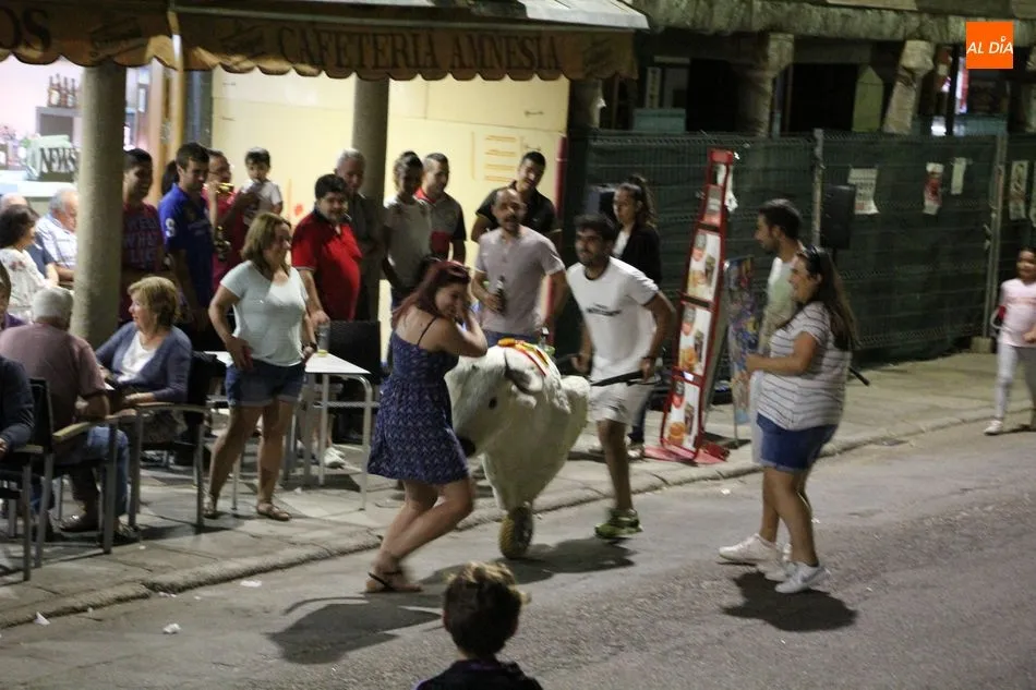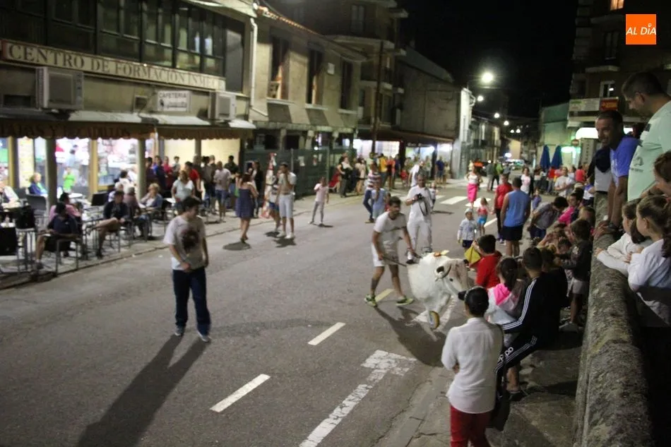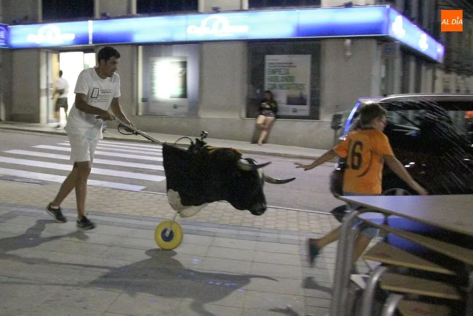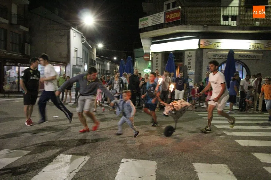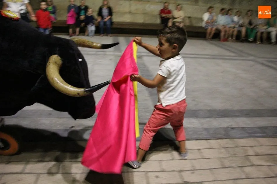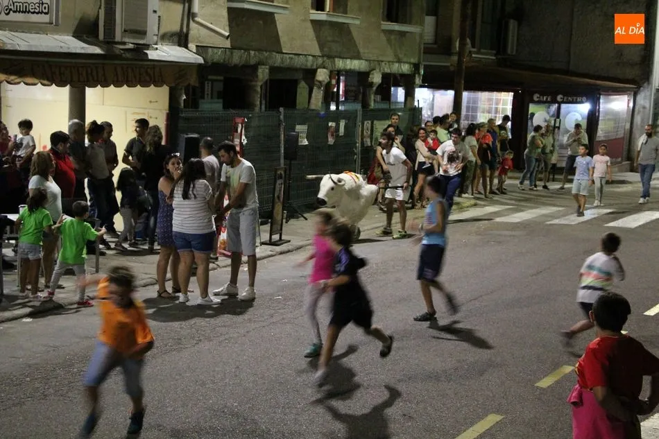 La ?ganadería? de Carlos Huertos volvió a congregar a los más pequeños en Vitigudino, que disfrutaron corriendo delante de las astas de los toros y esquivando el peligro de una ?cogida?. Al encierro tradicional de carretones, se sumaban en la noche de este miércoles, dos toros embolaos, lo que provocaba más emoción en los pequeños que llenaban la Plaza de España.