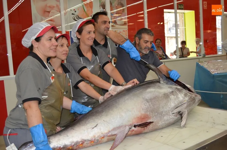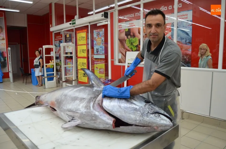 BÉJAR | En el supermercado Dia José Manuel Santarén ha realizado el despiece tradicional del un gran ejemplar de atún rojo
