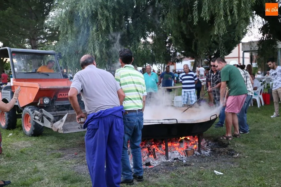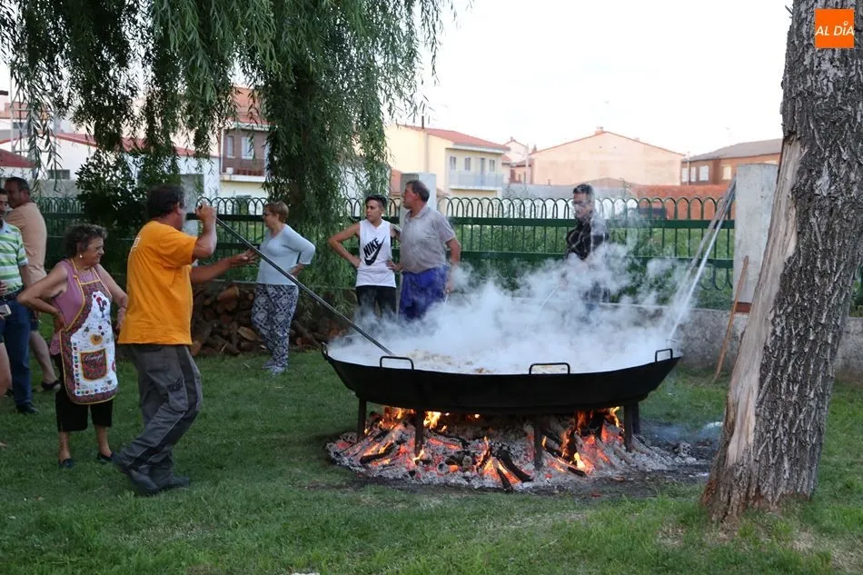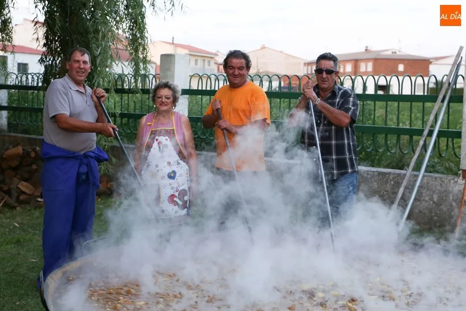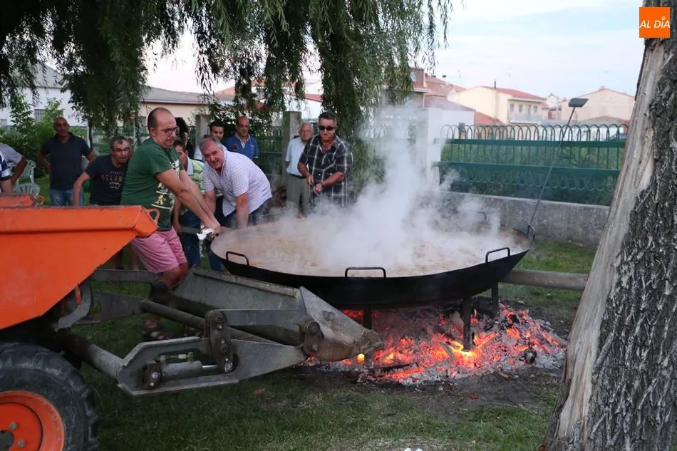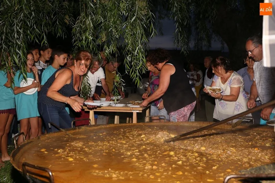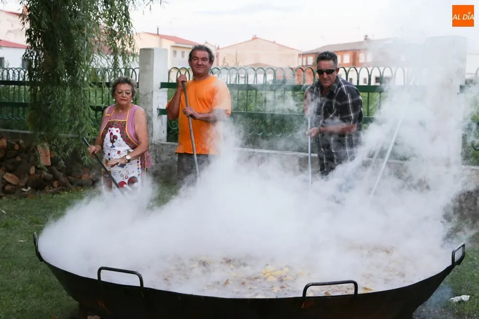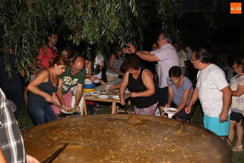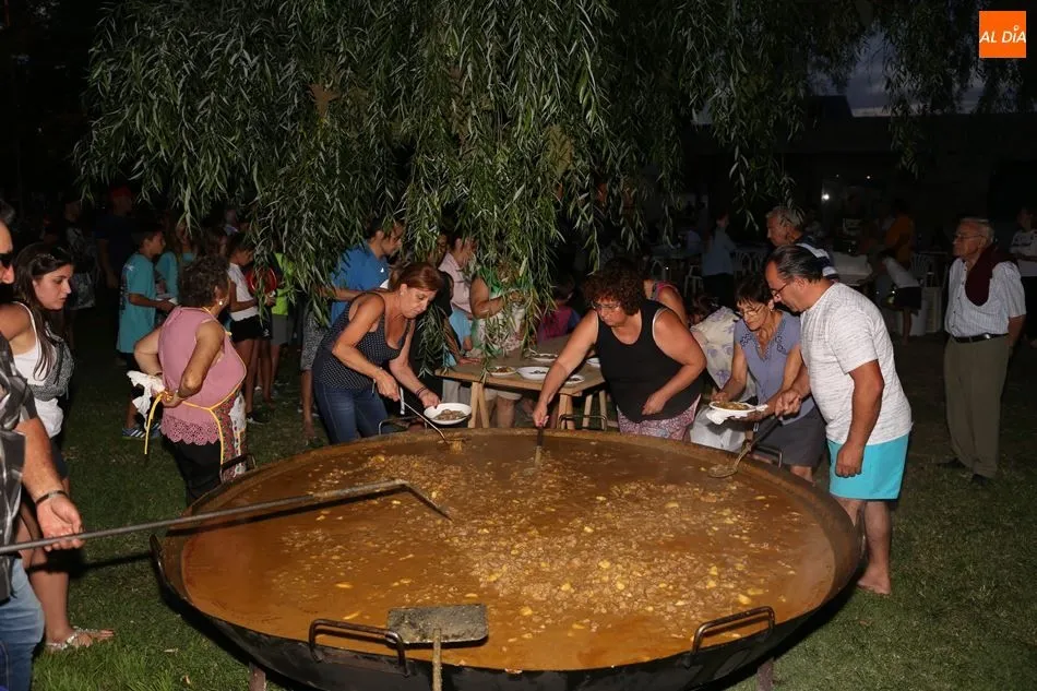Carne, patatas y colaboración vecinal han sido los ingredientes fundamentales de la degustación. Varios voluntarios demostraron sus dotes culinarias para dar de comer a todo el pueblo y a los llegados desde otros municipios. Además de para cocinar, la colaboración de los vecinos fue fundamental para sacar la paellera gigante del fuego. La cantidad de la comida era tal que el dúmper no podía con ella.