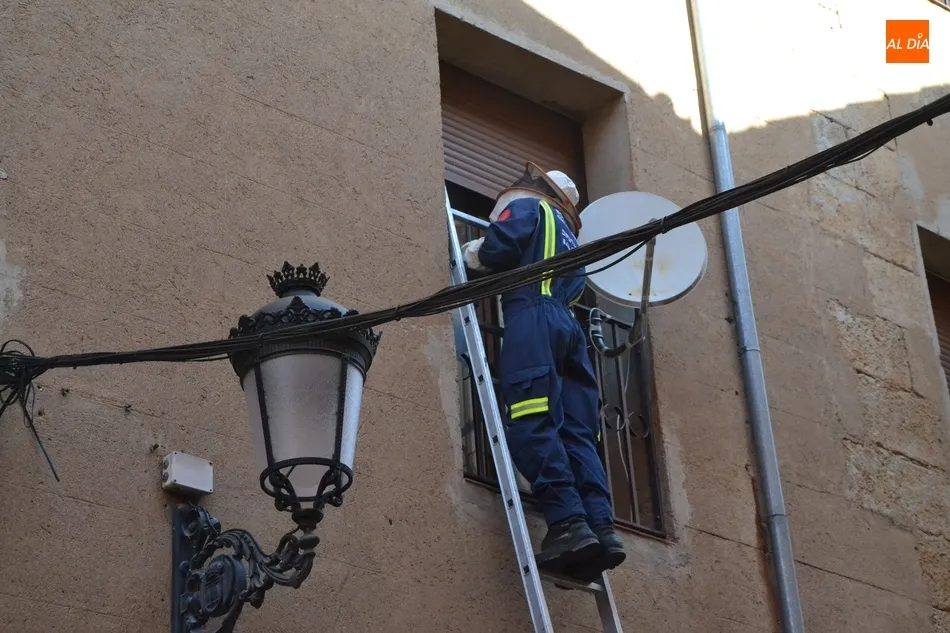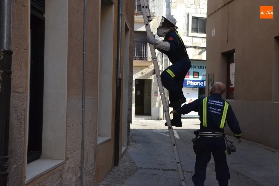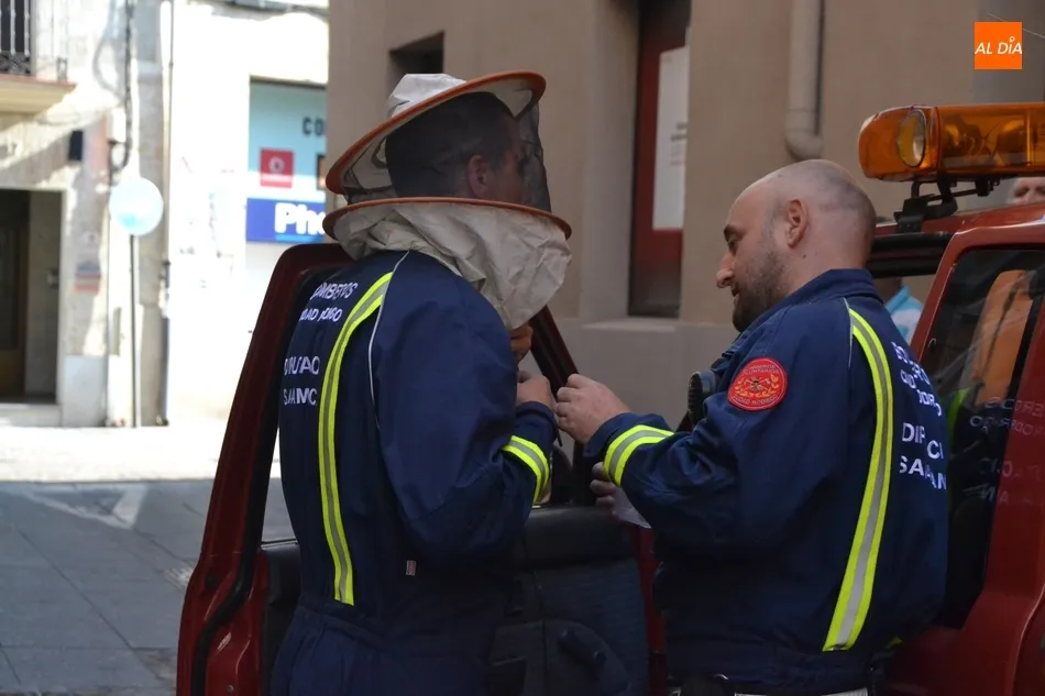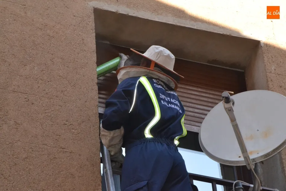 Los Bomberos desplegaron su escalera, subiendo uno de ellos hasta el balcón con el equipo de protección adecuado para fumigar durante varios minutos con productos específicos a las avispas, hasta que parece que ?dejaron de dar guerra?.