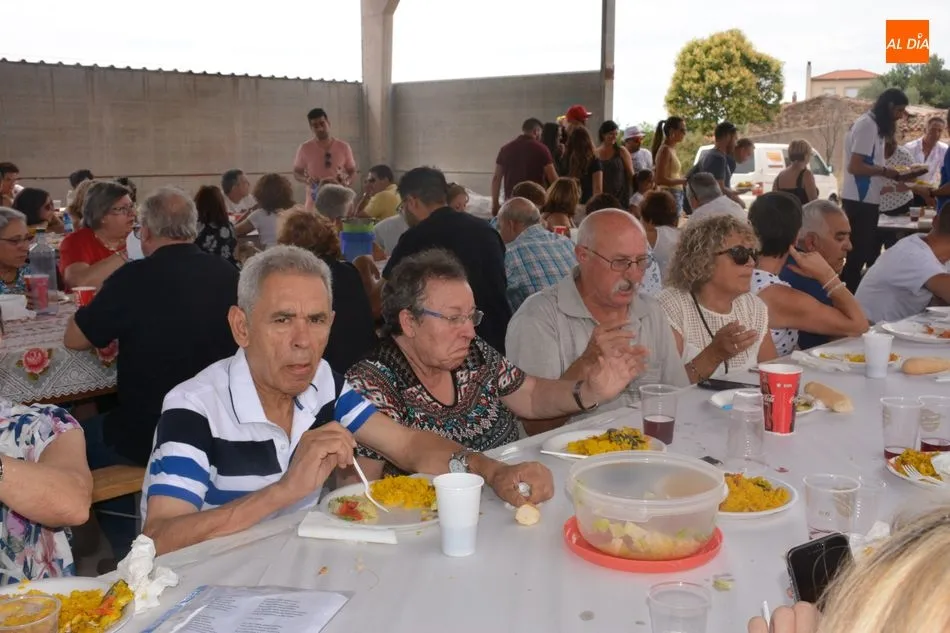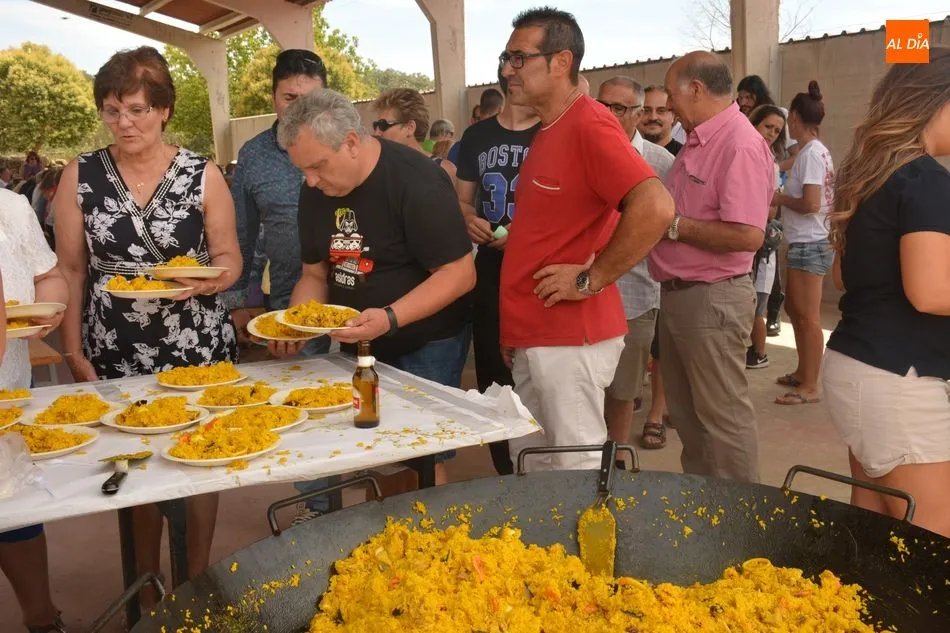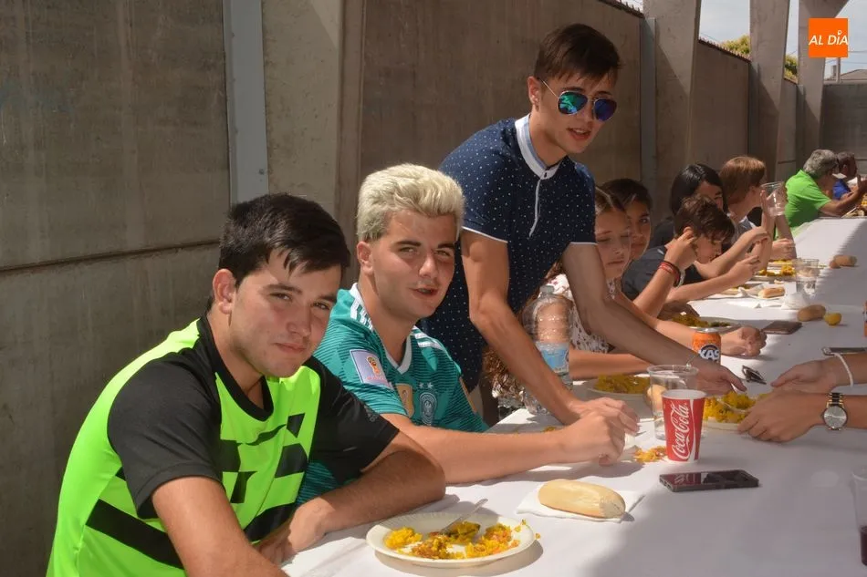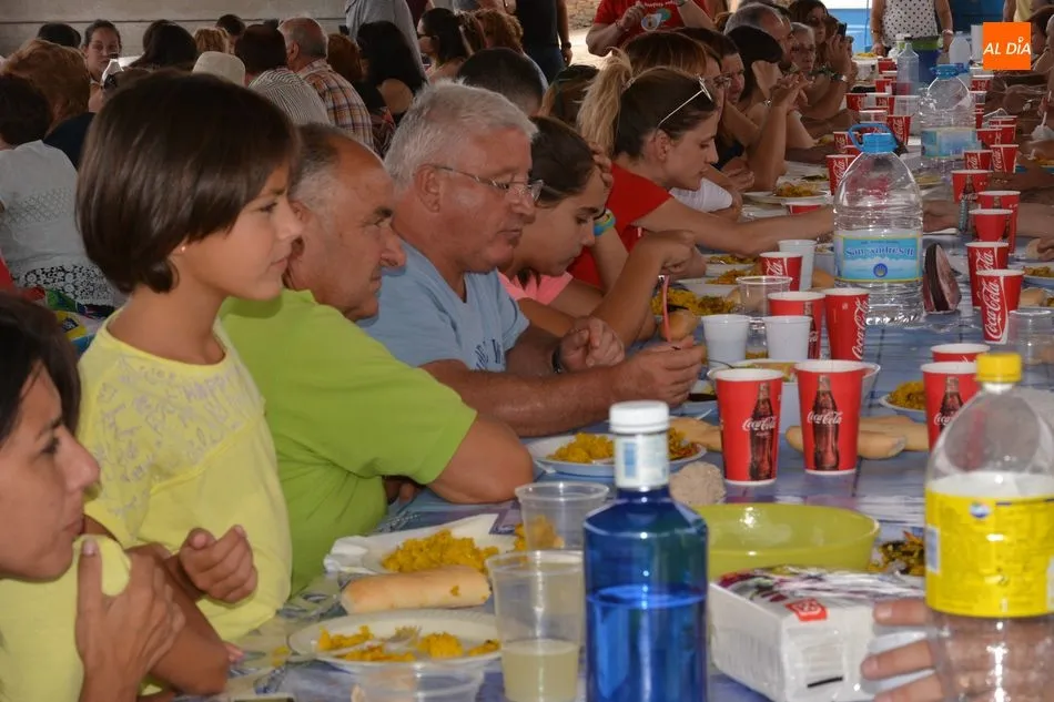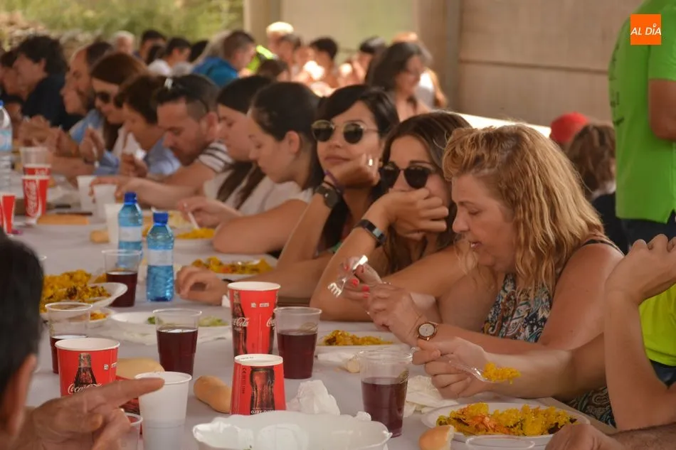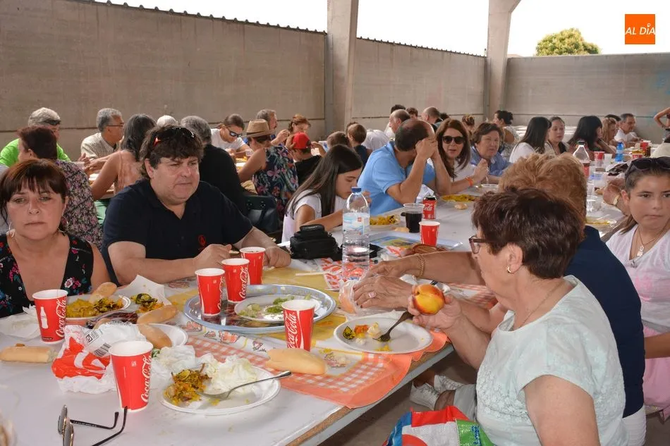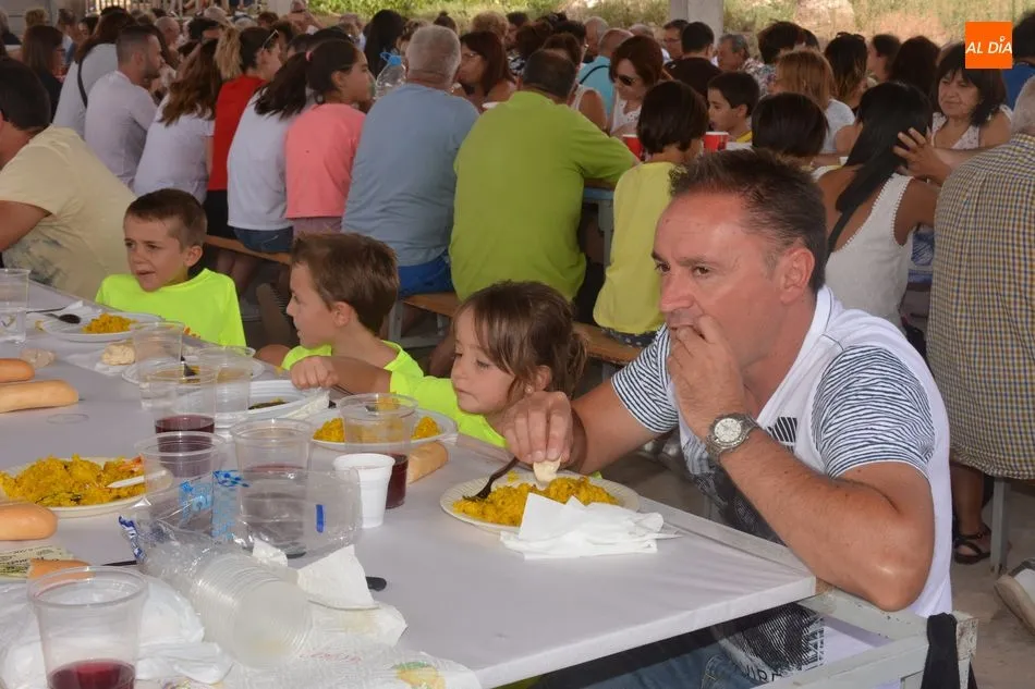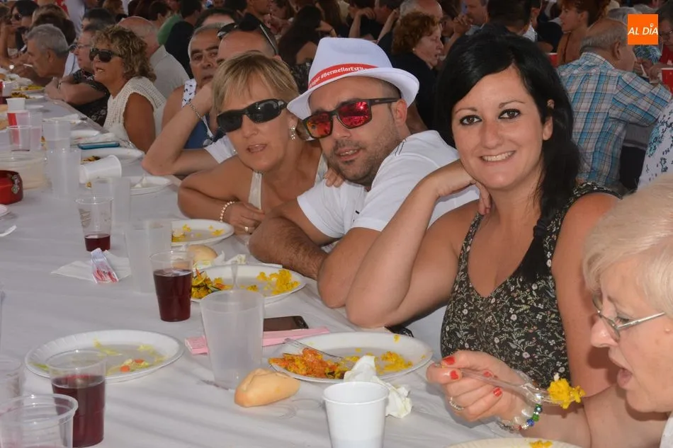 Los conductores de los clásicos se unieron a los vecinos en la gran paellada, que reunió a cerca de 400 comensales, que disfrutaron de la comida previo pago del cubierto (6,50? que ayudan a financiar la comida y contribuir a la celebración de las fiestas). Niños, jóvenes y muchos mayores compartieron el plato de paella, bebida, sandía y café, además de la compañía y la ganas de diversión en estos días de fiesta.