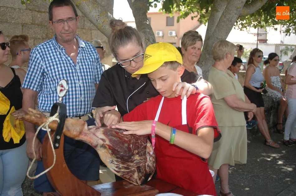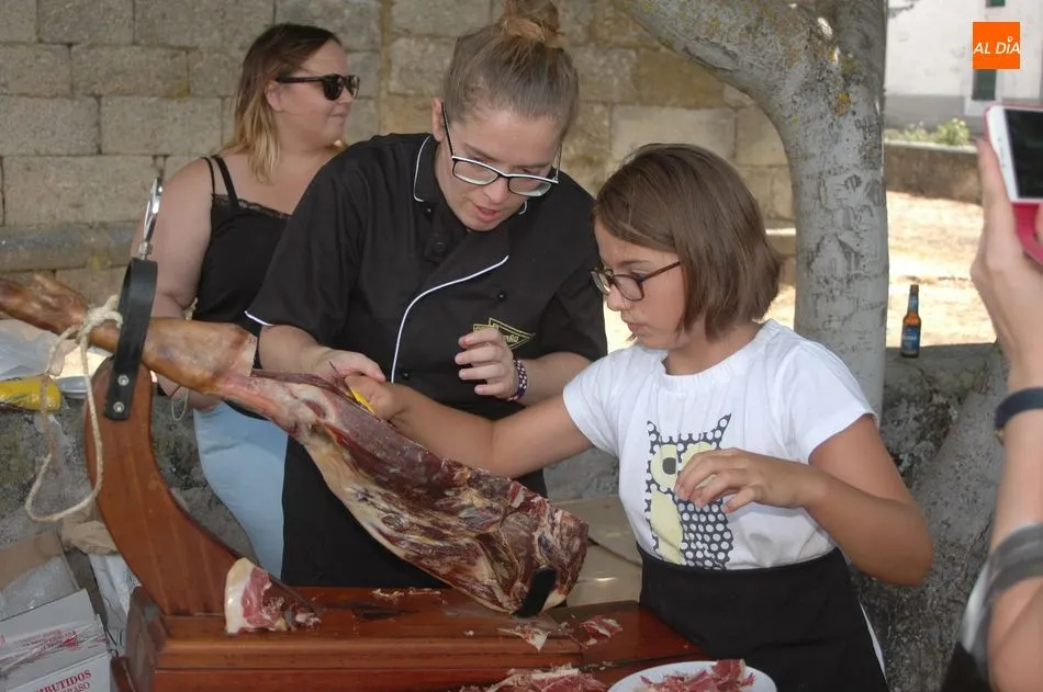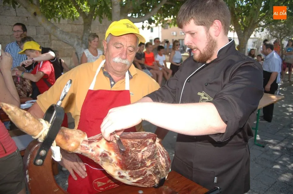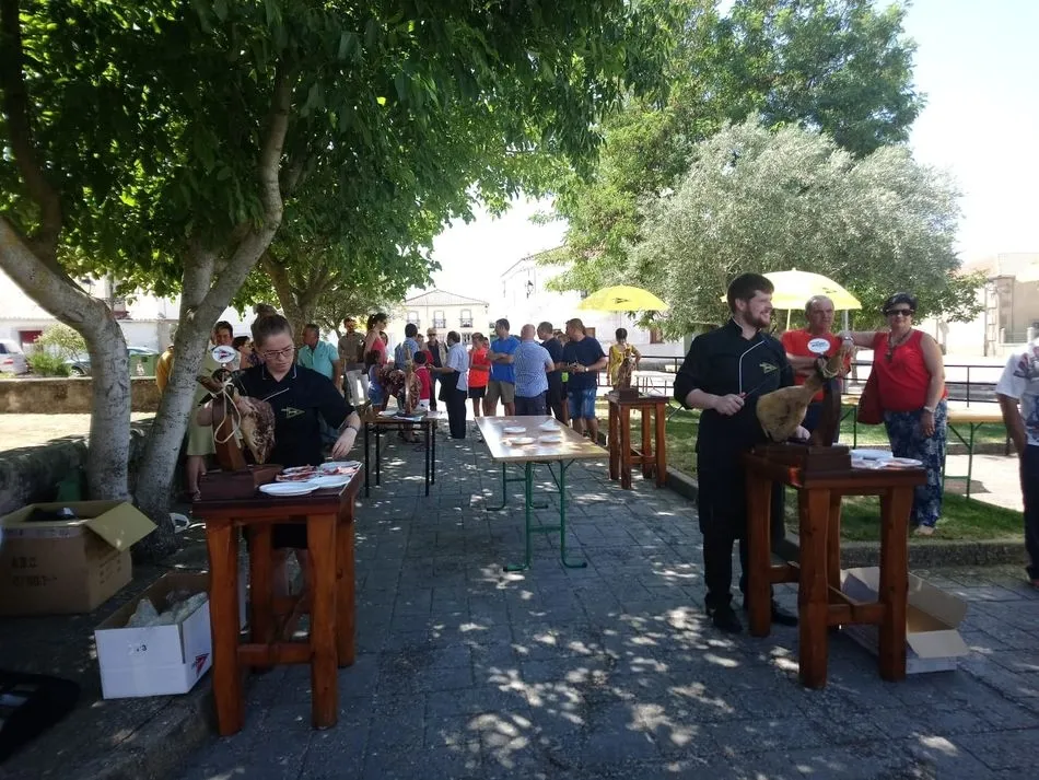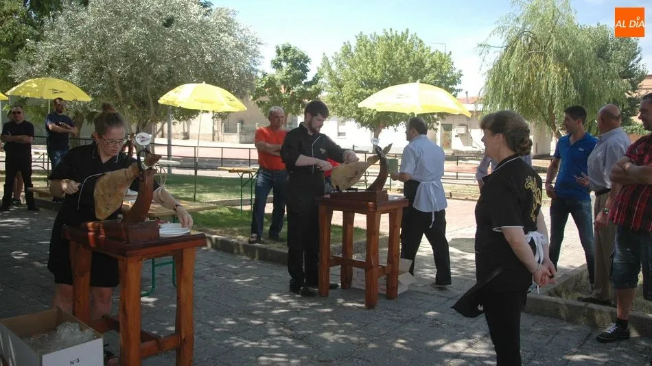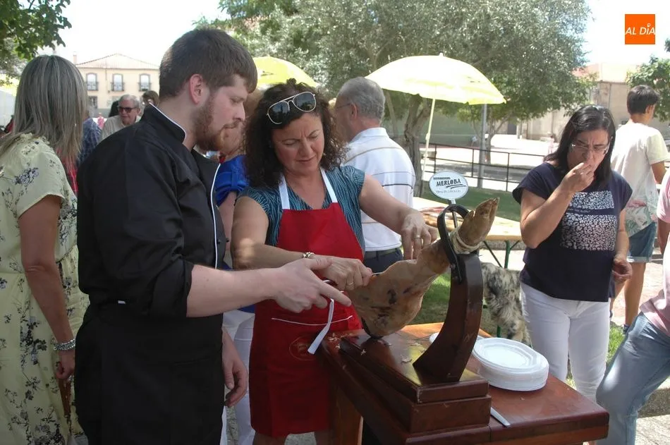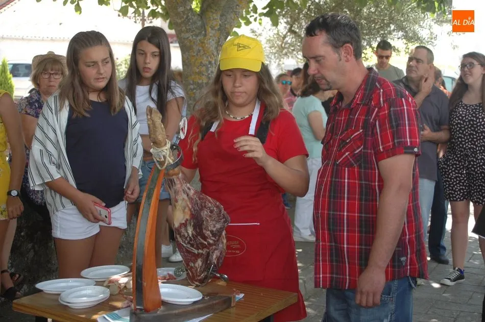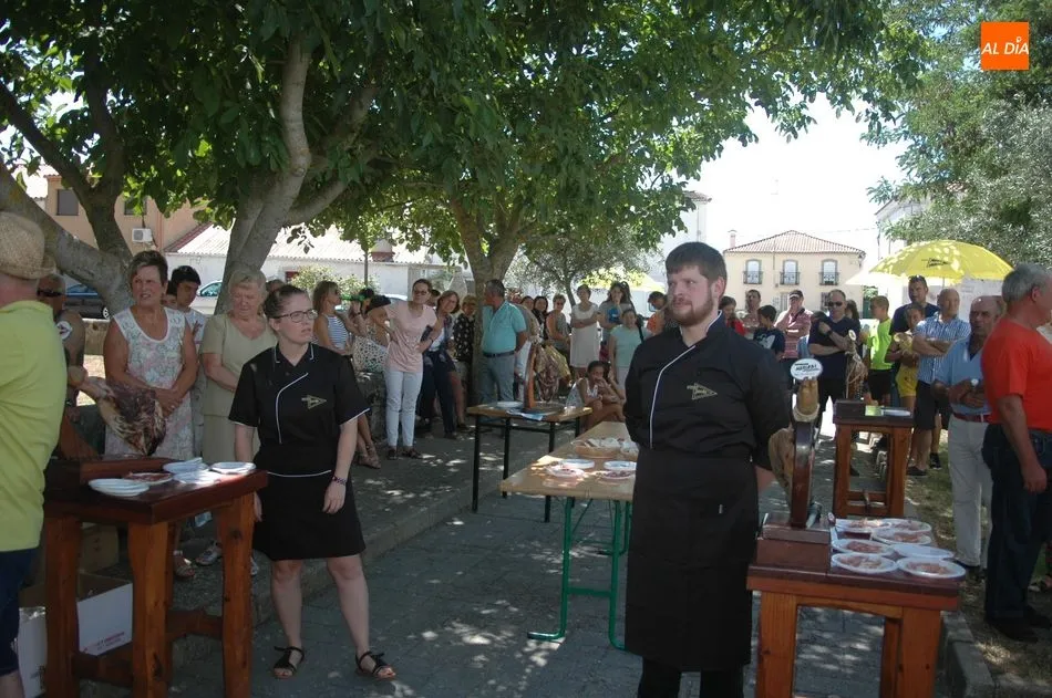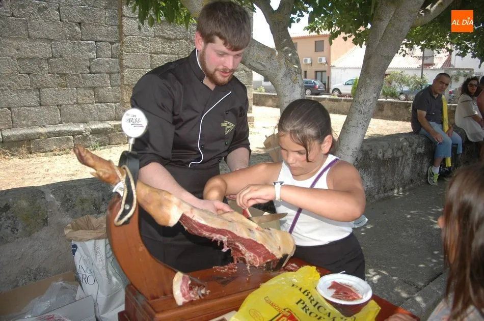 Tras unas nociones básicas, para reconocer las partes del jamón, qué utensilios son los más apropiados, cómo limpiar la pieza y cuál es el corte apropiado para saborear bien el jamón, el numeroso público que se concentraba en la plaza tuvo la oportunidad de poner en práctica las explicaciones de ?Chan?, con la ayuda de María José y los hijos de ambos, Cristina y Jose, quienes iban guiándoles durante el proceso para sacar una buena loncha de jamón. Para finalizar con una degustación de jamón para todos los asistentes.