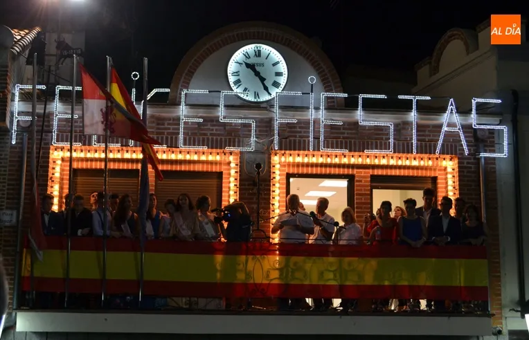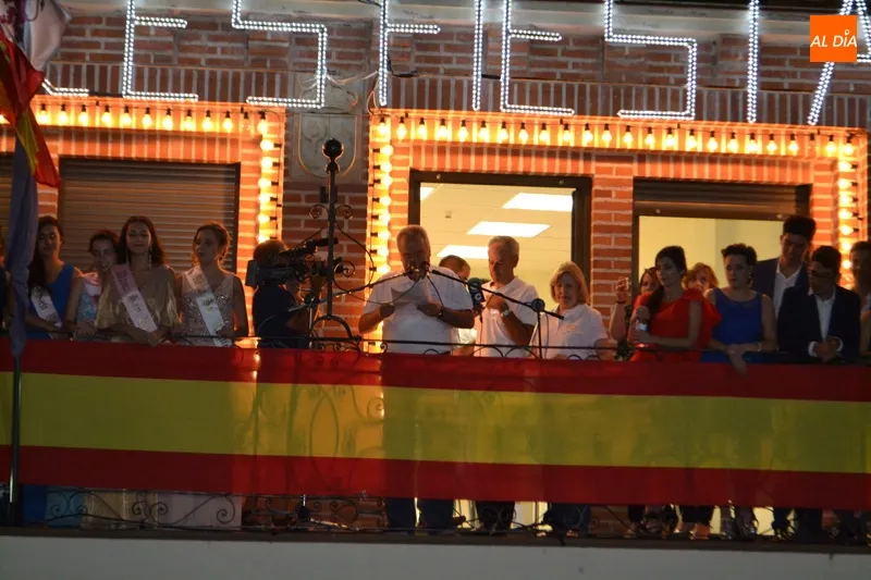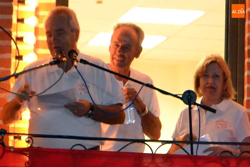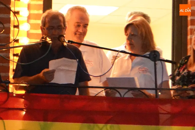 El acto protocolario de intercambio de bandas era conducido por el periodista Miguel Navarro y acompañado por constantes ovaciones y emoción entre peñas y vecinos.