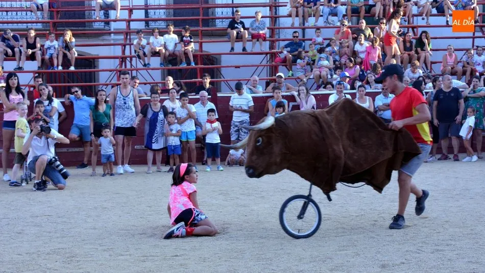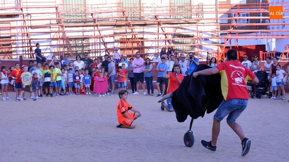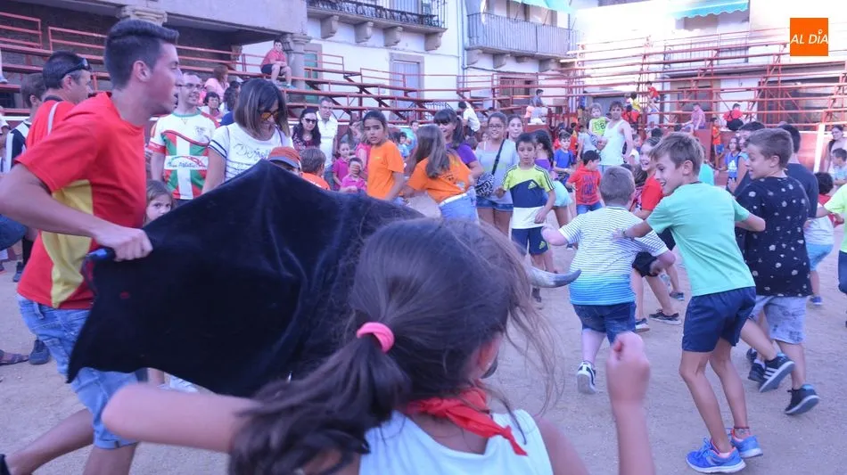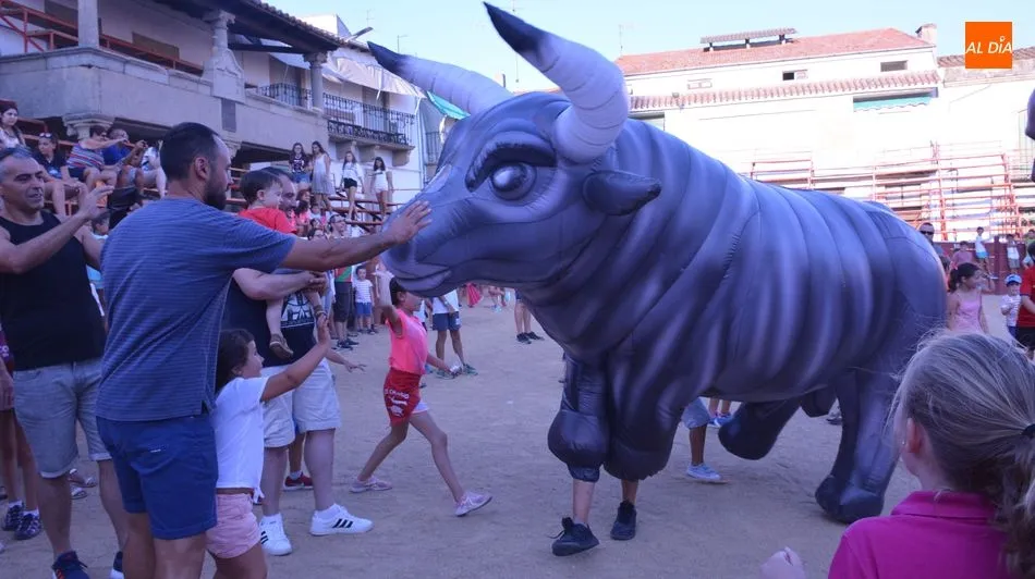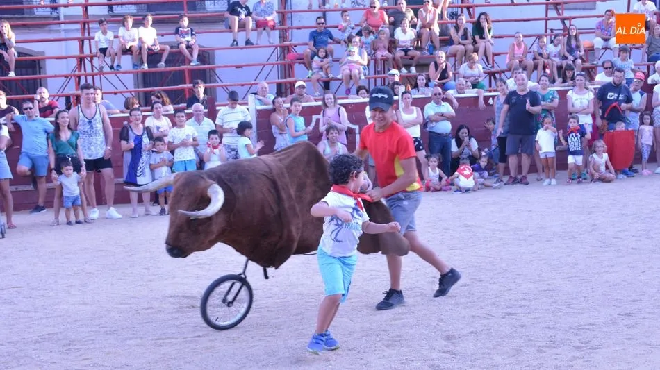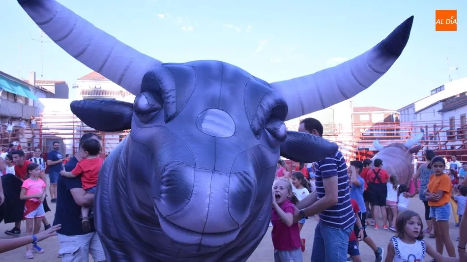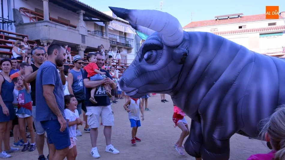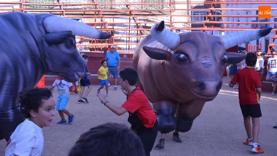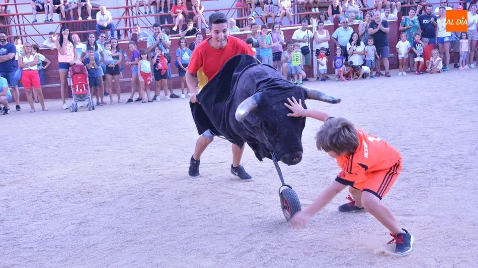 Dos grandes novillos (figuras hinchables) salieron a la calle acompañados de varios carretones persiguiendo a los muchos niños, de todas las edades, que corrieron el encierro hasta el coso taurino montado en la Plaza Mayor. Allí en la arena, novillos y carretones persiguieron a los chavales para diversión de muchos y susto de los más pequeños.
