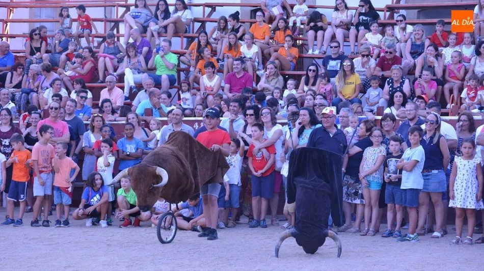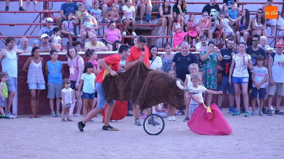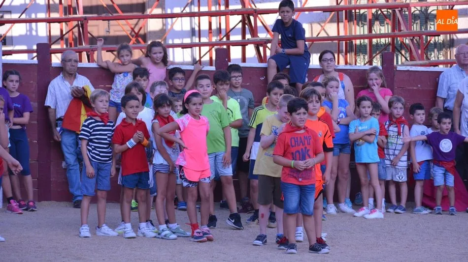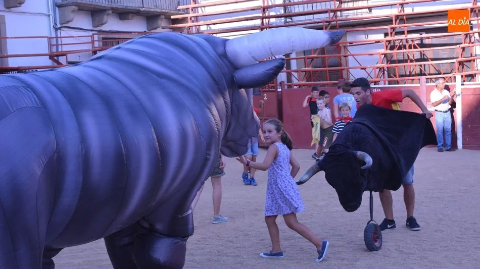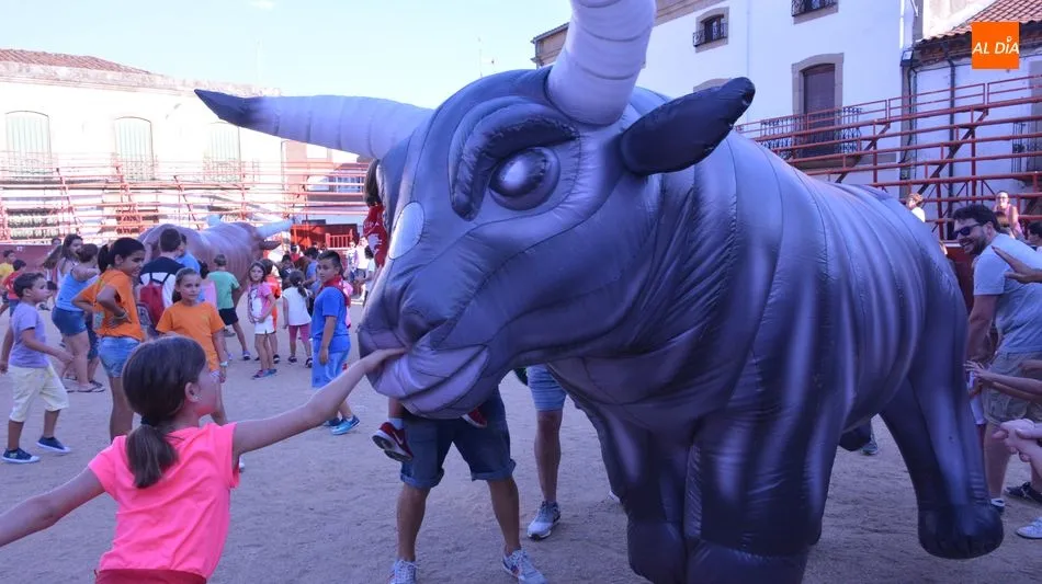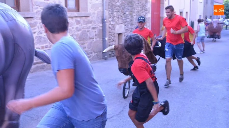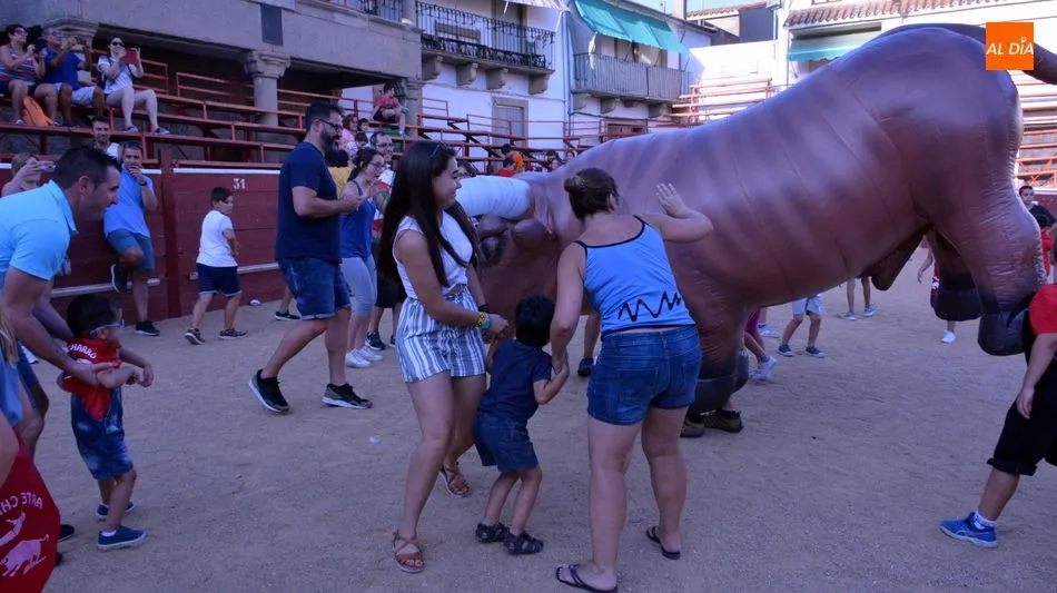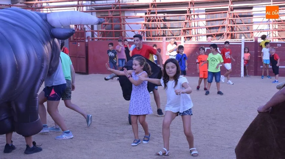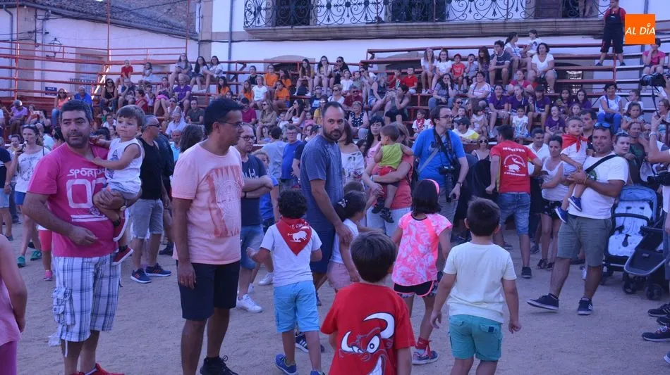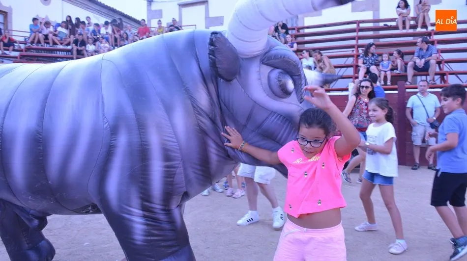Dos grandes novillos (figuras hinchables) salieron a la calle acompañados de varios carretones persiguiendo a los muchos niños, de todas las edades, que corrieron el encierro hasta el coso taurino montado en la Plaza Mayor. Allí en la arena, novillos y carretones persiguieron a los chavales para diversión de muchos y susto de los más pequeños.