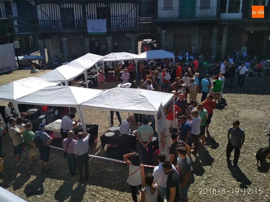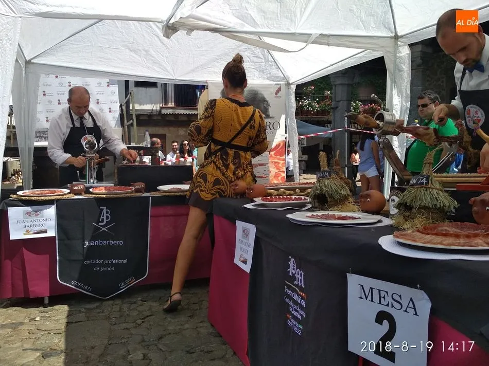 La Alberca ha acogido hoy la tercera edición de su Concurso Nacional de Cortadores de Jamón. La actividad, que además es solidaria, congregó a 8 de los de mejores cortadores del panorama nacional. Se trató de un evento benéfico a favor de la Asociación Española contra el Cáncer en el que el jamón ibérico fue el indiscutible protagonista de la jornada. Se cortaron jamones durante la mañana, vendiéndose los platos a 5 euros cada uno para recaudar fondos. Los cortadores procedían de toda España y estuvieron toda la mañana trabajando para los cientos de personas que se acercaron para degustar el excelente producto y colaborar con la solidaria causa.