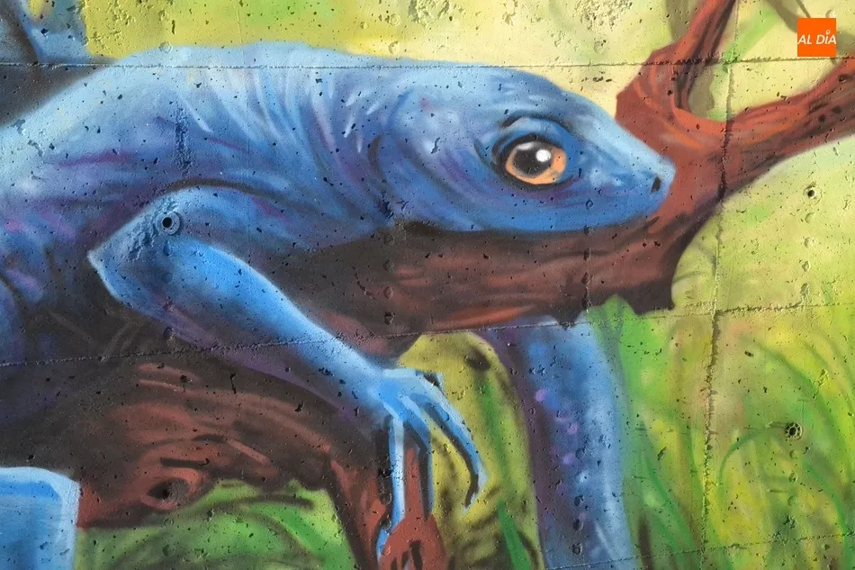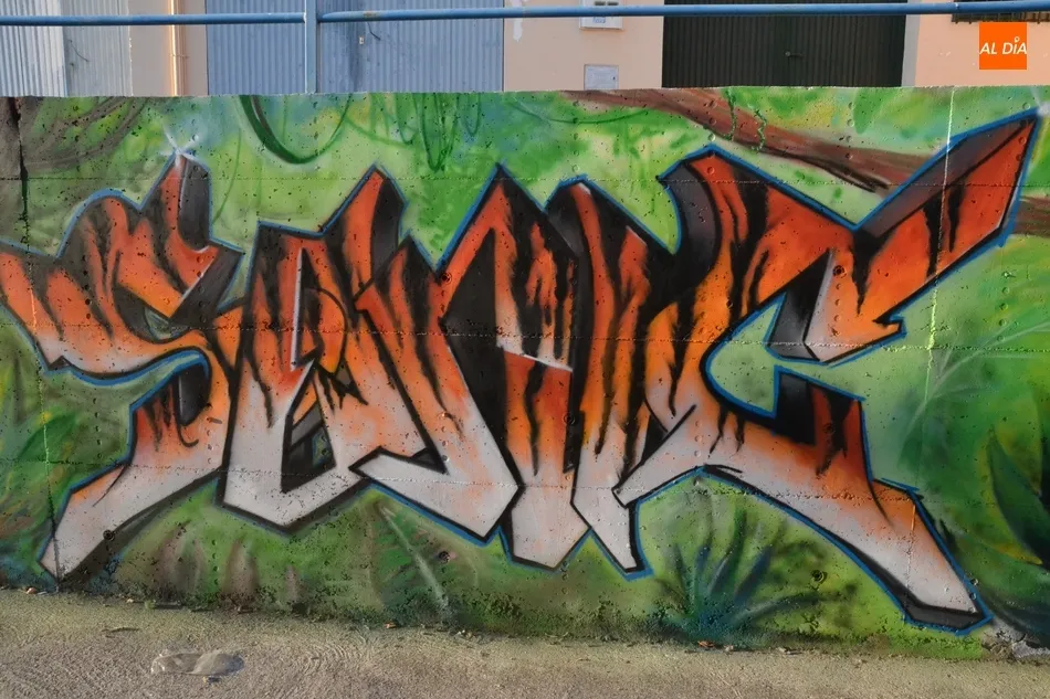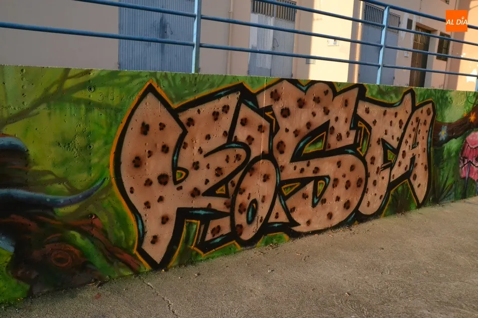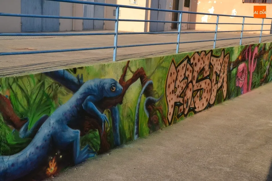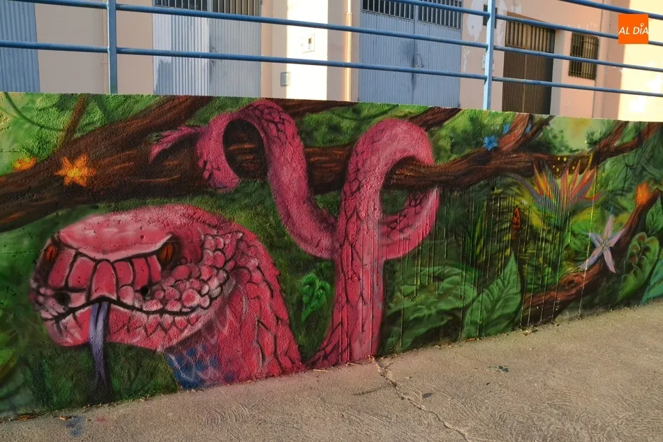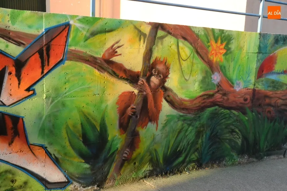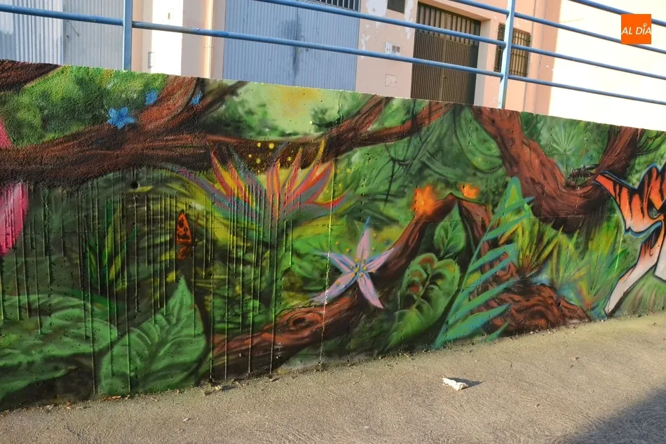 El muro de contención situado junto al Caño El Moro en el Valle de San Martín de Ciudad Rodrigo luce ya al completo el paisaje selvático creado por la Asociación CROMA en el marco de su II Academia de Arte Urbano desarrollada durante esta semana central del mes de agosto.