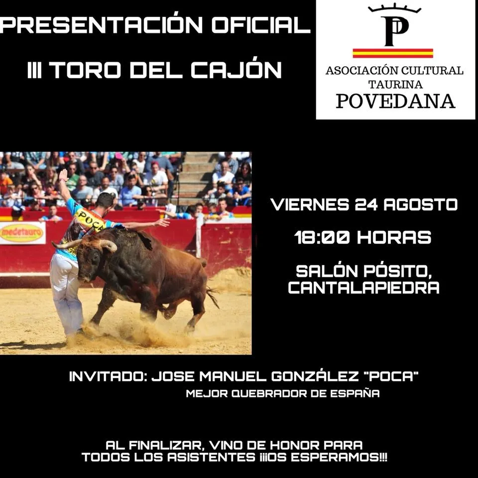 La Asociación Cultural Taurina Povedana presentará su III Toro del Cajón este viernes 24 de agosto. El acto de presentación se celebrará en el Salón Pósito de Cantalapiedra a las 18 horas.