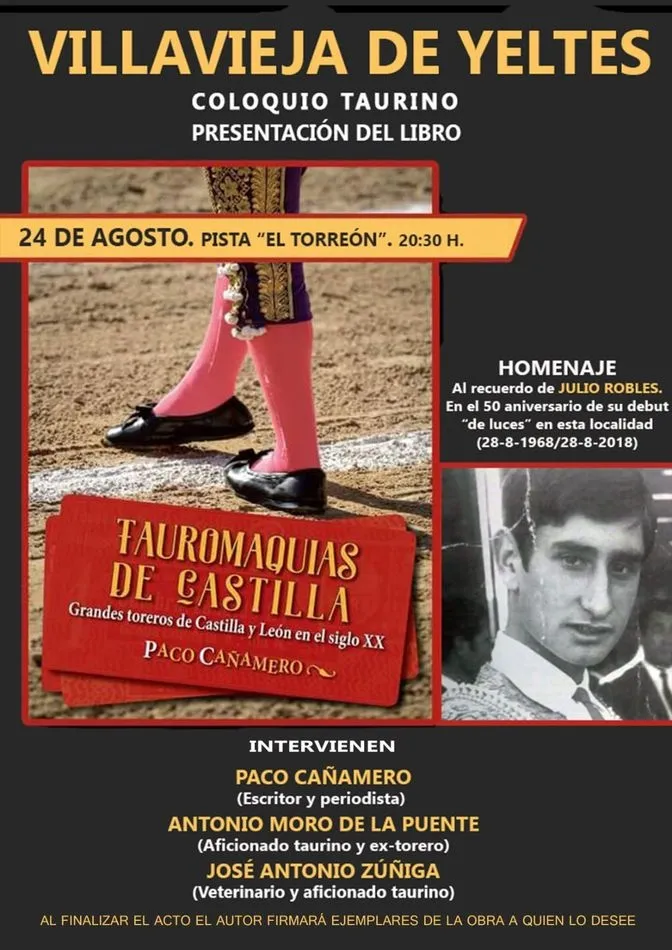 Villavieja de Yeltes celebrará el próximo viernes, 24 de agosto, un coloquio taurino en el que, además de tributar un homenaje y recordar a Julio Robles con motivo del 50 aniversario de su debut de luces en la localidad, se presentará el libro ?Tauromaquias de Castilla. Grandes toreros de Castilla y León en el siglo XX?, escrito por Paco Cañamero.