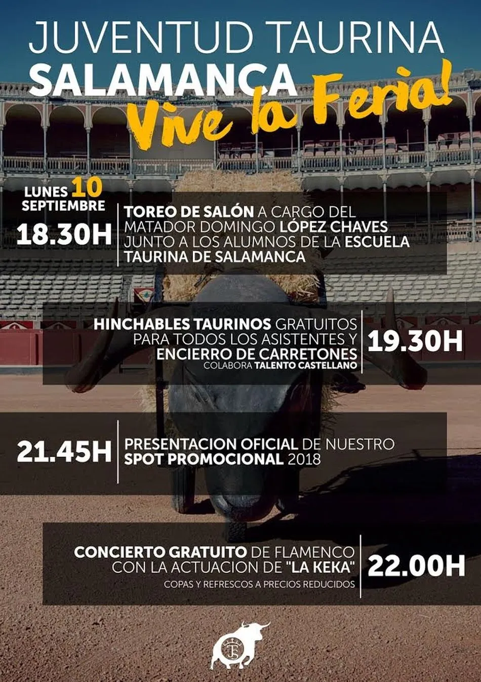 Juventud Taurina de Salamanca ha cerrado, en colaboración con la empresa gerente del coso de La Glorieta, Casa Chopera y Grupo Bal, un elaborado programa para el próximo 10 de septiembre que se celebrará en la plaza de toros de Salamanca ?La Glorieta?. El programa de este año cuenta con una clase de toreo de salón que correrá cargo del diestro salmantino, Domingo López Chaves, junto a los alumnos de la Escuela Taurina de Salamanca. También habrá a disposición de los presentes hinchables gratuitos y un encierro con carretones. La jornada concluirá con la presentación oficial del spot promocional que la Juventud Taurina salmantina que ha editado para la difusión de la Feria de la Virgen de la Vega.