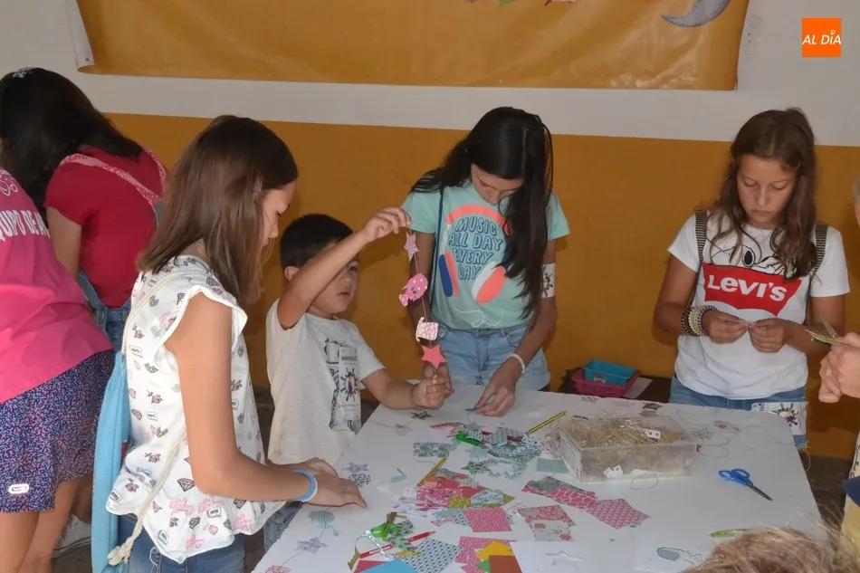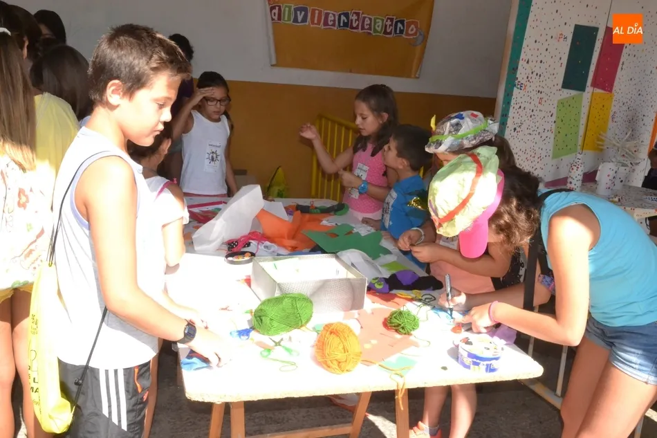Mientras, en los talleres de animación teatral, se entremezclan en las distintas mesas los jóvenes que son monitores con aquellos que forman parte del equipo de apoyo. En la mañana del viernes, los niños continuaron aumentando su colección de objetos hechos en esos talleres, con nuevos títeres de calcetín, de pinza o de bailarina, cajas decoradas, colgantes o móviles.
