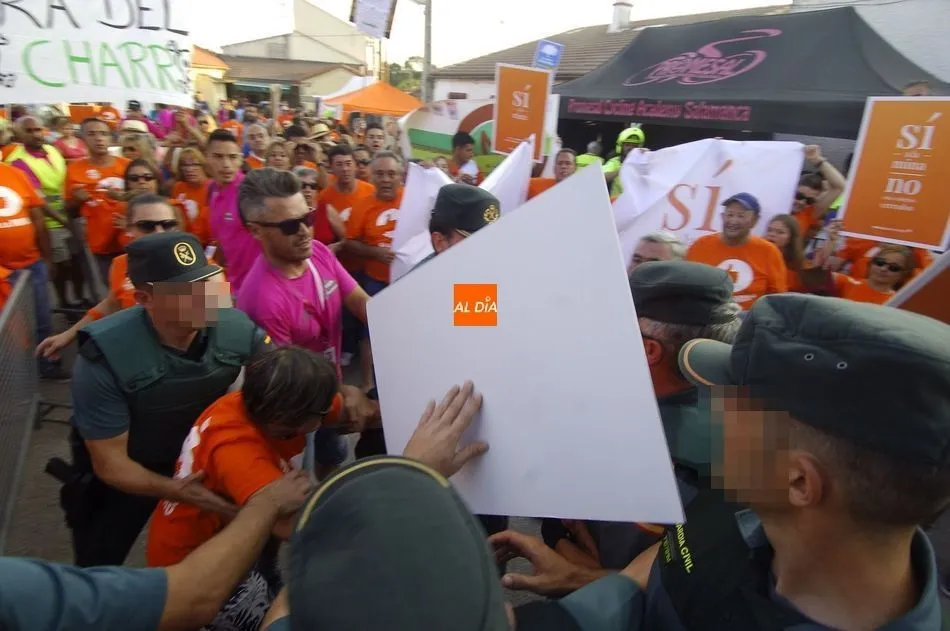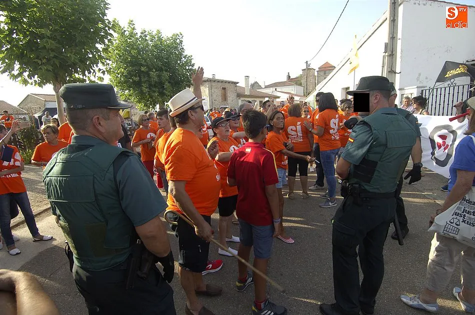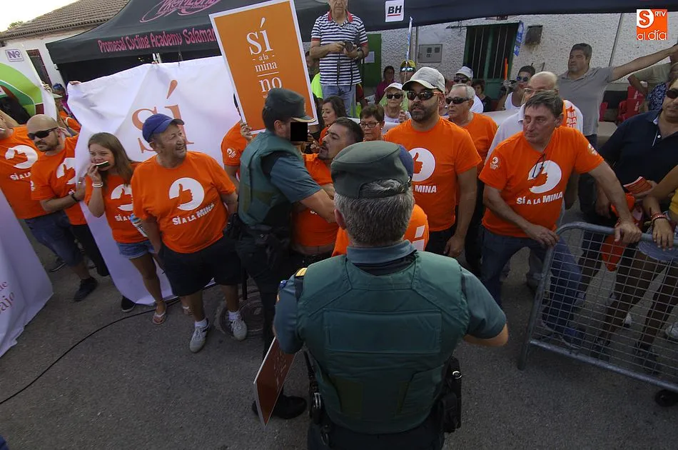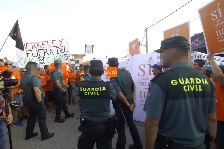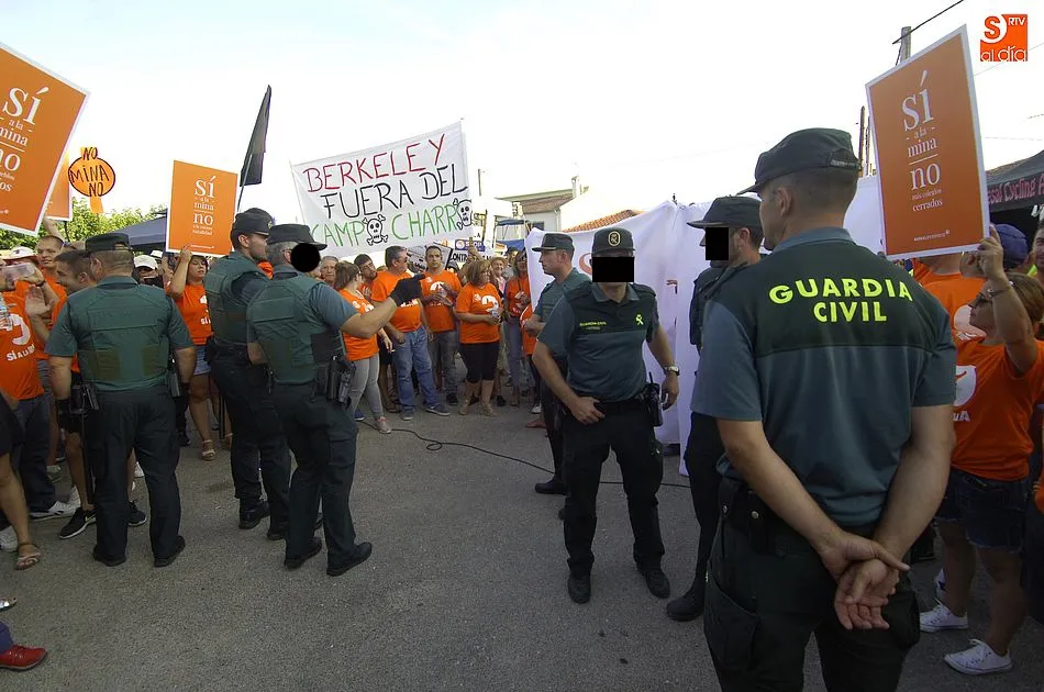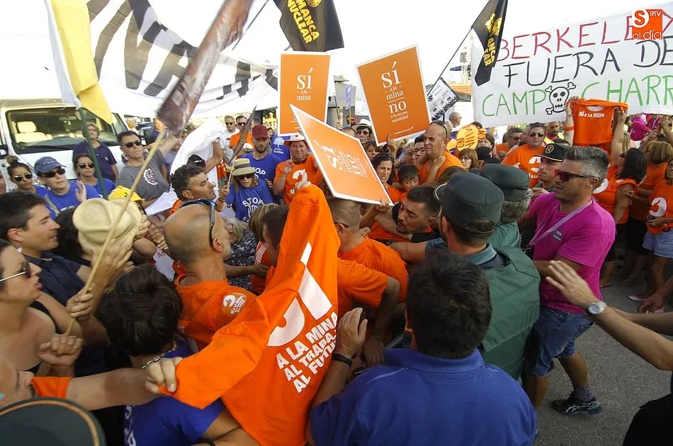 De las palabras estuvo a punto de pasarse a las manos, pero la rápida intervención de la Guardia Civil conseguía aplacar los ánimos de unos y otros, que se enfrentaron verbalmente subiendo de tono a medida que pasaban los minutos. Y es que la tensión iba creciendo por momentos pues los anti mina trataban de tapar la publicidad de Berkeley Minera España ante la resistencia de los partidarios de la mina. Sin embargo, al final la Benemérita tenía que intervenir porque ambos bandos se volvían a acalorar.