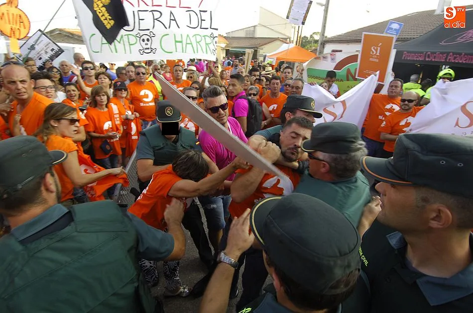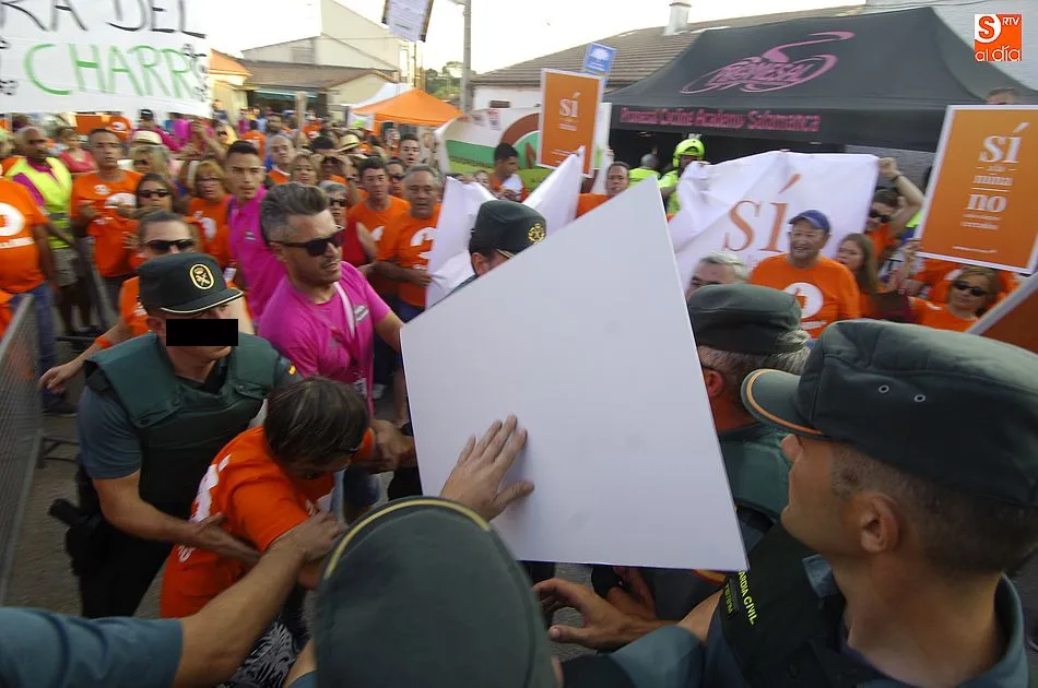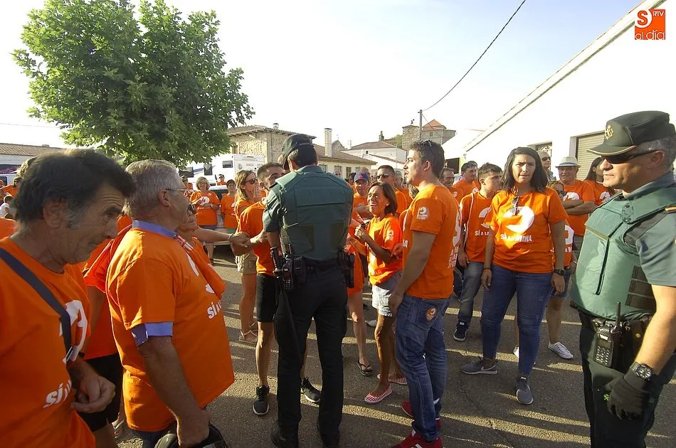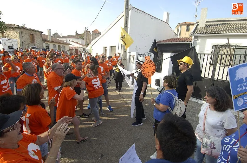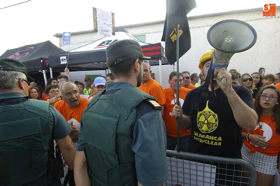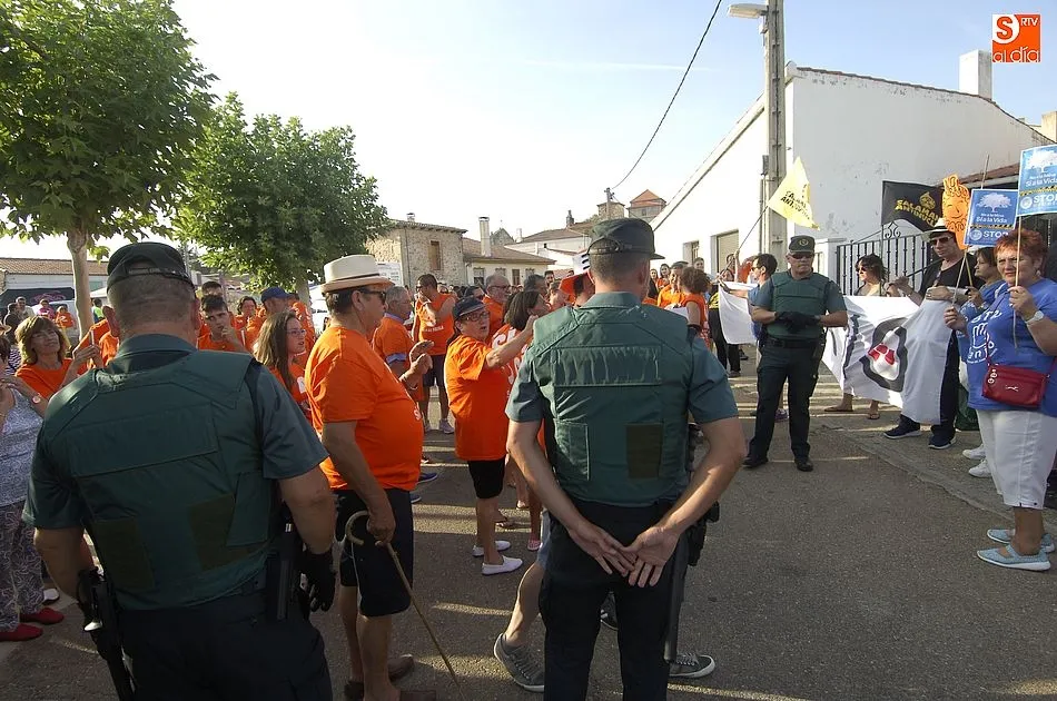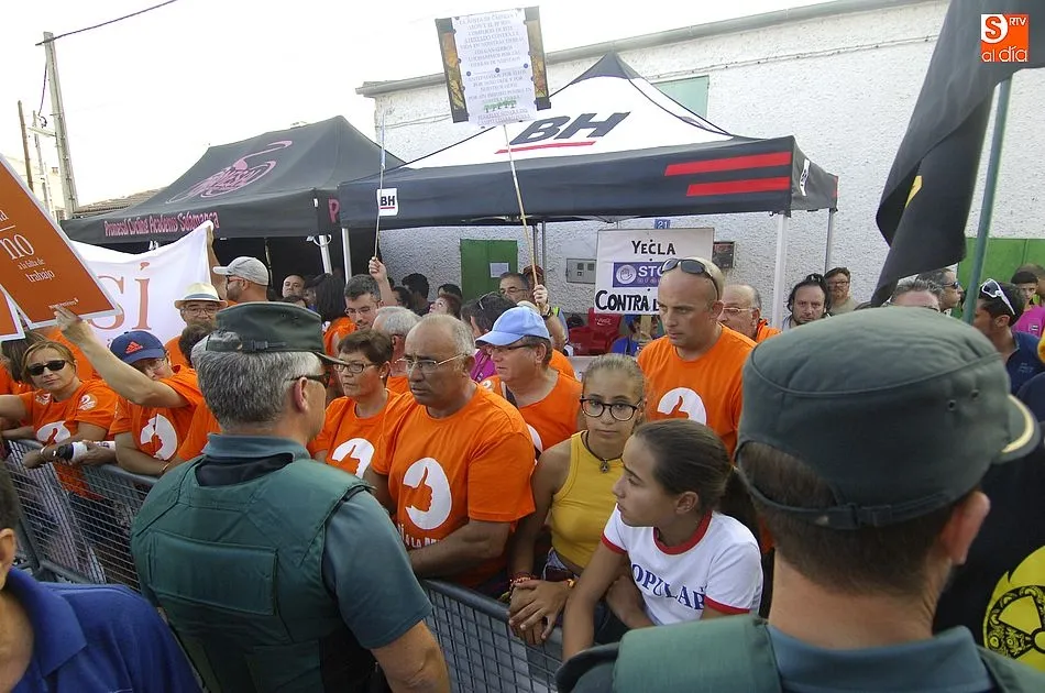 A eso de las siete de la tarde empezaron a llegar los ?anti nucleares? o la plataforma en contra de Berkeley, fue entonces cuando unos a cada lado de la plaza expresaron a gritos sus pareceres y versiones totalmente diferentes en contra y a favor de la mina, viviendose momentos de tensión minutos ante de la llegada de la segunda etapa de la Vuelta Ciclista a Salamanca,