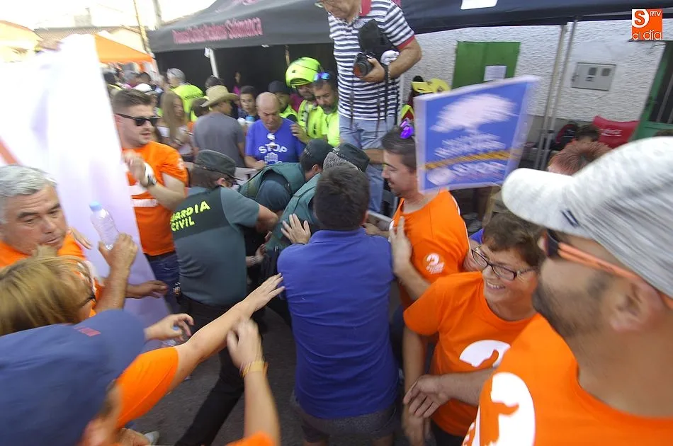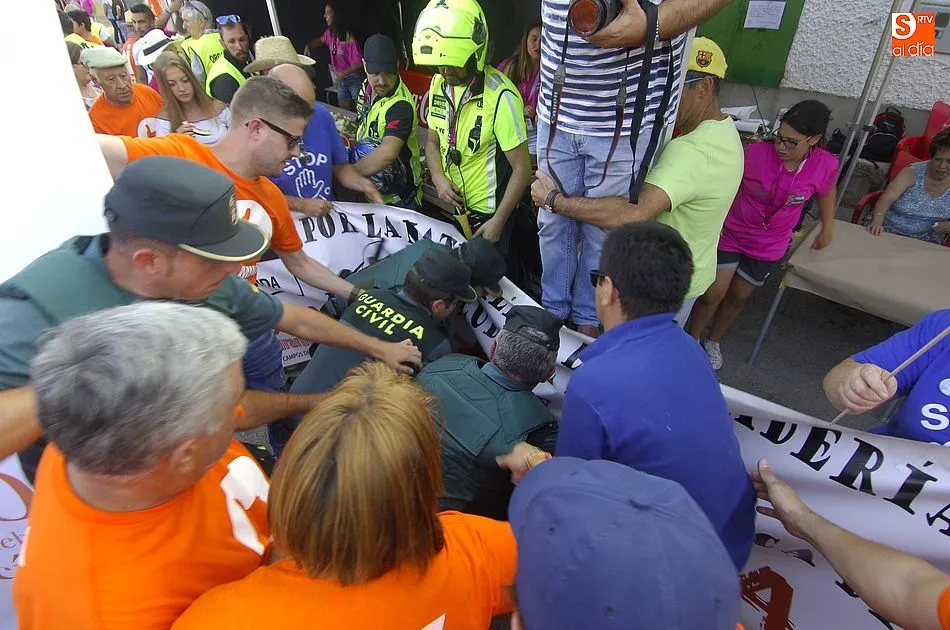 La entrega de premios también estuvo marcada por los gritos de protesta de los manifestantes, teniendo que acudir de refuerzo los Guardias Civiles que acompañaban a los cilistas durante la etapa.