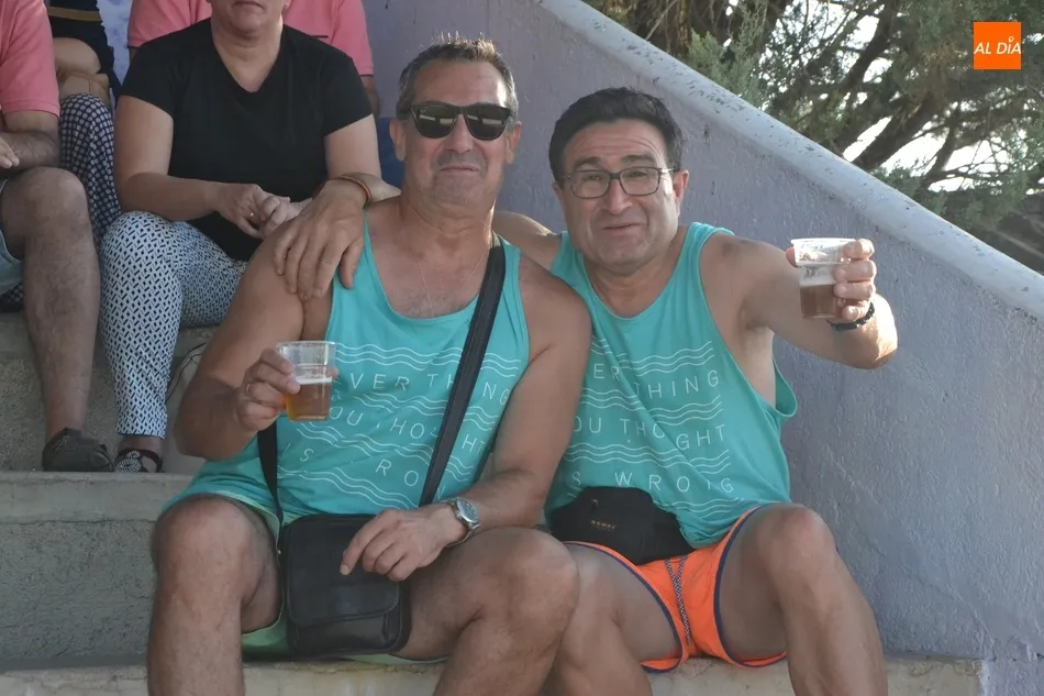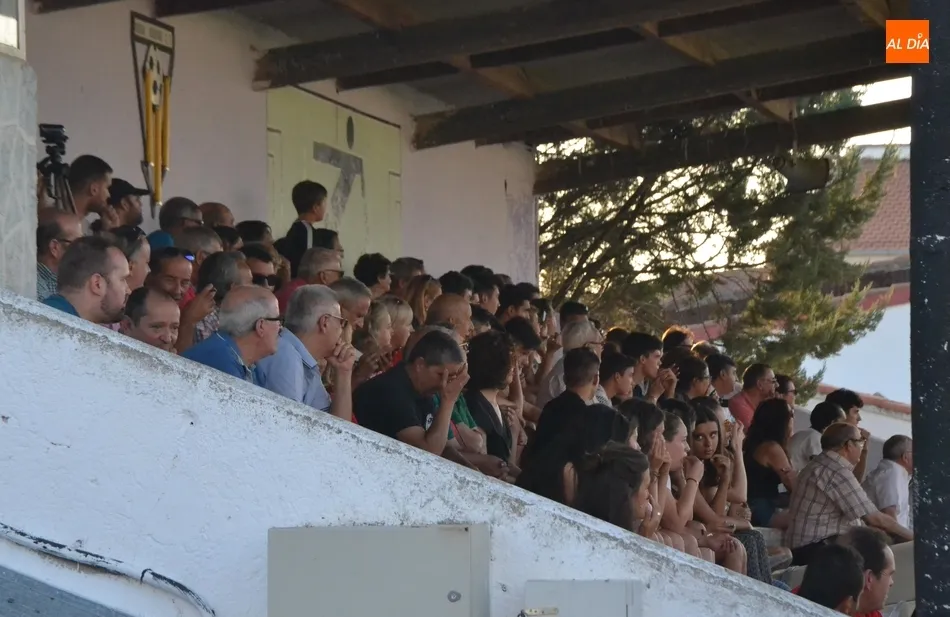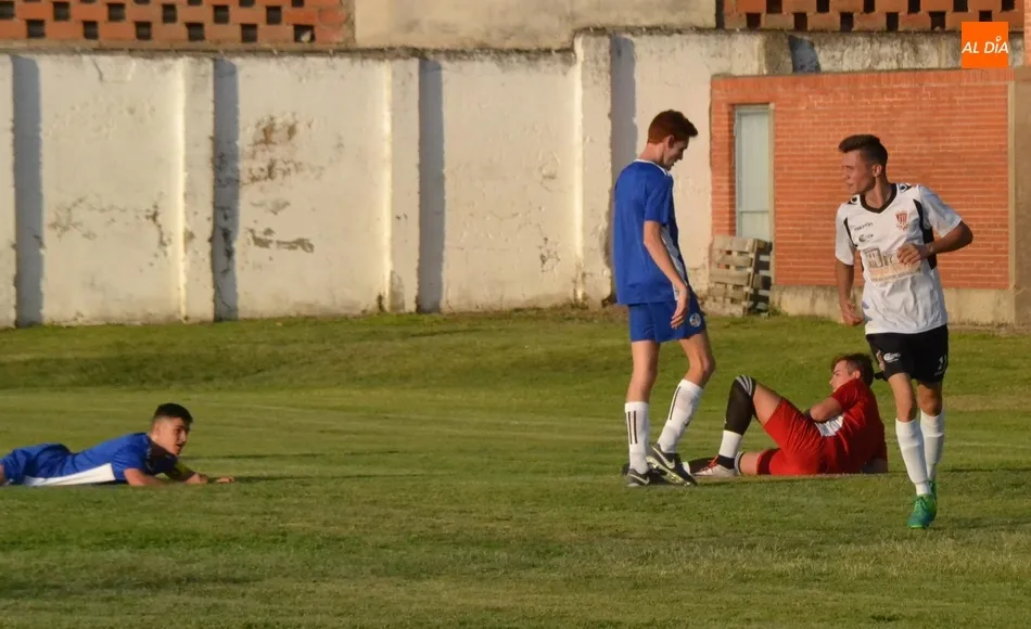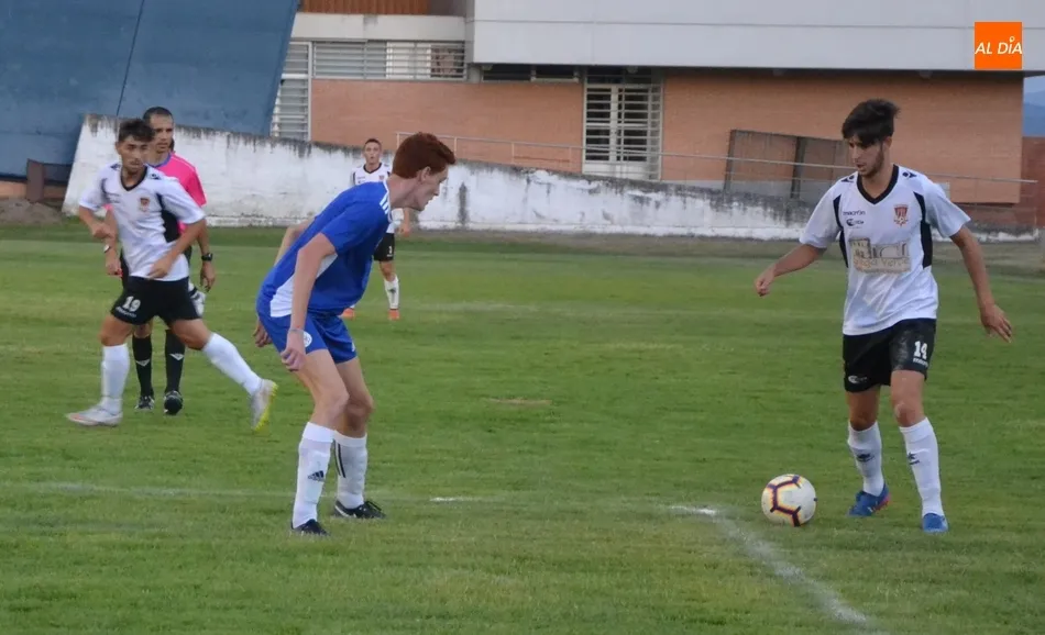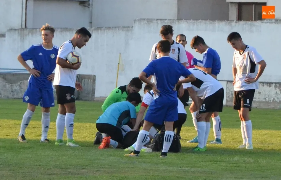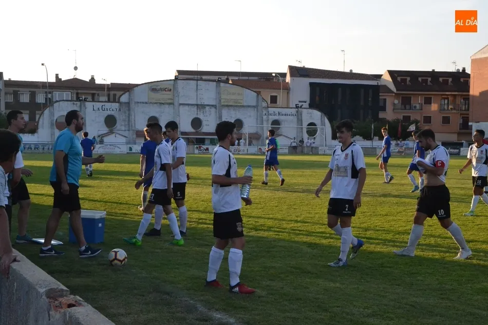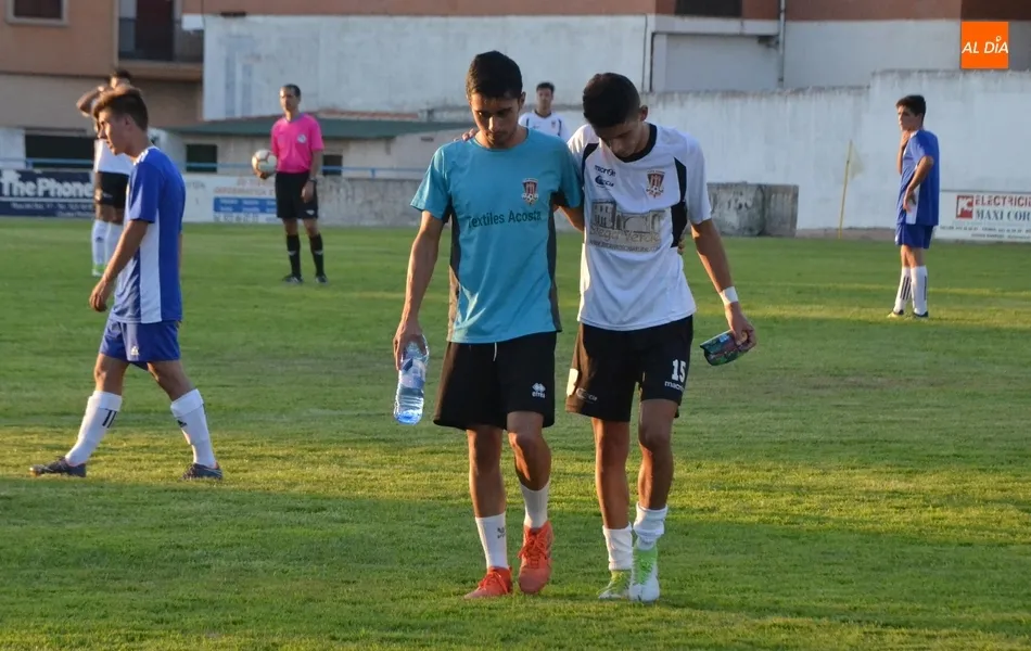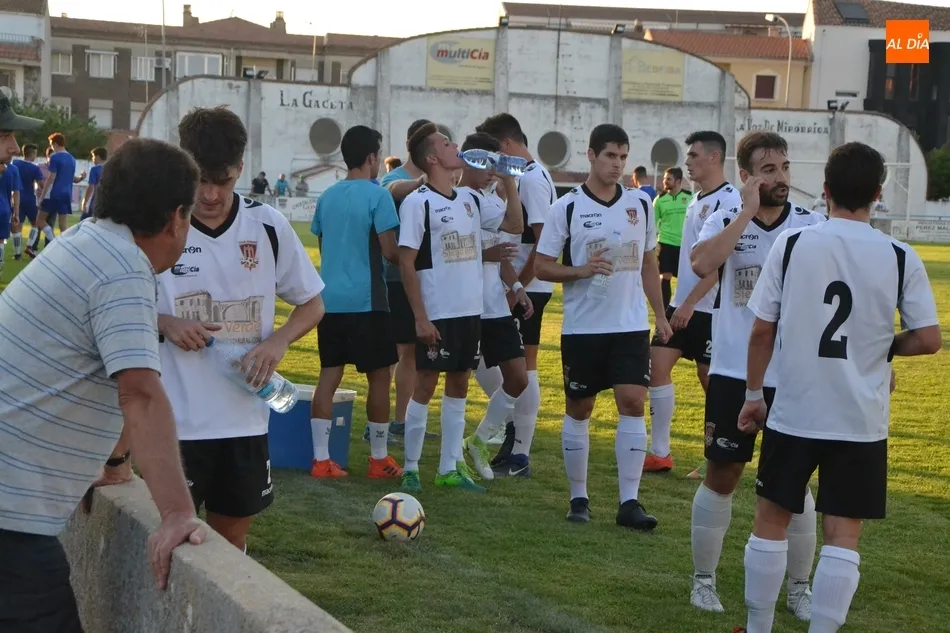 Buena imagen del Ciudad Rodrigo en su primer amistoso en casa   | Imagen 2A partir de ahí el partido bajó un poco de revoluciones, más aún tras tener lugar dos parones: uno para beber agua en el 28? (el famoso ?cooling break? por el calor), y cinco minutos después, para atender a Omar, que estaba mareado y tuvo que dejar el campo. En lo que quedaba de primer tiempo, el Ciudad Rodrigo tiró un par de veces más, de la mano de Maza ?el balón se perdió fuera- y Dani ?atrapándola el portero tras tocar en un defensa por el camino-.