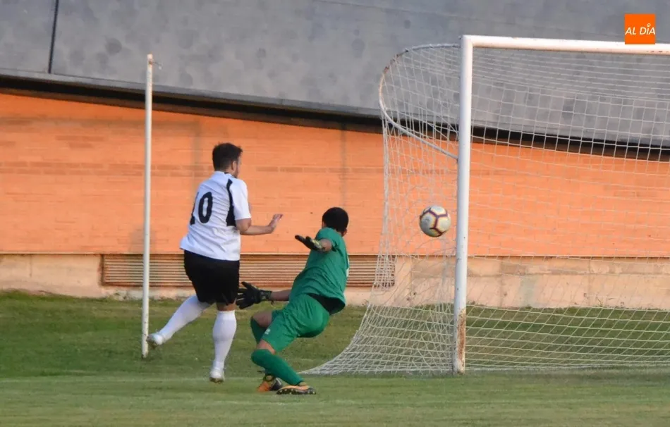 El gol por fin llegó en el 33?, en otra larga acción de ataque mirobrigense (que se inició con un saque de esquina), que acabó por resolver Maza con un tiro más o menos desde la frontal que describió una parábola hacia el palo derecho (rozando quizás a un jugador visitante por el camino). La alegría del Ciudad Rodrigo duró poco, ya que al minuto siguiente, se hicieron un lío atrás a la hora de sacar el balón, y se cometió un claro penalty que Unionistas mandó al fondo de la red haciendo inútil la estirada hacia el lado correcto de José Ángel.