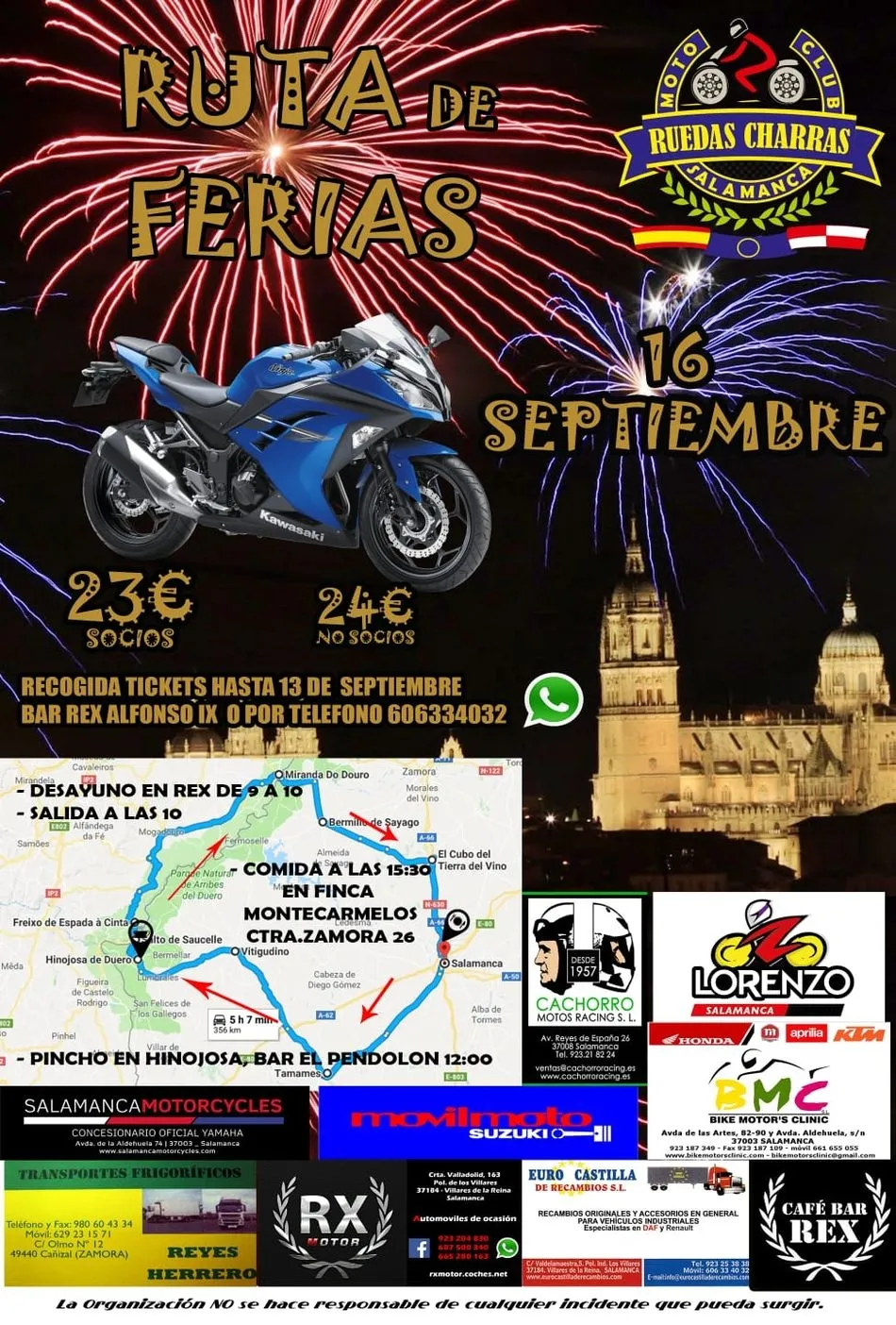 Los moteros de Salamanca conquistarán las carreteras de la provincia el 16 de septiembre        | Imagen 1Salamanca ya tiene todo preparada para su próxima cita motera. Con motivo de la celebración de las ferias y fiestas de la capital, el Motoclub Ruedas Charras ha preparada un evento dirigido a todos los amantes de la carretera y el motor. La jornada está programada para el domingo 16 de septiembre y propone a todos los aficionados a las motos una ruta que partirá desde el bar ?Rex?, en Avenida Alfonso IX, a las 10.00 horas.