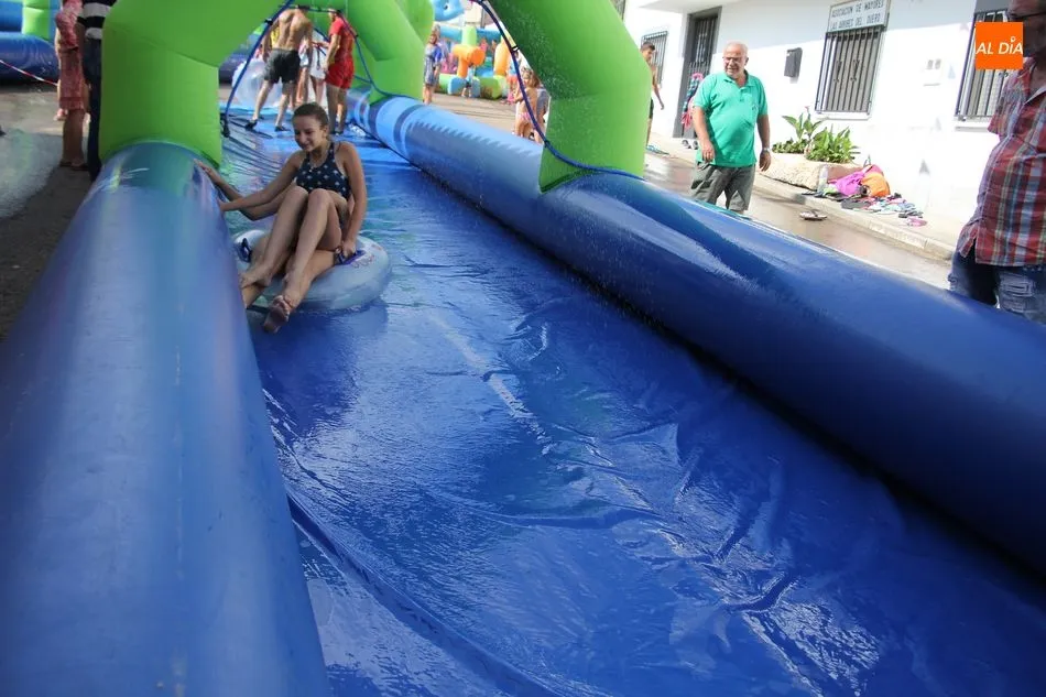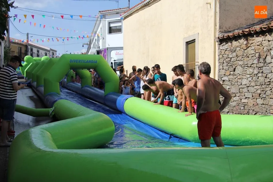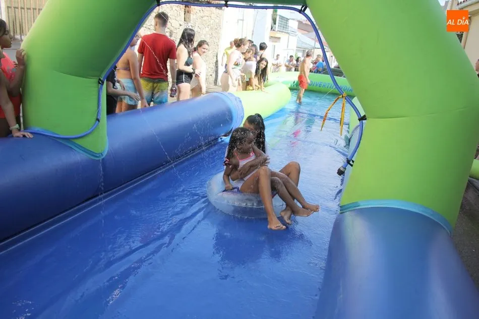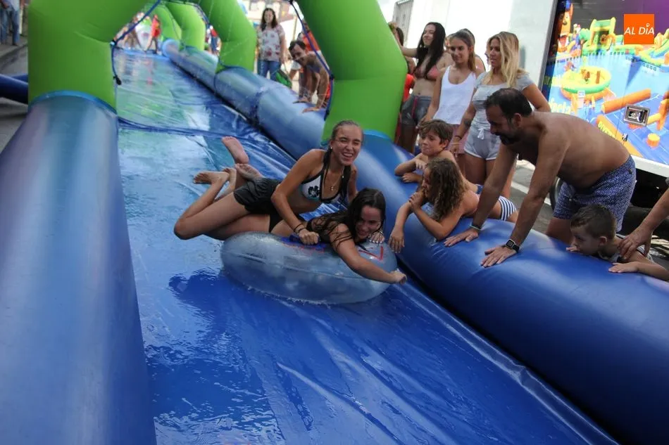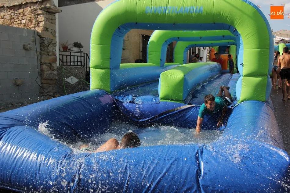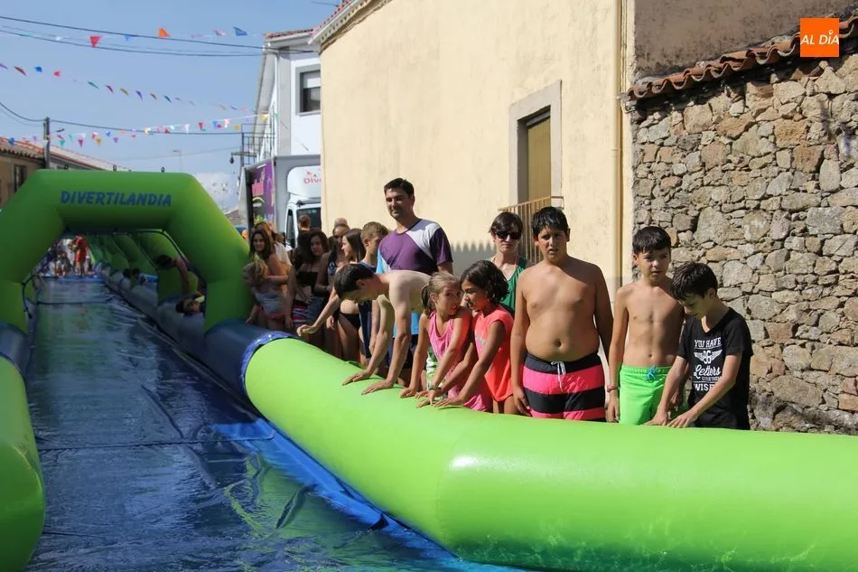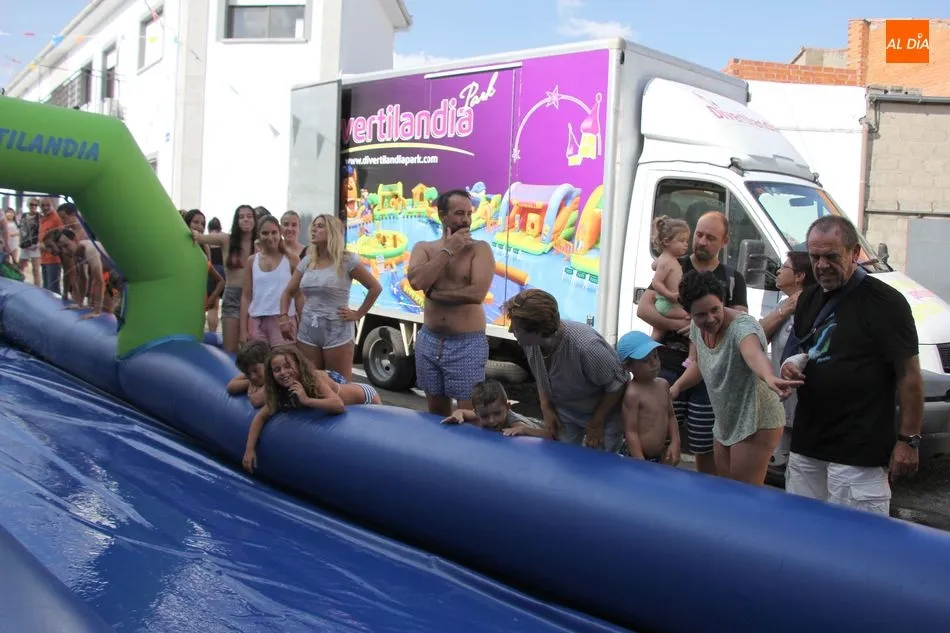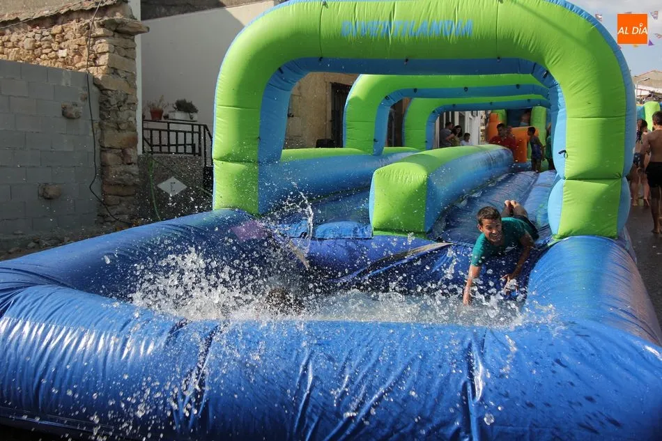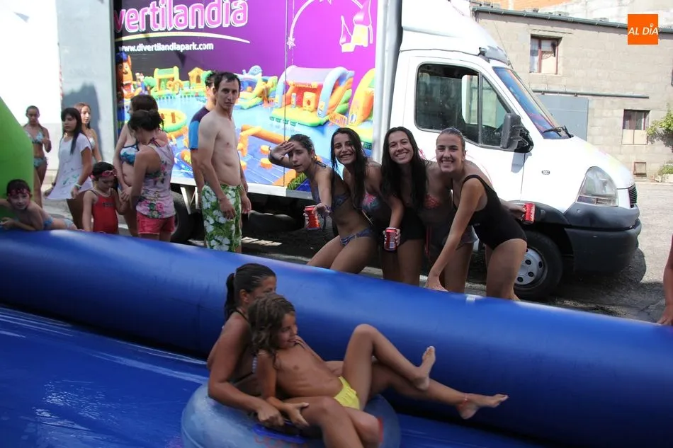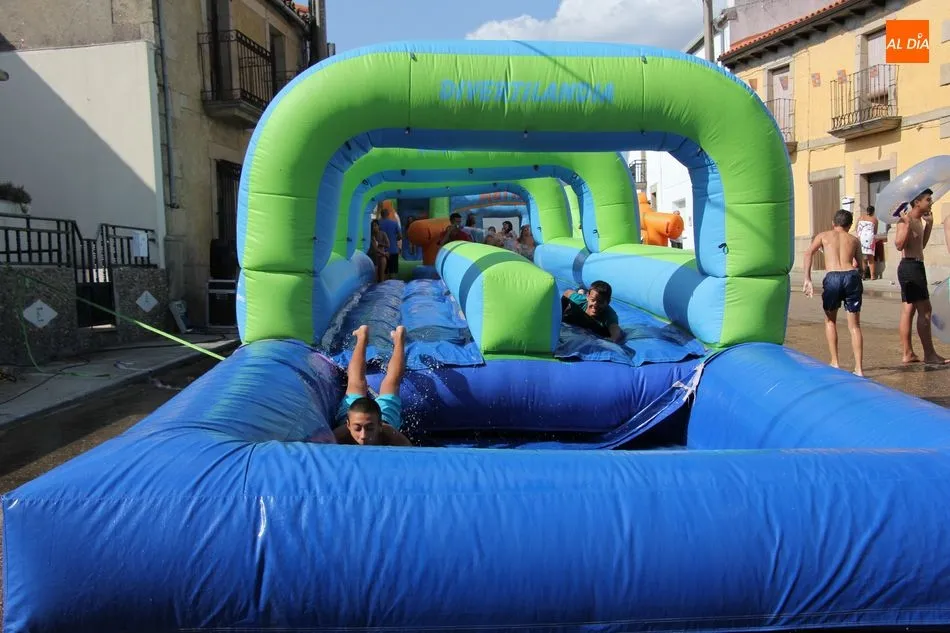 En Pereña de la Ribera ya se empieza a notar ambiente de fiesta. Gran animación la que se podía ver este miércoles con un gran parque infantil acuático y un tobogán de 50 metros que hizo las delicias no solo de los más pequeños, pues los mayores también disfrutaron, si no más, de esta moderna ?resbalina? instalada en la plaza del Caño y la calle 14 de mayo, y que tanto éxito está teniendo en las fiestas de los pueblos de la comarca.