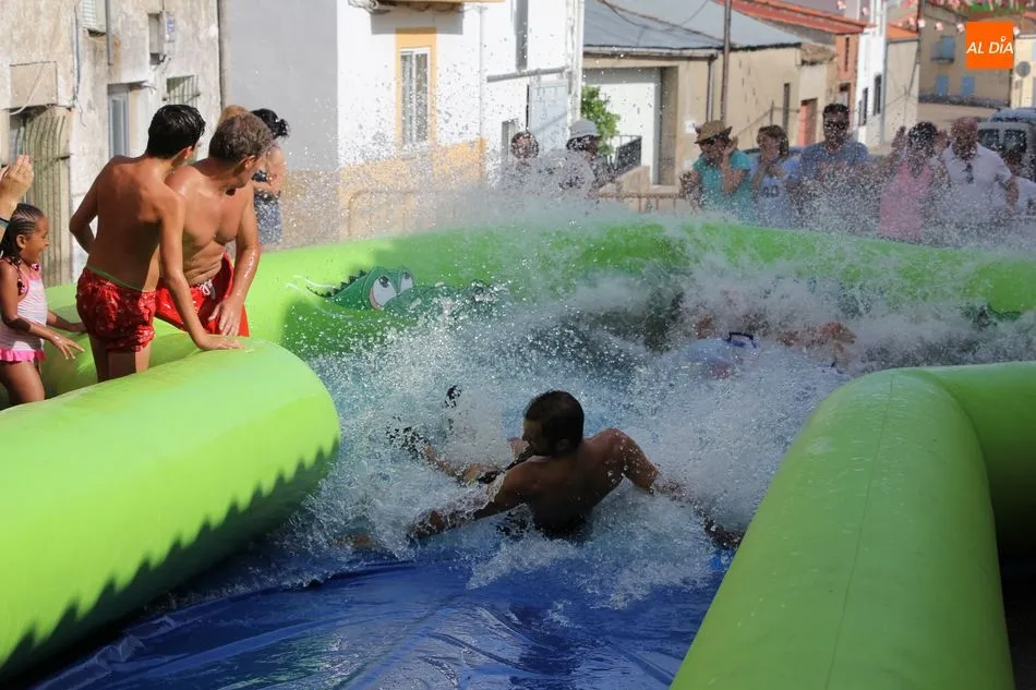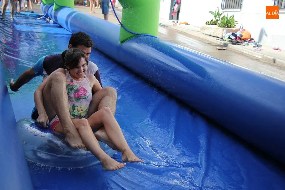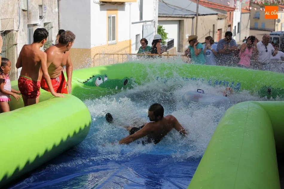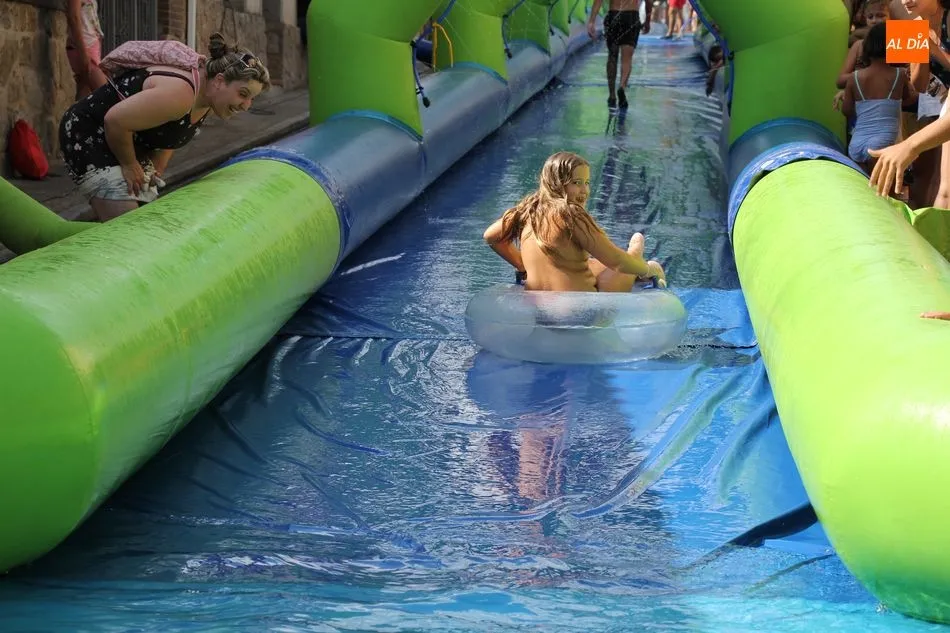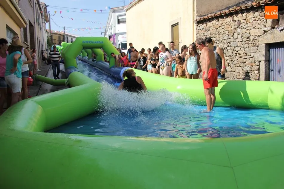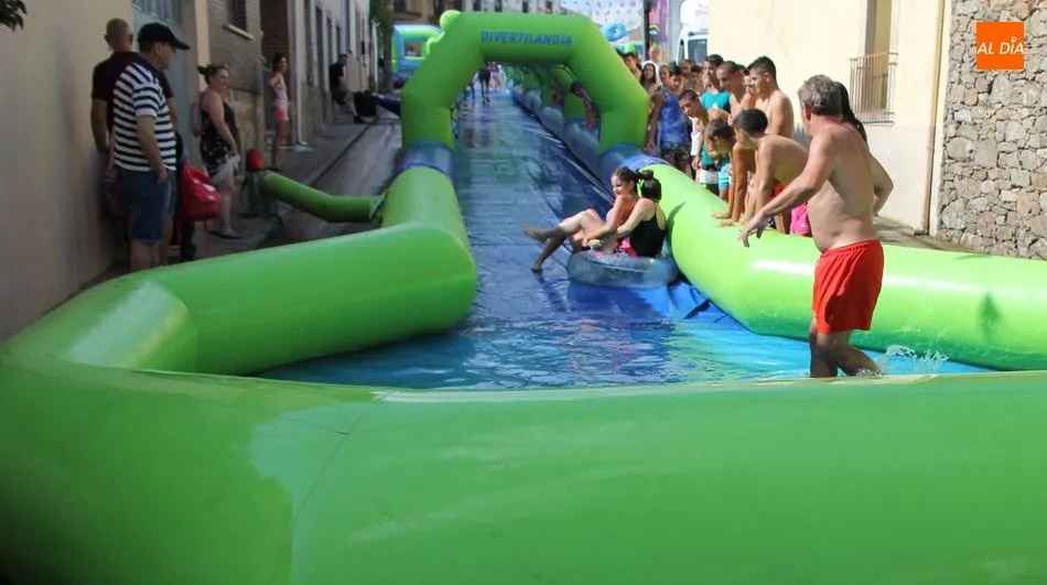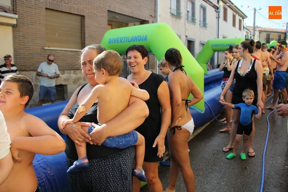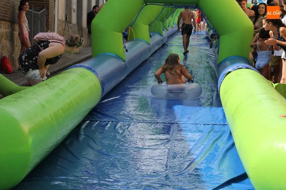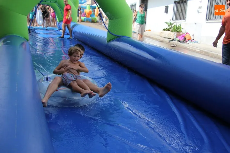 En Pereña de la Ribera ya se empieza a notar ambiente de fiesta. Gran animación la que se podía ver este miércoles con un gran parque infantil acuático y un tobogán de 50 metros que hizo las delicias no solo de los más pequeños, pues los mayores también disfrutaron, si no más, de esta moderna ?resbalina? instalada en la plaza del Caño y la calle 14 de mayo, y que tanto éxito está teniendo en las fiestas de los pueblos de la comarca.