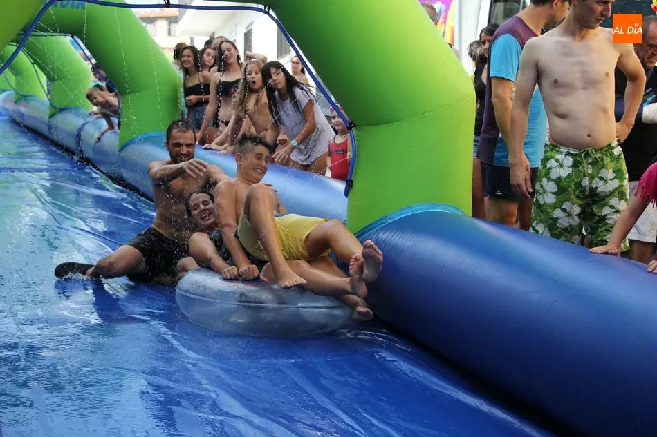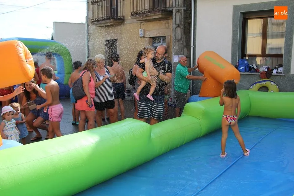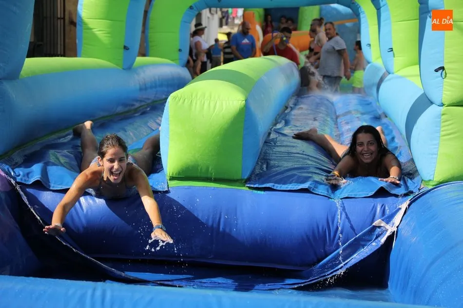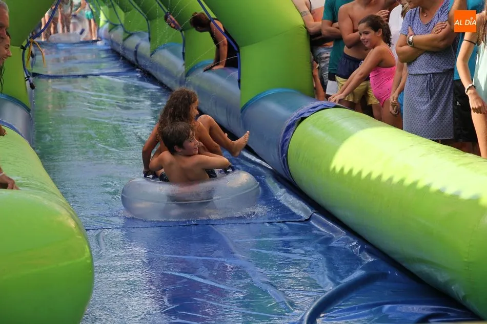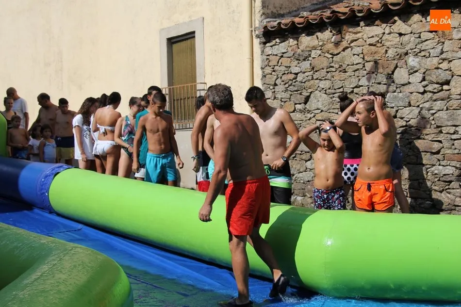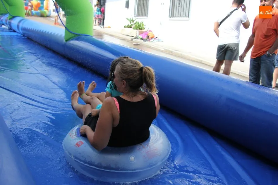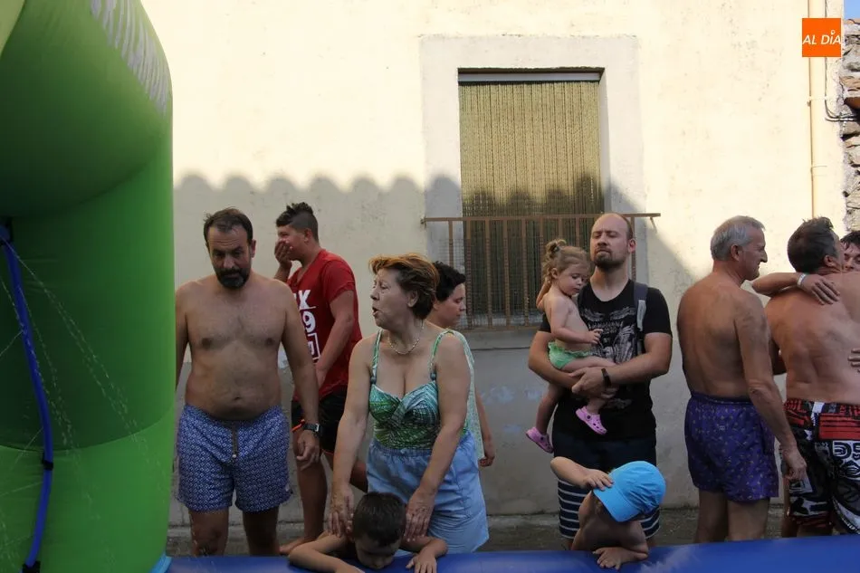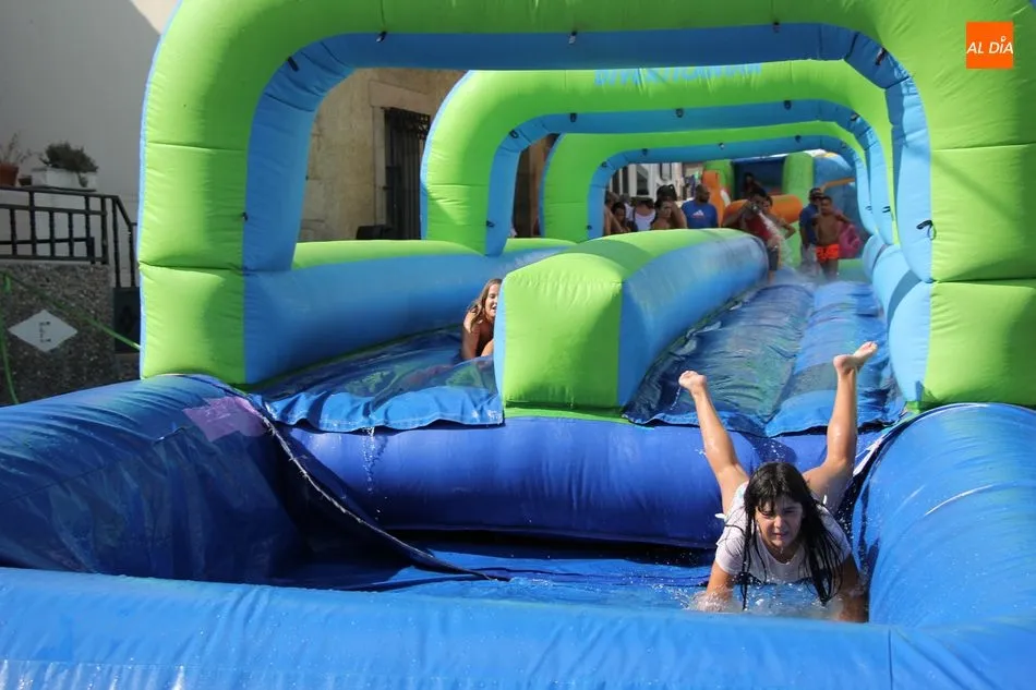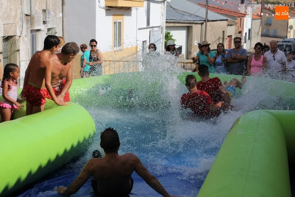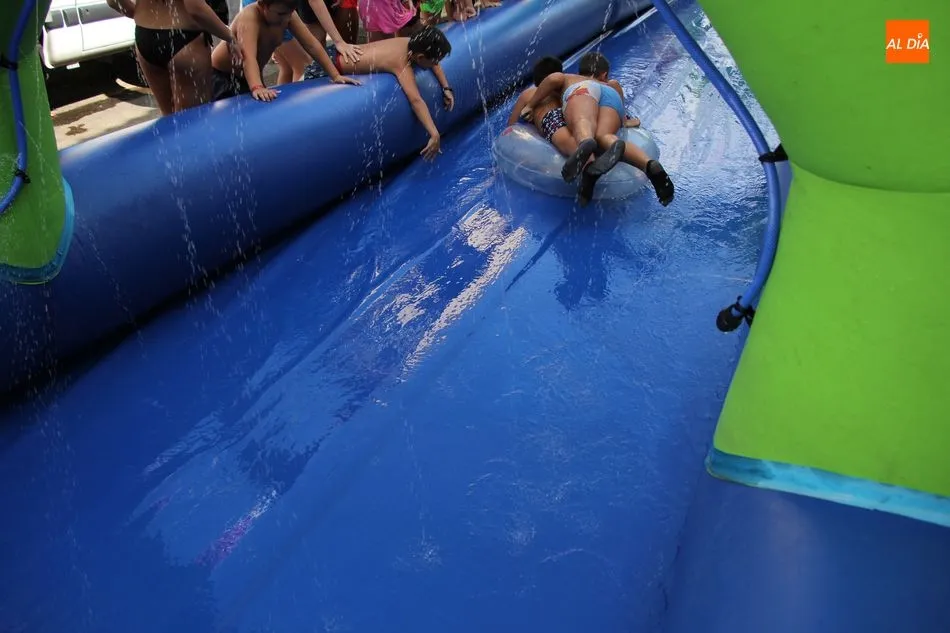 En Pereña de la Ribera ya se empieza a notar ambiente de fiesta. Gran animación la que se podía ver este miércoles con un gran parque infantil acuático y un tobogán de 50 metros que hizo las delicias no solo de los más pequeños, pues los mayores también disfrutaron, si no más, de esta moderna ?resbalina? instalada en la plaza del Caño y la calle 14 de mayo, y que tanto éxito está teniendo en las fiestas de los pueblos de la comarca.