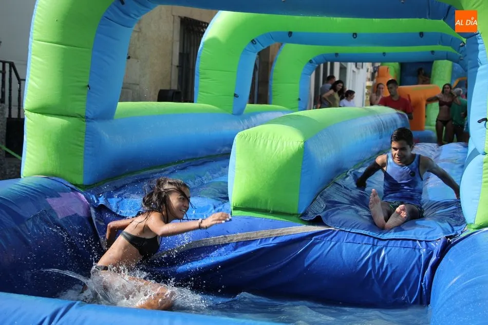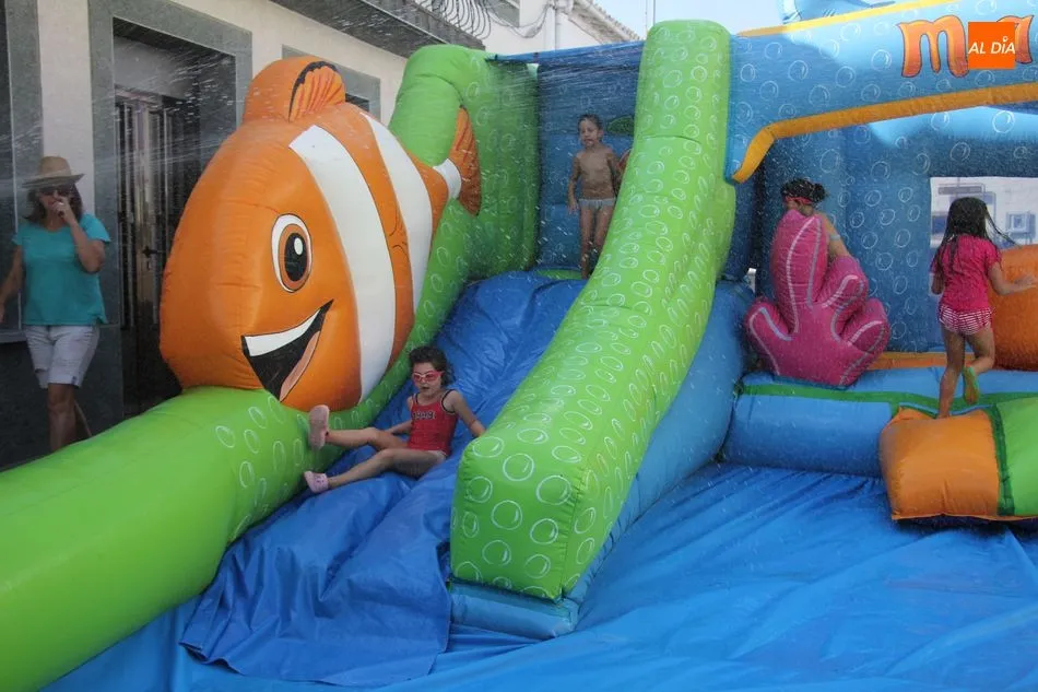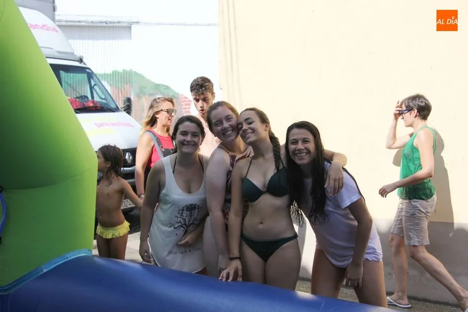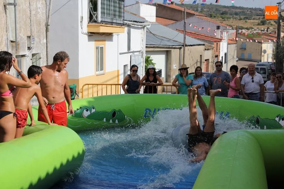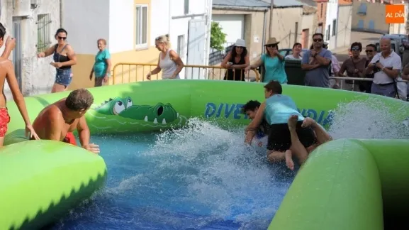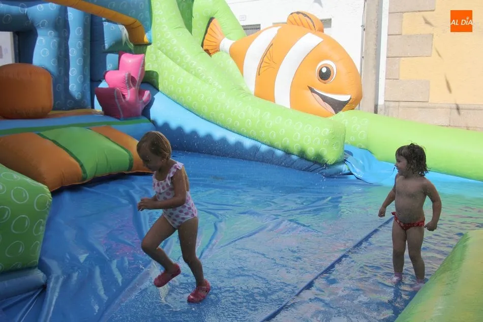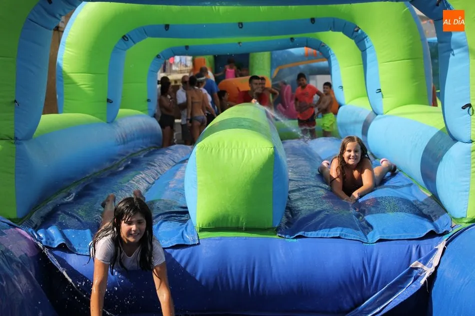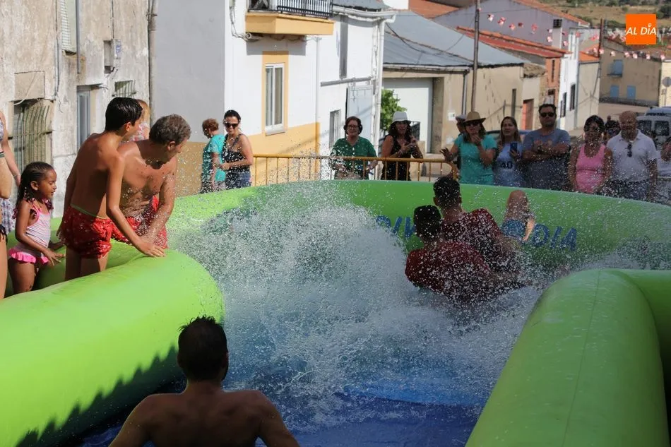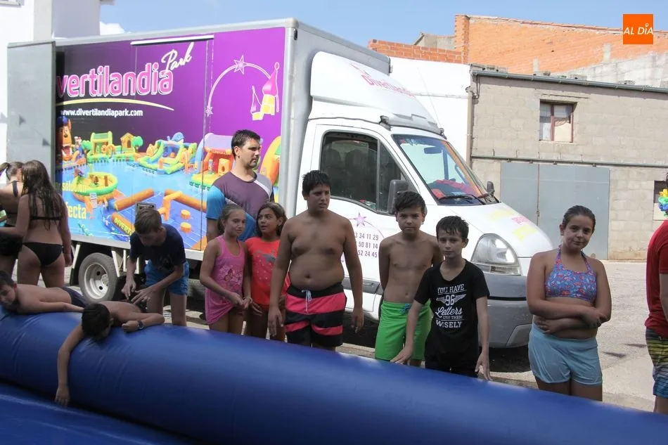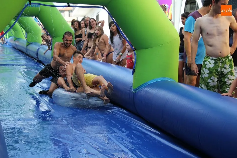 En Pereña de la Ribera ya se empieza a notar ambiente de fiesta. Gran animación la que se podía ver este miércoles con un gran parque infantil acuático y un tobogán de 50 metros que hizo las delicias no solo de los más pequeños, pues los mayores también disfrutaron, si no más, de esta moderna ?resbalina? instalada en la plaza del Caño y la calle 14 de mayo, y que tanto éxito está teniendo en las fiestas de los pueblos de la comarca.