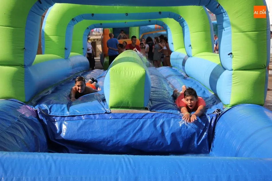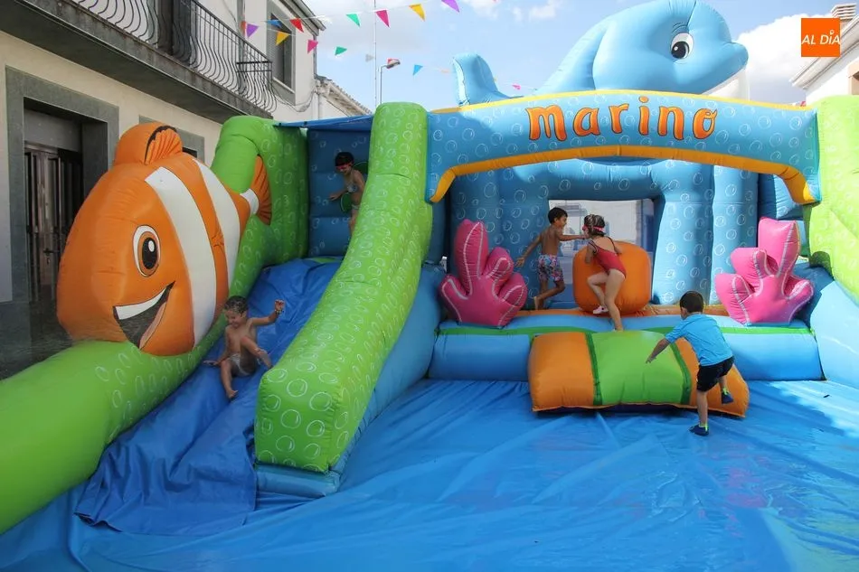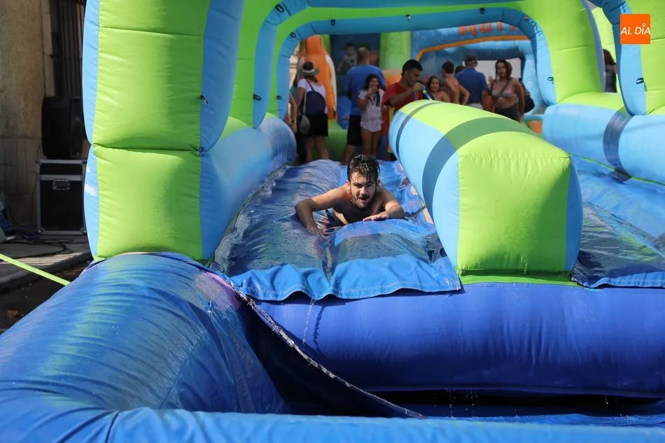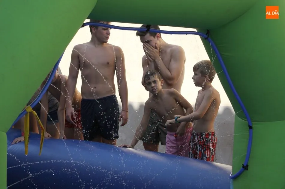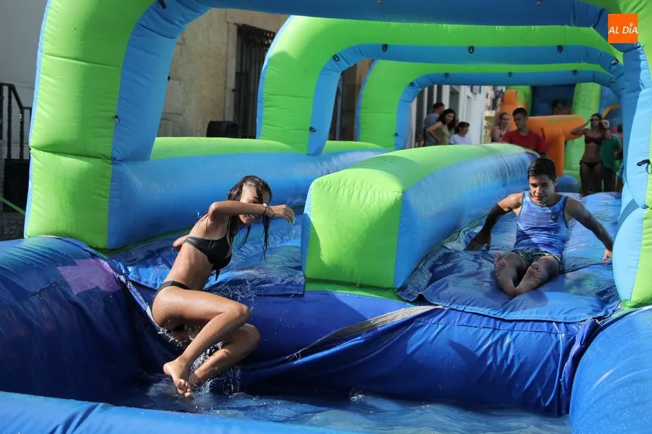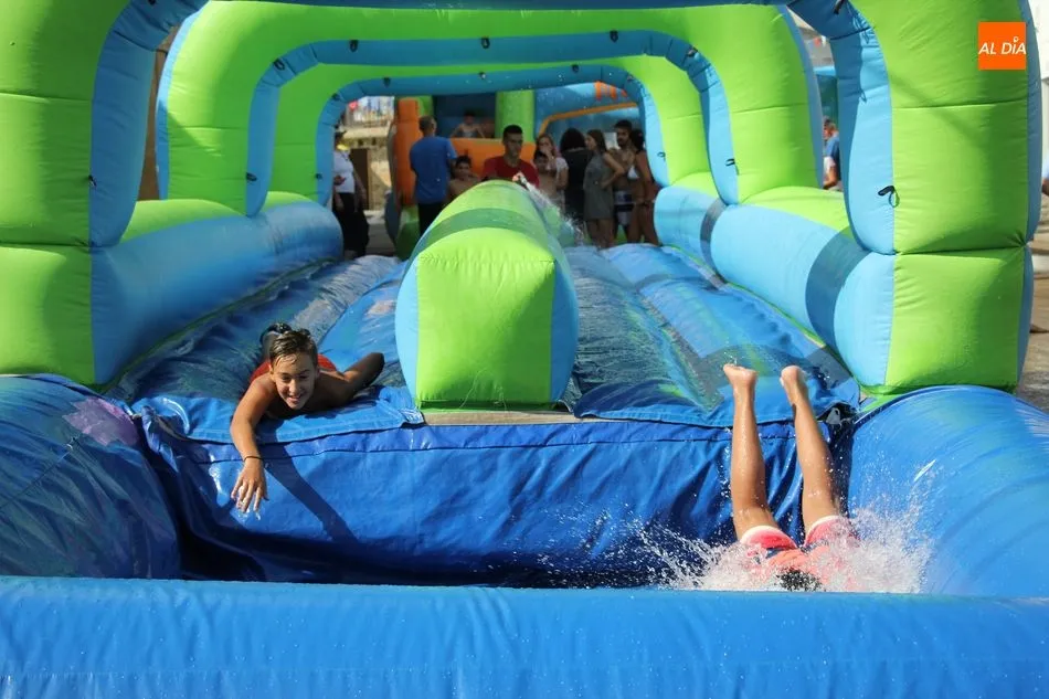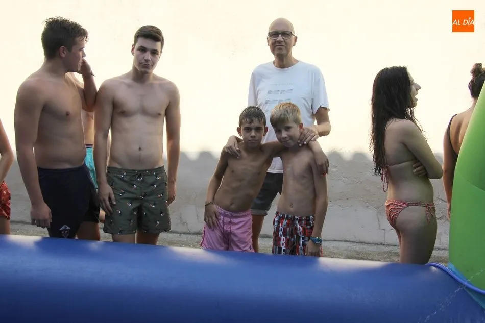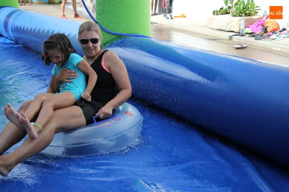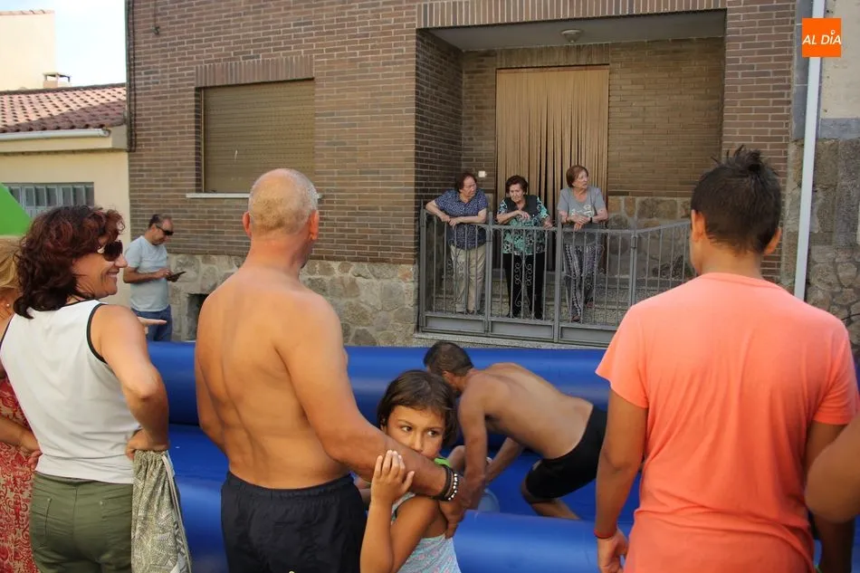En Pereña de la Ribera ya se empieza a notar ambiente de fiesta. Gran animación la que se podía ver este miércoles con un gran parque infantil acuático y un tobogán de 50 metros que hizo las delicias no solo de los más pequeños, pues los mayores también disfrutaron, si no más, de esta moderna ?resbalina? instalada en la plaza del Caño y la calle 14 de mayo, y que tanto éxito está teniendo en las fiestas de los pueblos de la comarca.