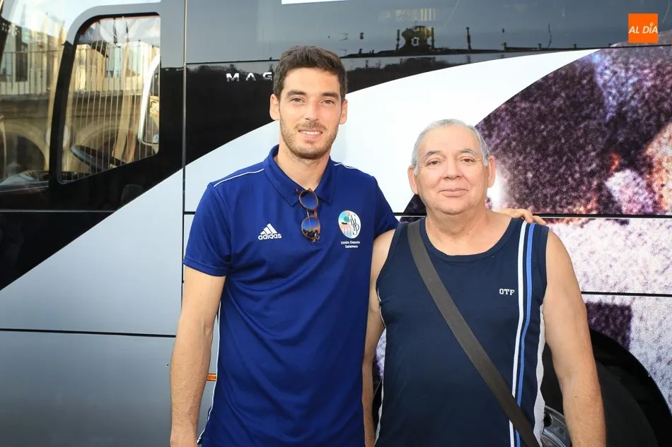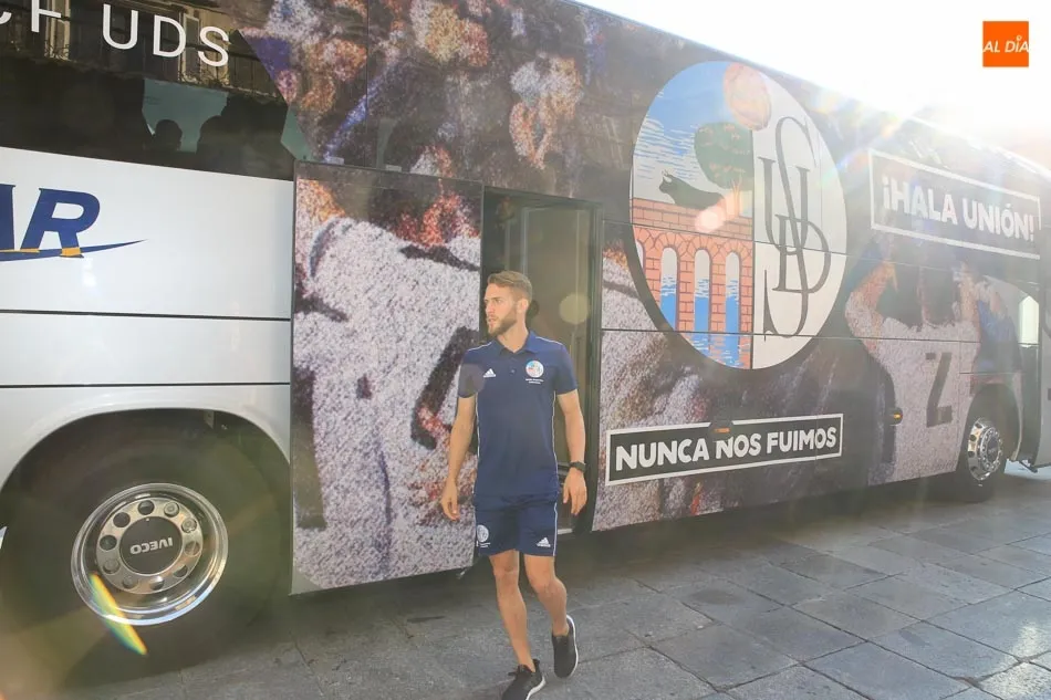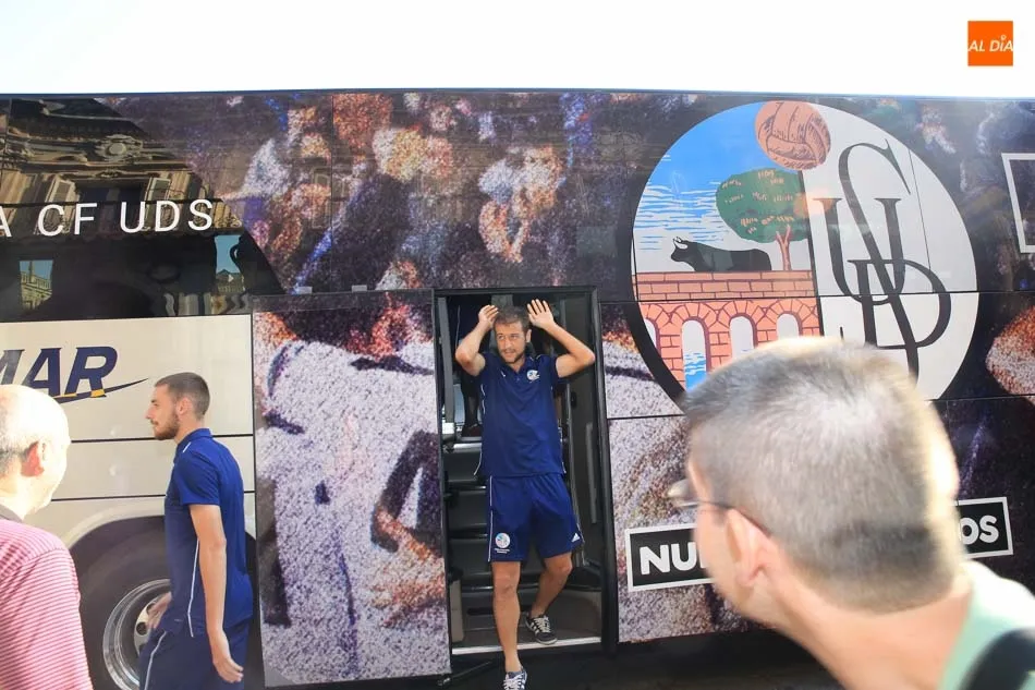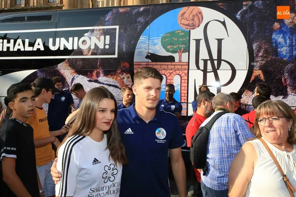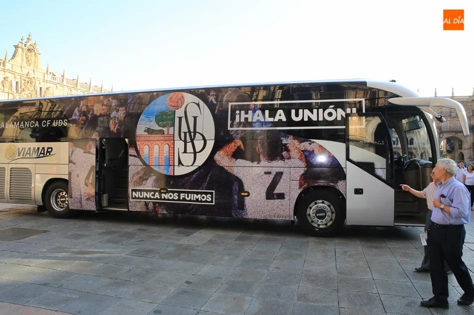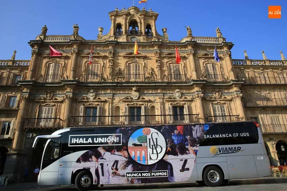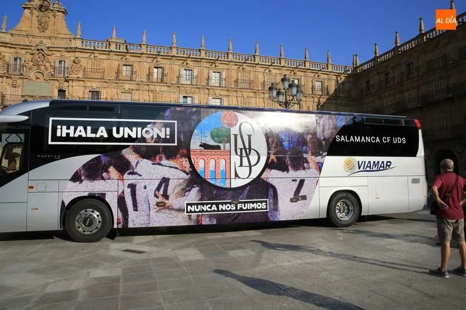 Como si de una película se tratase, el Salamanca CF UDS ponía esta tarde de largo su nuevo autobús personalizado, un autobús donde la UDS cobra presencia con un enorme escudo lateral y donde luce también el cartel que ha servido de fondo de la campaña de abonados que ha permitido al club sobrepasar ya el pasado lunes los 4.350. El vehículo fue a recoger a la plantilla y miembros de los distintos estamentos del club al Estadio Helmántico y desde allí se trasladaron hasta la Plaza Mayor, donde algunos seguidores y algunos curiosos se acercaron a saludar a los futbolistas mientras otros observaban desde lejos o a su paso el autobús que recorrerá toda España para llevar al primer equipo blanquinegro en esta andadura en Segunda B tras el brillante ascenso logrado la temporada pasada.